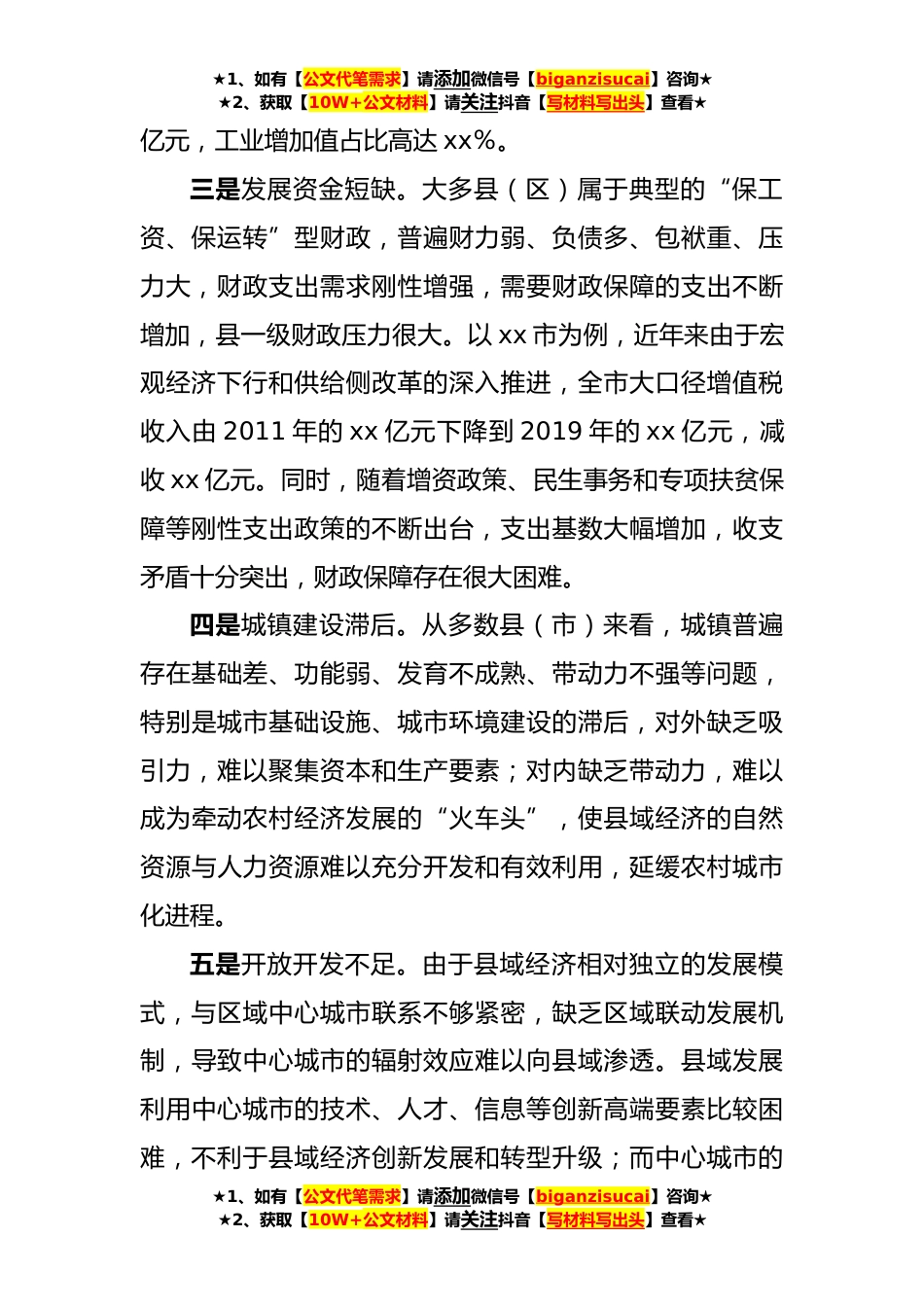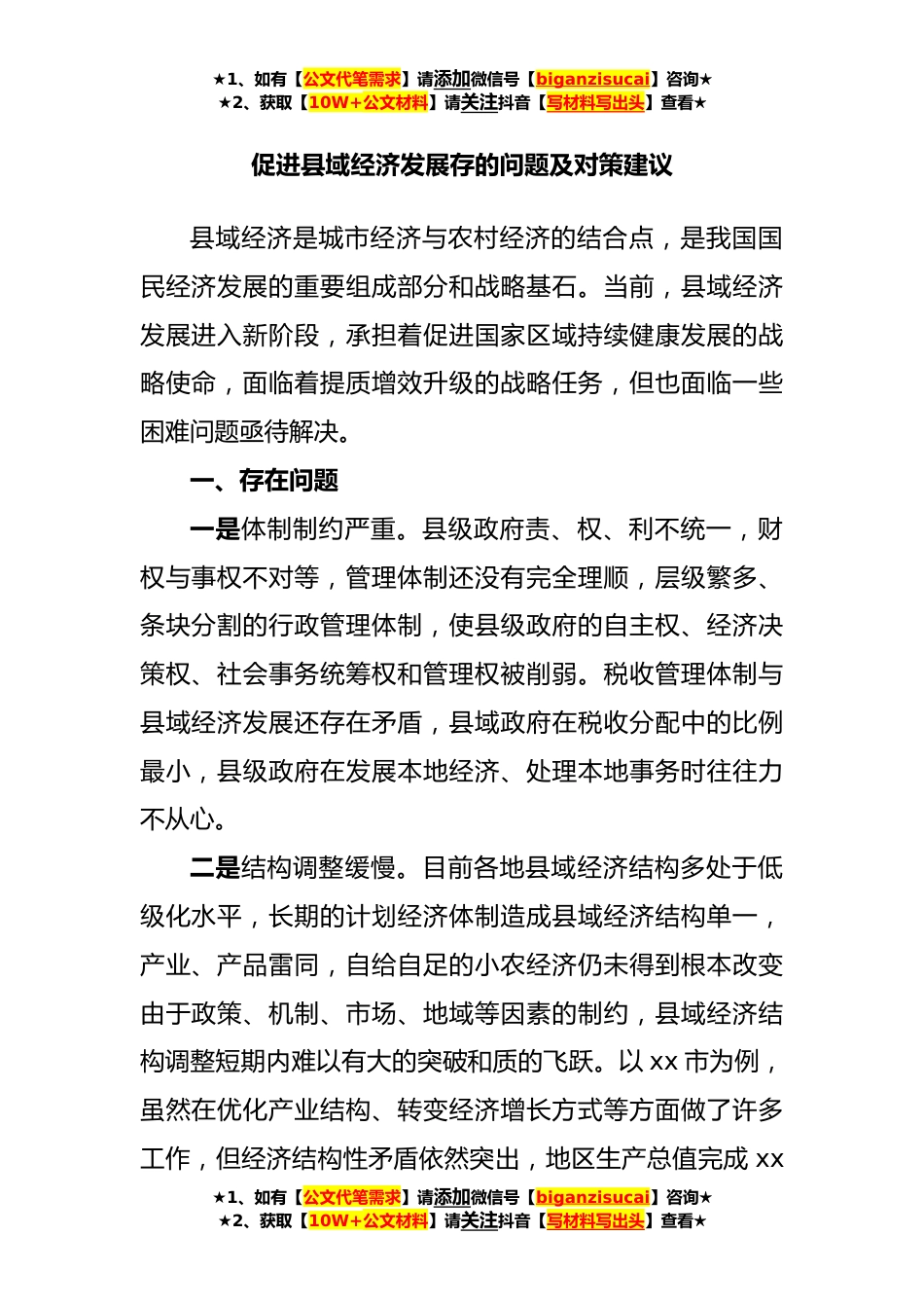 ★1、如有【公文代笔需求】请添加微信号【biganzisucai】咨询★★2、获取【10W+公文材料】请关注抖音【写材料写出头】查看★促进县域经济发展存的问题及对策建议县域经济是城市经济与农村经济的结合点,是我国国民经济发展的重要组成部分和战略基石。当前,县域经济发展进入新阶段,承担着促进国家区域持续健康发展的战略使命,面临着提质增效升级的战略任务,但也面临一些困难问题亟待解决。一、存在问题一是体制制约严重。县级政府责、权、利不统一,财权与事权不对等,管理体制还没有完全理顺,层级繁多、条块分割的行政管理体制,使县级政府的自主权、经济决策权、社会事务统筹权和管理权被削弱。税收管理体制与县域经济发展还存在矛盾,县域政府在税收分配中的比例最小,县级政府在发展本地经济、处理本地事...