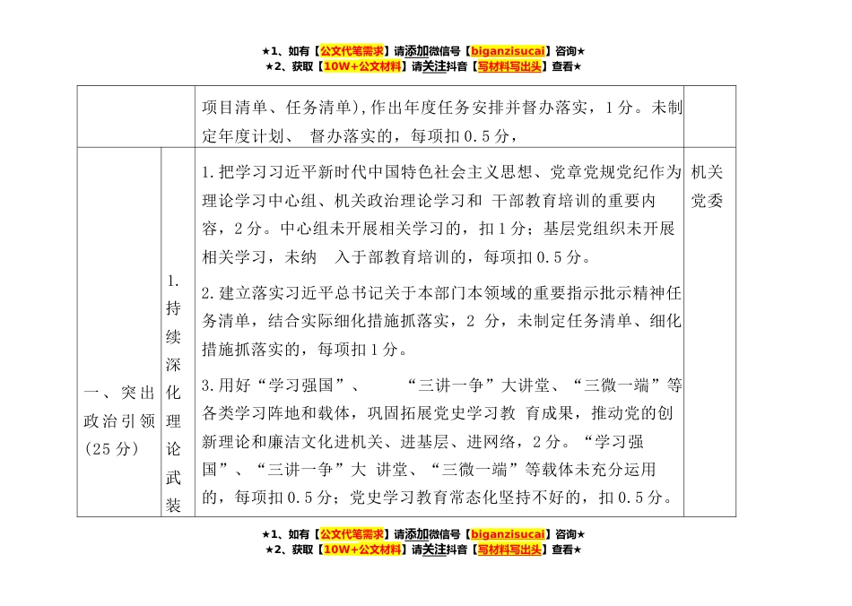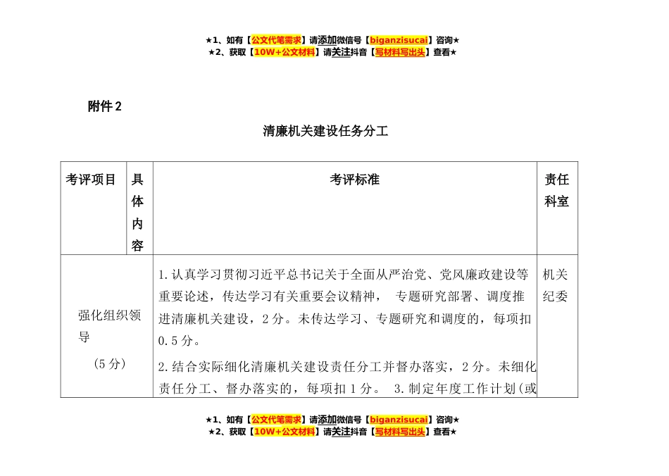 ★1、如有【公文代笔需求】请添加微信号【biganzisucai】咨询★★2、获取【10W+公文材料】请关注抖音【写材料写出头】查看★附件2清廉机关建设任务分工考评项目具体内容考评标准责任科室强化组织领导(5分)1.认真学习贯彻习近平总书记关于全面从严治党、党风廉政建设等重要论述,传达学习有关重要会议精神,专题研究部署、调度推进清廉机关建设,2分。未传达学习、专题研究和调度的,每项扣0.5分。2.结合实际细化清廉机关建设责任分工并督办落实,2分。未细化责任分工、督办落实的,每项扣1分。3.制定年度工作计划(或机关纪委★1、如有【公文代笔需求】请添加微信号【biganzisucai】咨询★★2、获取【10W+公文材料】请关注抖音【写材料写出头】查看★★1、如有【公文代笔需求】请添加微信号【biganzisucai】咨询★...