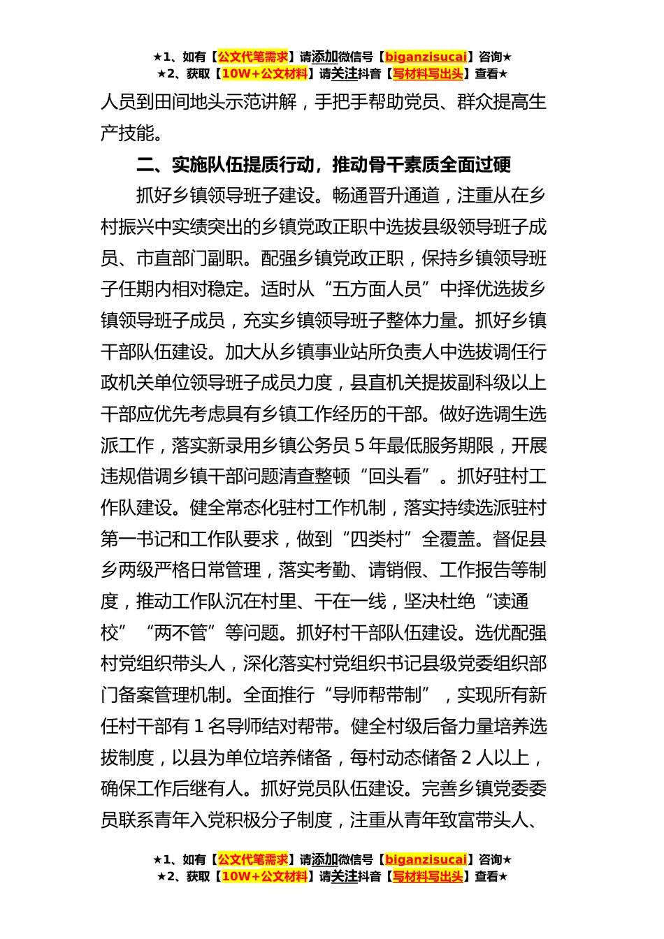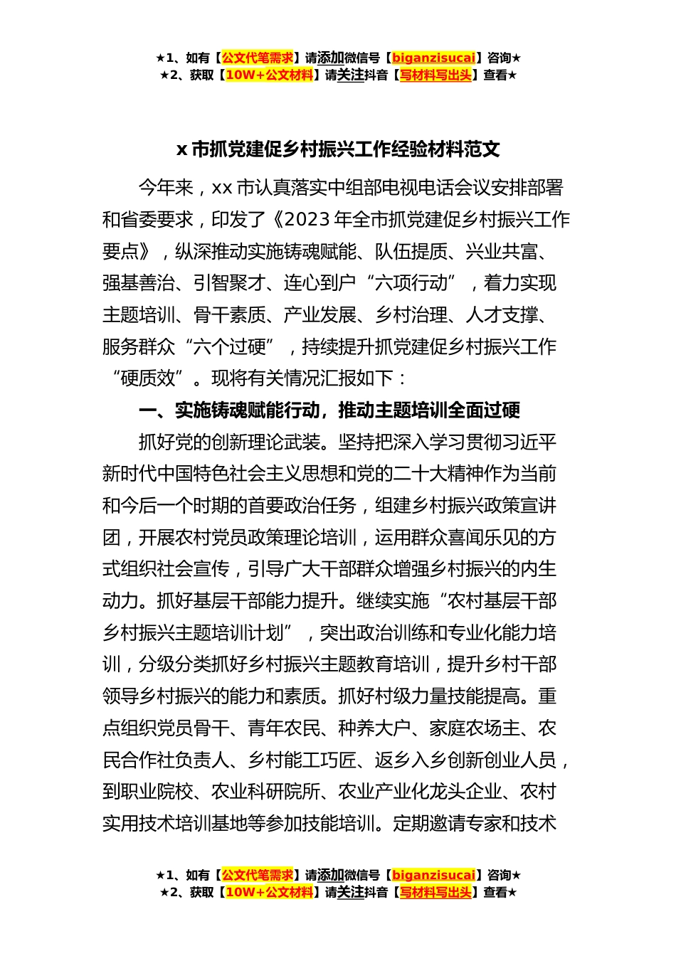 ★1、如有【公文代笔需求】请添加微信号【biganzisucai】咨询★★2、获取【10W+公文材料】请关注抖音【写材料写出头】查看★x市抓党建促乡村振兴工作经验材料范文今年来,xx市认真落实中组部电视电话会议安排部署和省委要求,印发了《2023年全市抓党建促乡村振兴工作要点》,纵深推动实施铸魂赋能、队伍提质、兴业共富、强基善治、引智聚才、连心到户“六项行动”,着力实现主题培训、骨干素质、产业发展、乡村治理、人才支撑、服务群众“六个过硬”,持续提升抓党建促乡村振兴工作“硬质效”。现将有关情况汇报如下:一、实施铸魂赋能行动,推动主题培训全面过硬抓好党的创新理论武装。坚持把深入学习贯彻习近平新时代中国特色社会主义思想和党的二十大精神作为当前和今后一个时期的首要政治任务,组建乡村振兴政...