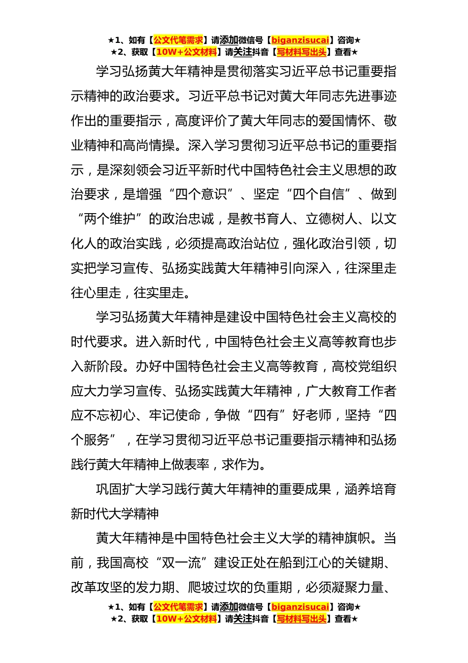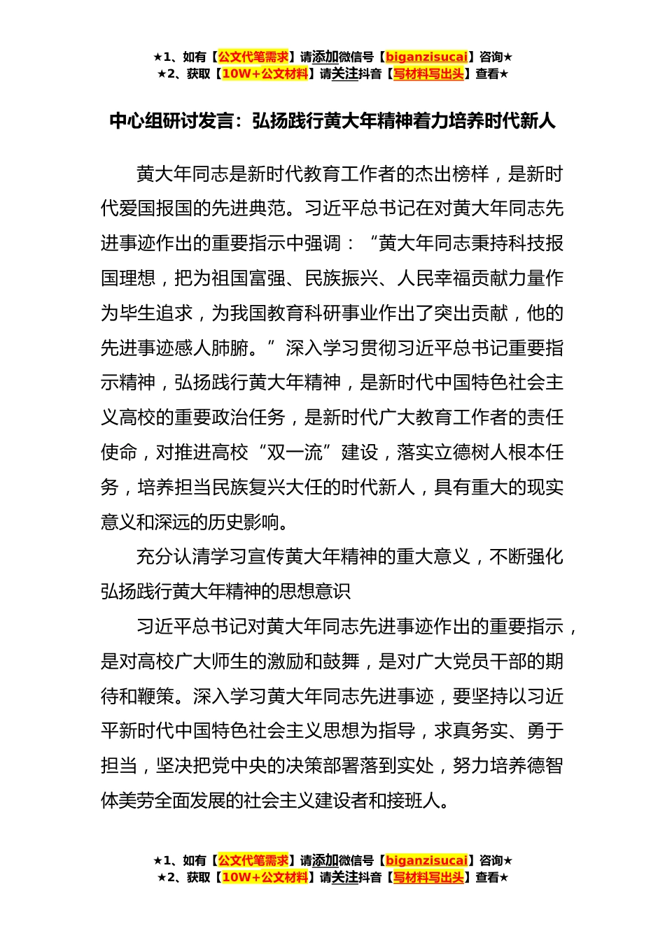 ★1、如有【公文代笔需求】请添加微信号【biganzisucai】咨询★★2、获取【10W+公文材料】请关注抖音【写材料写出头】查看★中心组研讨发言:弘扬践行黄大年精神着力培养时代新人黄大年同志是新时代教育工作者的杰出榜样,是新时代爱国报国的先进典范。习近平总书记在对黄大年同志先进事迹作出的重要指示中强调:“黄大年同志秉持科技报国理想,把为祖国富强、民族振兴、人民幸福贡献力量作为毕生追求,为我国教育科研事业作出了突出贡献,他的先进事迹感人肺腑。”深入学习贯彻习近平总书记重要指示精神,弘扬践行黄大年精神,是新时代中国特色社会主义高校的重要政治任务,是新时代广大教育工作者的责任使命,对推进高校“双一流”建设,落实立德树人根本任务,培养担当民族复兴大任的时代新人,具有重大的现实...