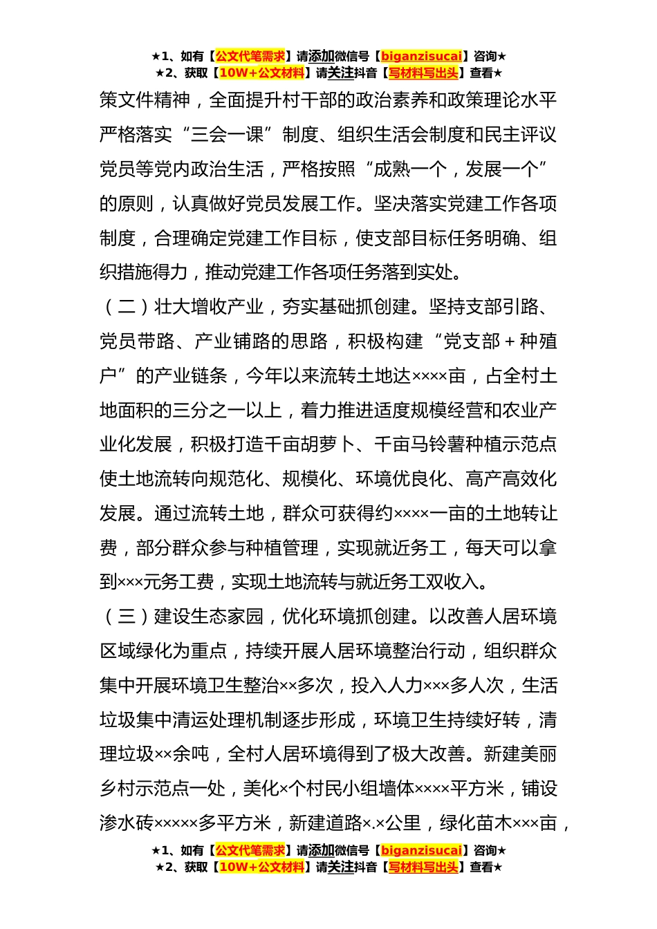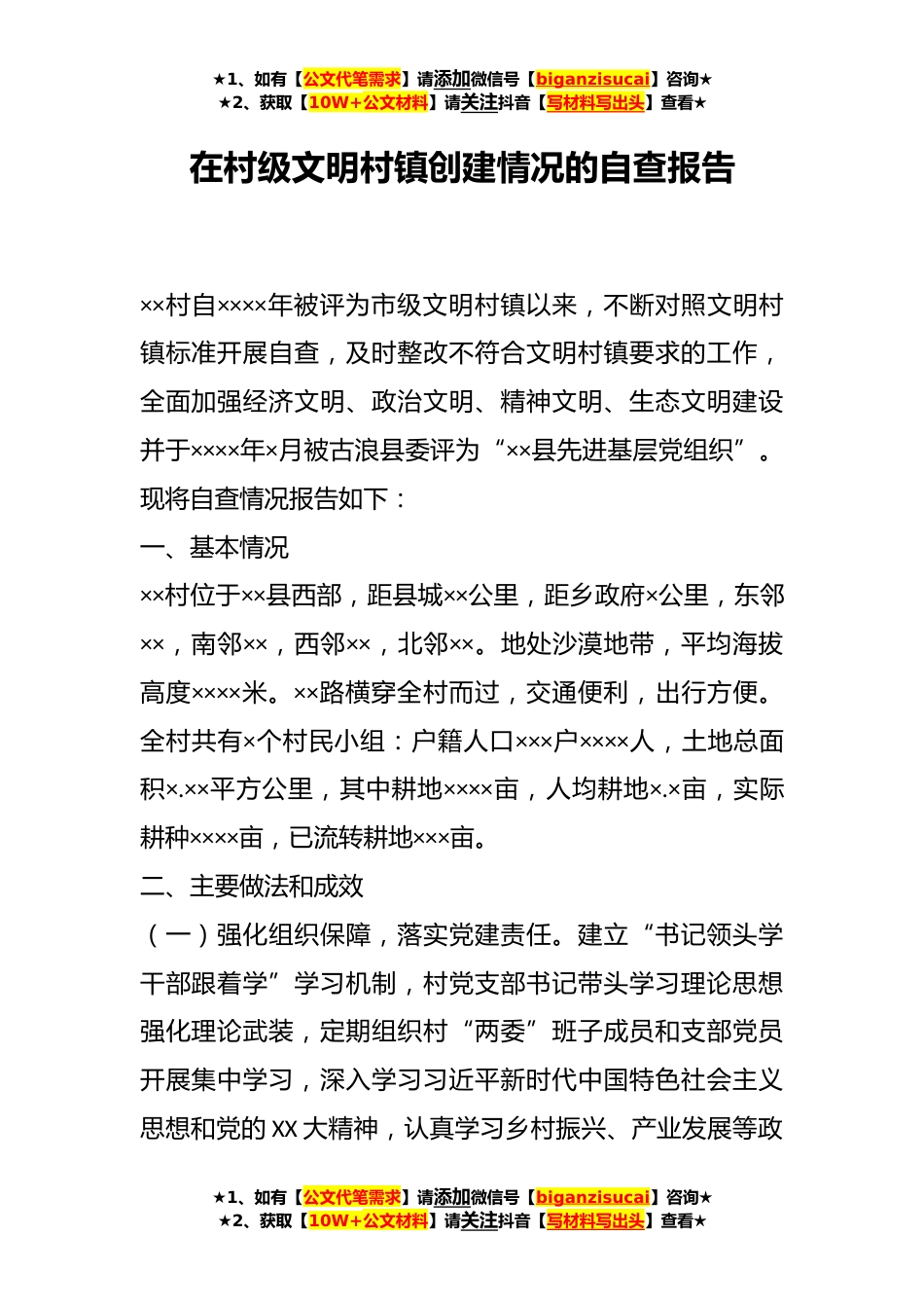 ★1、如有【公文代笔需求】请添加微信号【biganzisucai】咨询★★2、获取【10W+公文材料】请关注抖音【写材料写出头】查看★在村级文明村镇创建情况的自查报告××村自××××年被评为市级文明村镇以来,不断对照文明村镇标准开展自查,及时整改不符合文明村镇要求的工作,全面加强经济文明、政治文明、精神文明、生态文明建设并于××××年×月被古浪县委评为“××县先进基层党组织”。现将自查情况报告如下:一、基本情况××村位于××县西部,距县城××公里,距乡政府×公里,东邻××,南邻××,西邻××,北邻××。地处沙漠地带,平均海拔高度××××米。××路横穿全村而过,交通便利,出行方便。全村共有×个村民小组:户籍人口×××户××××人,土地总面积×.××平方公里,其中耕地××××亩...