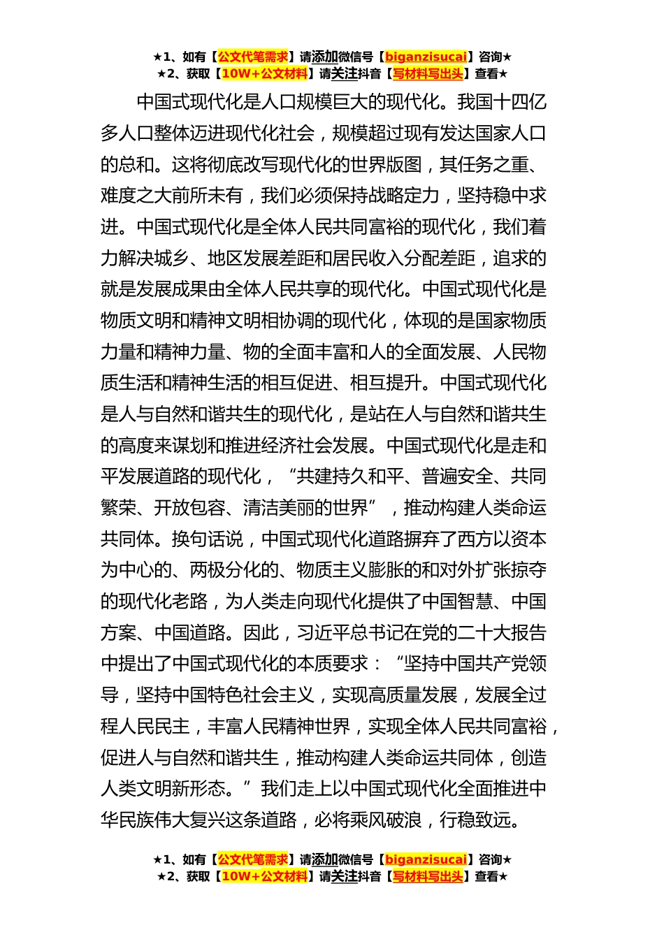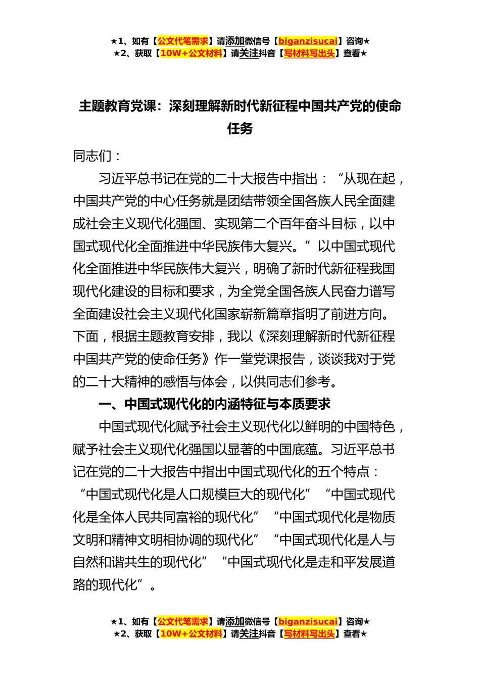 ★1、如有【公文代笔需求】请添加微信号【biganzisucai】咨询★★2、获取【10W+公文材料】请关注抖音【写材料写出头】查看★主题教育党课:深刻理解新时代新征程中国共产党的使命任务同志们:习近平总书记在党的二十大报告中指出:“从现在起,中国共产党的中心任务就是团结带领全国各族人民全面建成社会主义现代化强国、实现第二个百年奋斗目标,以中国式现代化全面推进中华民族伟大复兴。”以中国式现代化全面推进中华民族伟大复兴,明确了新时代新征程我国现代化建设的目标和要求,为全党全国各族人民奋力谱写全面建设社会主义现代化国家崭新篇章指明了前进方向。下面,根据主题教育安排,我以《深刻理解新时代新征程中国共产党的使命任务》作一堂党课报告,谈谈我对于党的二十大精神的感悟与体会,以供同志们...