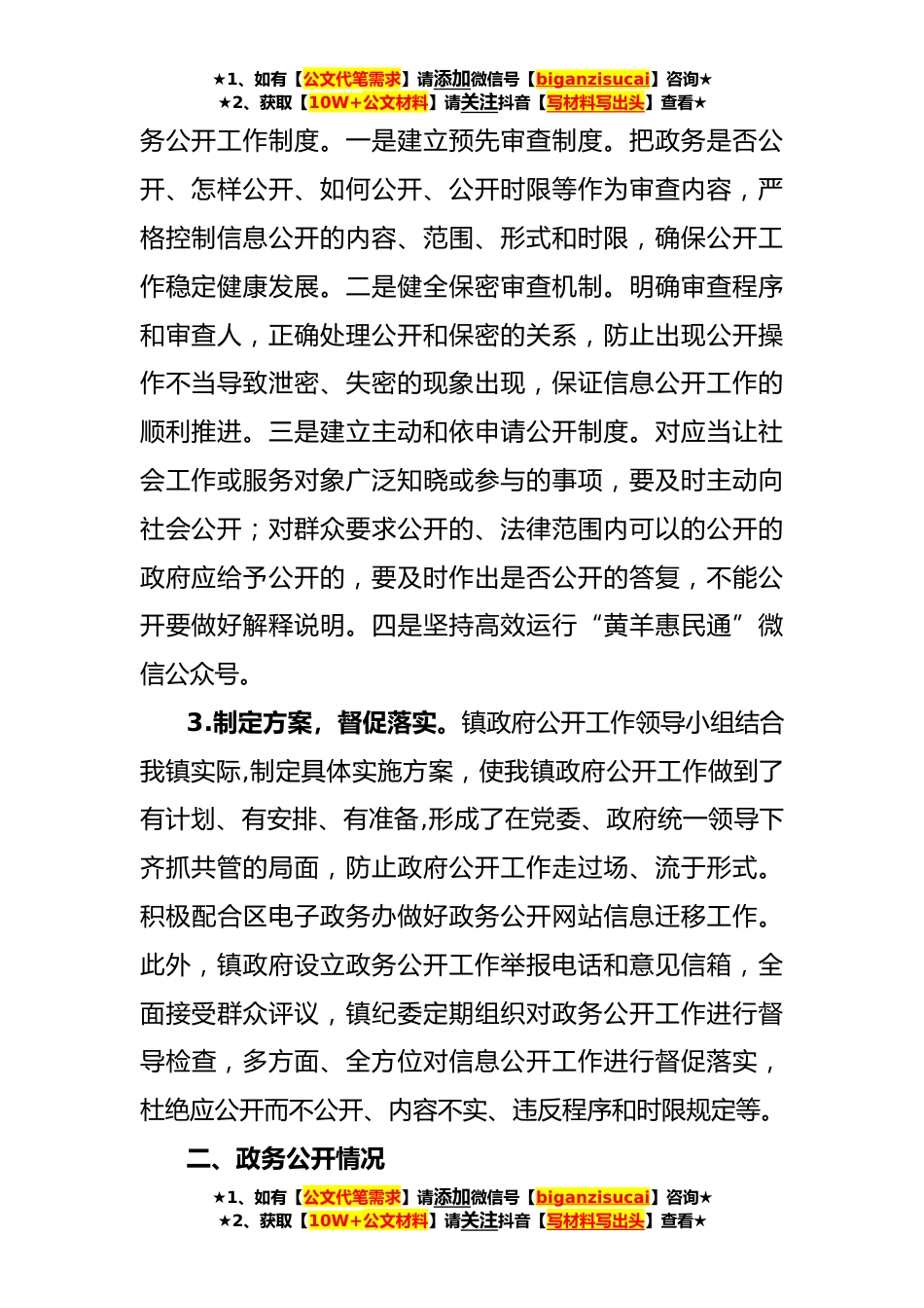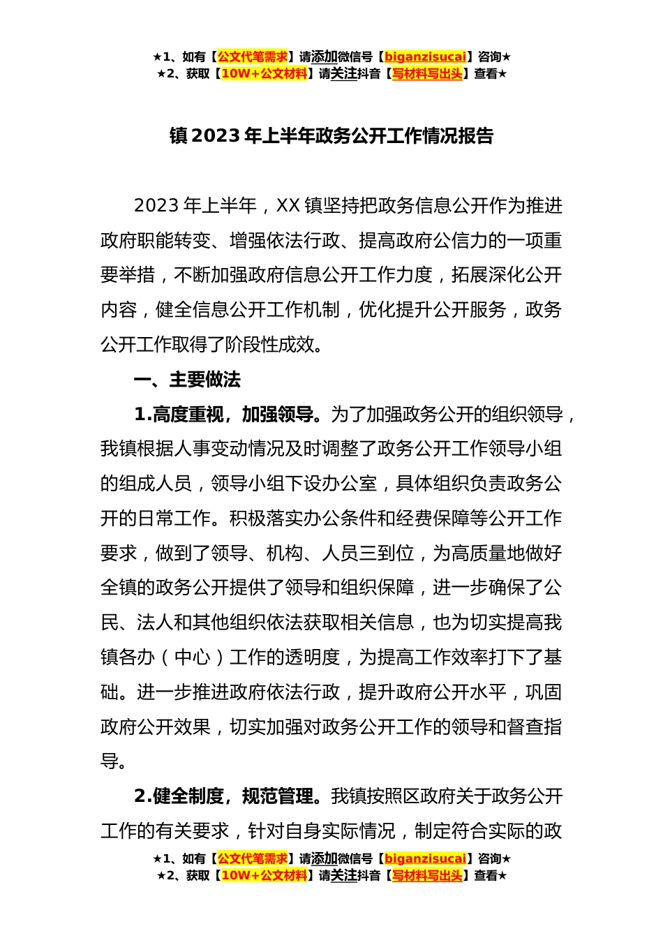 ★1、如有【公文代笔需求】请添加微信号【biganzisucai】咨询★★2、获取【10W+公文材料】请关注抖音【写材料写出头】查看★镇2023年上半年政务公开工作情况报告2023年上半年,XX镇坚持把政务信息公开作为推进政府职能转变、增强依法行政、提高政府公信力的一项重要举措,不断加强政府信息公开工作力度,拓展深化公开内容,健全信息公开工作机制,优化提升公开服务,政务公开工作取得了阶段性成效。一、主要做法1.高度重视,加强领导。为了加强政务公开的组织领导,我镇根据人事变动情况及时调整了政务公开工作领导小组的组成人员,领导小组下设办公室,具体组织负责政务公开的日常工作。积极落实办公条件和经费保障等公开工作要求,做到了领导、机构、人员三到位,为高质量地做好全镇的政务公开提供了领导和组织...