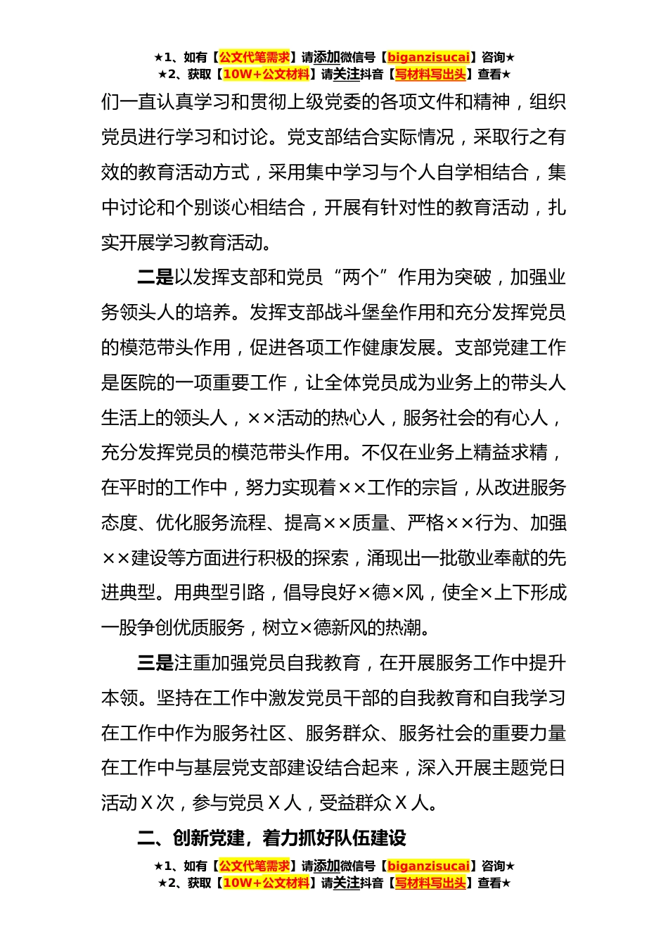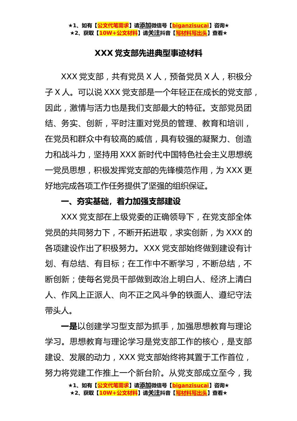 ★1、如有【公文代笔需求】请添加微信号【biganzisucai】咨询★★2、获取【10W+公文材料】请关注抖音【写材料写出头】查看★XXX党支部先进典型事迹材料XXX党支部,共有党员X人,预备党员X人,积极分子X人。可以说XXX党支部是一个年轻正在成长的党支部,因此,激情与活力也是我们支部最大的特征。支部党员团结、务实、创新,平时注重对党员的管理、教育和培训,在党员和群众中有较高的威信,具有较强的凝聚力、创造力和战斗力,坚持用XXX新时代中国特色社会主义思想统一党员思想,积极发挥党支部的先锋模范作用,为XXX更好地完成各项工作任务提供了坚强的组织保证。一、夯实基础,着力加强支部建设XXX党支部在上级党委的正确领导下,在党支部全体党员的共同努力下,不断开拓进取,求实创新,为XXX的各项建设作出了...