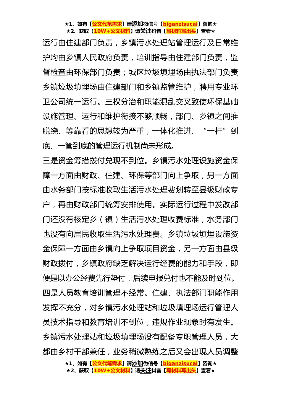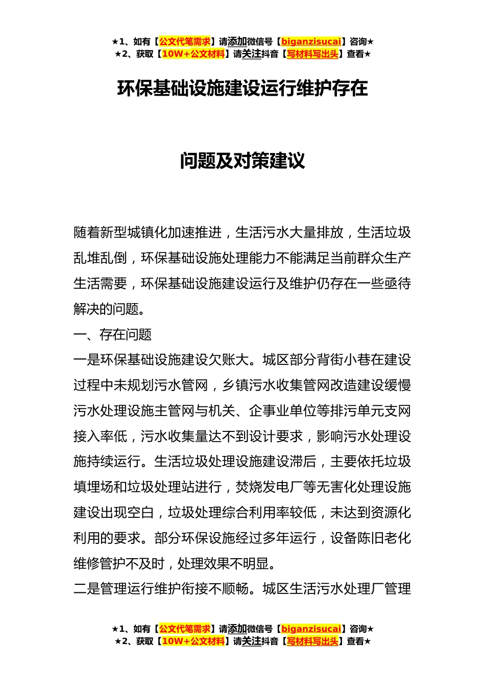 ★1、如有【公文代笔需求】请添加微信号【biganzisucai】咨询★★2、获取【10W+公文材料】请关注抖音【写材料写出头】查看★环保基础设施建设运行维护存在问题及对策建议随着新型城镇化加速推进,生活污水大量排放,生活垃圾乱堆乱倒,环保基础设施处理能力不能满足当前群众生产生活需要,环保基础设施建设运行及维护仍存在一些亟待解决的问题。一、存在问题一是环保基础设施建设欠账大。城区部分背街小巷在建设过程中未规划污水管网,乡镇污水收集管网改造建设缓慢污水处理设施主管网与机关、企事业单位等排污单元支网接入率低,污水收集量达不到设计要求,影响污水处理设施持续运行。生活垃圾处理设施建设滞后,主要依托垃圾填埋场和垃圾处理站进行,焚烧发电厂等无害化处理设施建设出现空白,垃圾处理综合利用...