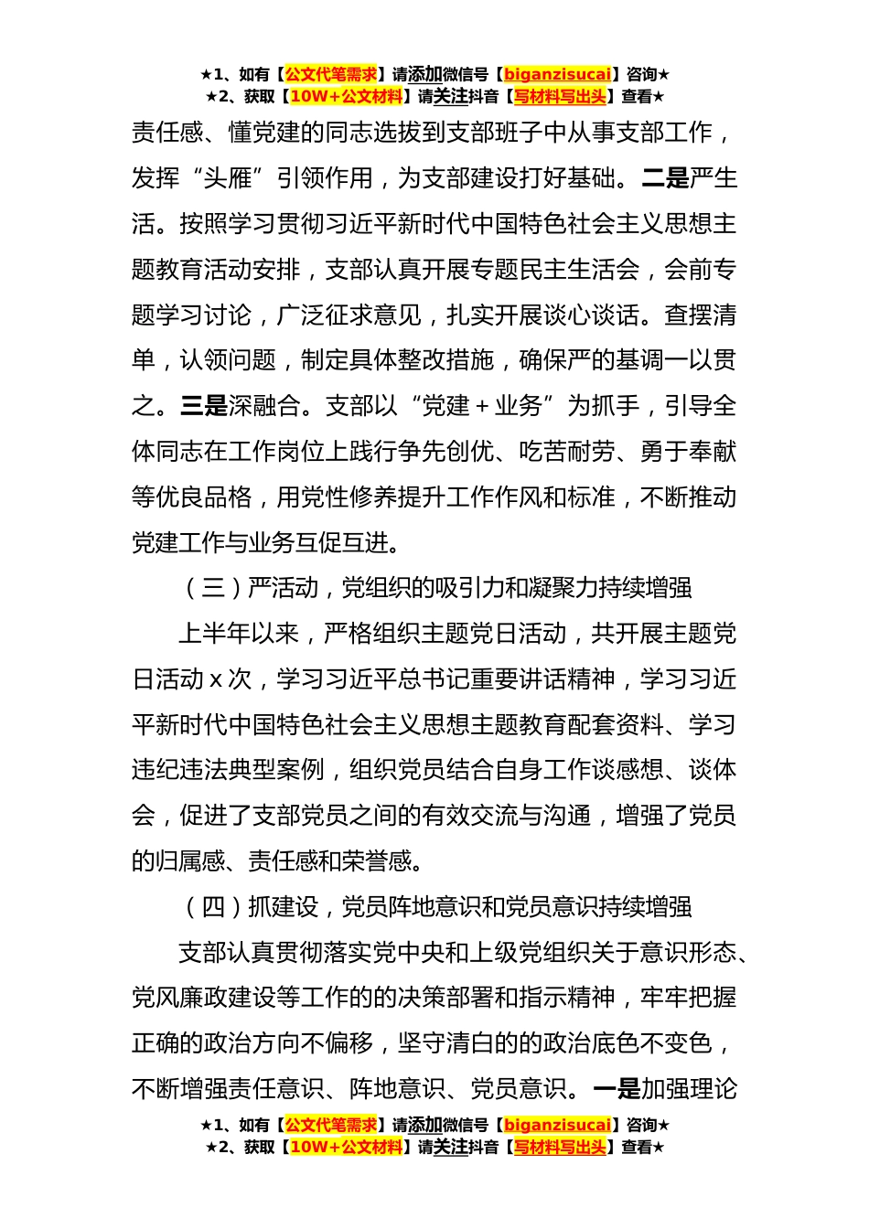 ★1、如有【公文代笔需求】请添加微信号【biganzisucai】咨询★★2、获取【10W+公文材料】请关注抖音【写材料写出头】查看★2023年上半年党建工作总结2023年上半年,xxx党支部在党委的坚强领导下,在机关党办的指导下,深入学习贯彻习近平新时代中国特色社会主义思想,深入开展学习贯彻习近平新时代中国特色社会主义思想主题教育活动,全面推进支部党的思想、组织、作风、制度和反腐倡廉建设。一、上半年党建工作开展情况(一)强思想,党员理论水平和政治素养持续提高一是严格落实“三会一课”制度。截止到x月底,共组织集中学习x次,党员大会x、次,支委会x次,讲党课x次。在理论学习中,集中学习了习近平总书记系列讲话精神、习近平新时代中国特色社会主义思想主题教育第一、第二、三专题学习材料,并组织党员...