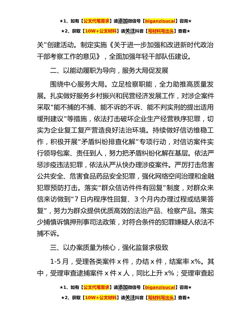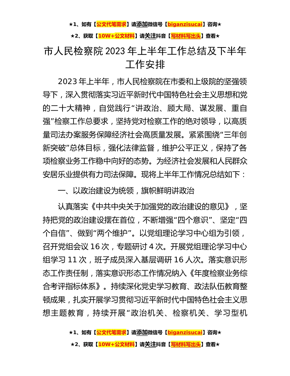 ★1、如有【公文代笔需求】请添加微信号【biganzisucai】咨询★★2、获取【10W+公文材料】请关注抖音【写材料写出头】查看★市人民检察院2023年上半年工作总结及下半年工作安排2023年上半年,市人民检察院在市委和上级院的坚强领导下,深入贯彻落实习近平新时代中国特色社会主义思想和党“的二十大精神,自觉践行讲政治、顾大局、谋发展、重自”强检察工作总要求,坚持党对检察工作的绝对领导,以高质“量司法办案服务保障经济社会高质量发展。紧紧围绕三年创”新突破总体目标,强化法律监督,维护公平正义,保持了各项检察业务工作稳中向好的态势。为经济社会发展和人民群众安居乐业提供有力司法保障。现将上半年工作情况总结如下:一、以政治建设为统领,旗帜鲜明讲政治认真落实《中共中央关于加强党的政治建设...