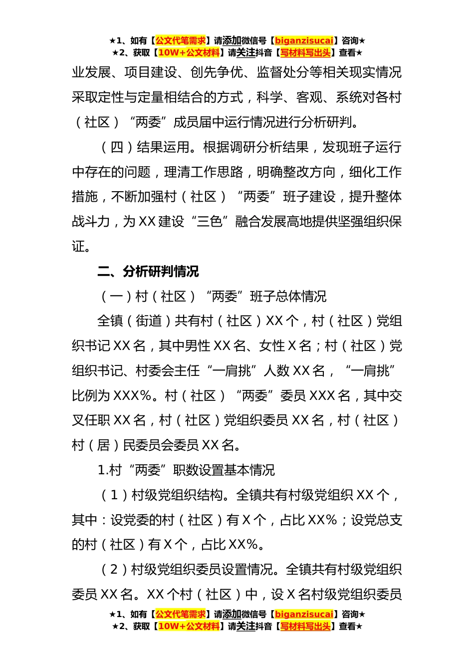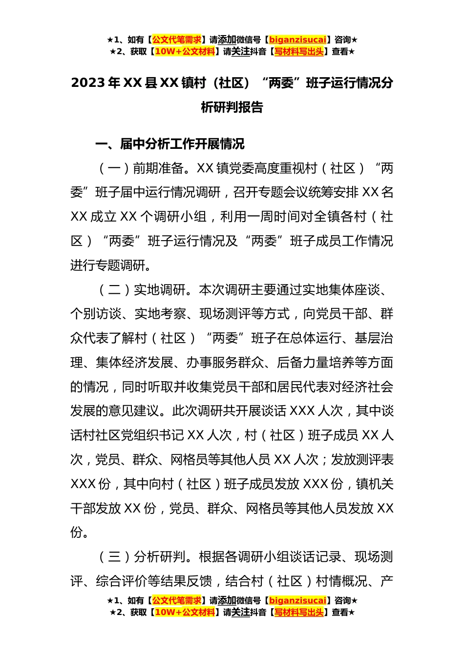 ★1、如有【公文代笔需求】请添加微信号【biganzisucai】咨询★★2、获取【10W+公文材料】请关注抖音【写材料写出头】查看★2023年XX县XX镇村(社区)“两委”班子运行情况分析研判报告一、届中分析工作开展情况(一)前期准备。XX镇党委高度重视村(社区)“两委”班子届中运行情况调研,召开专题会议统筹安排XX名XX成立XX个调研小组,利用一周时间对全镇各村(社区)“两委”班子运行情况及“两委”班子成员工作情况进行专题调研。(二)实地调研。本次调研主要通过实地集体座谈、个别访谈、实地考察、现场测评等方式,向党员干部、群众代表了解村(社区)“两委”班子在总体运行、基层治理、集体经济发展、办事服务群众、后备力量培养等方面的情况,同时听取并收集党员干部和居民代表对经济社会发展的意见建议...