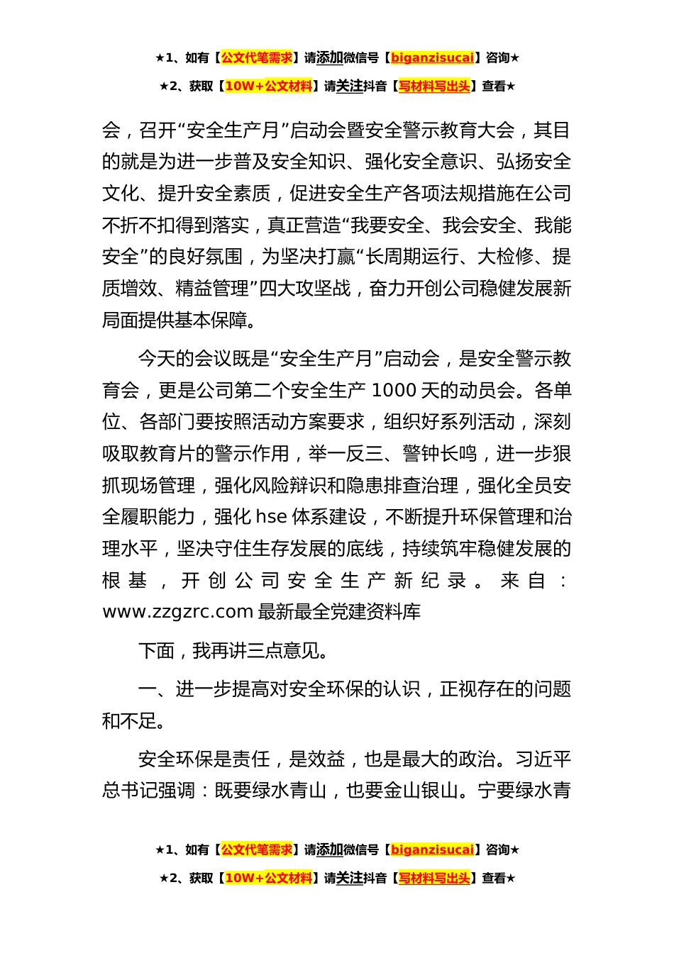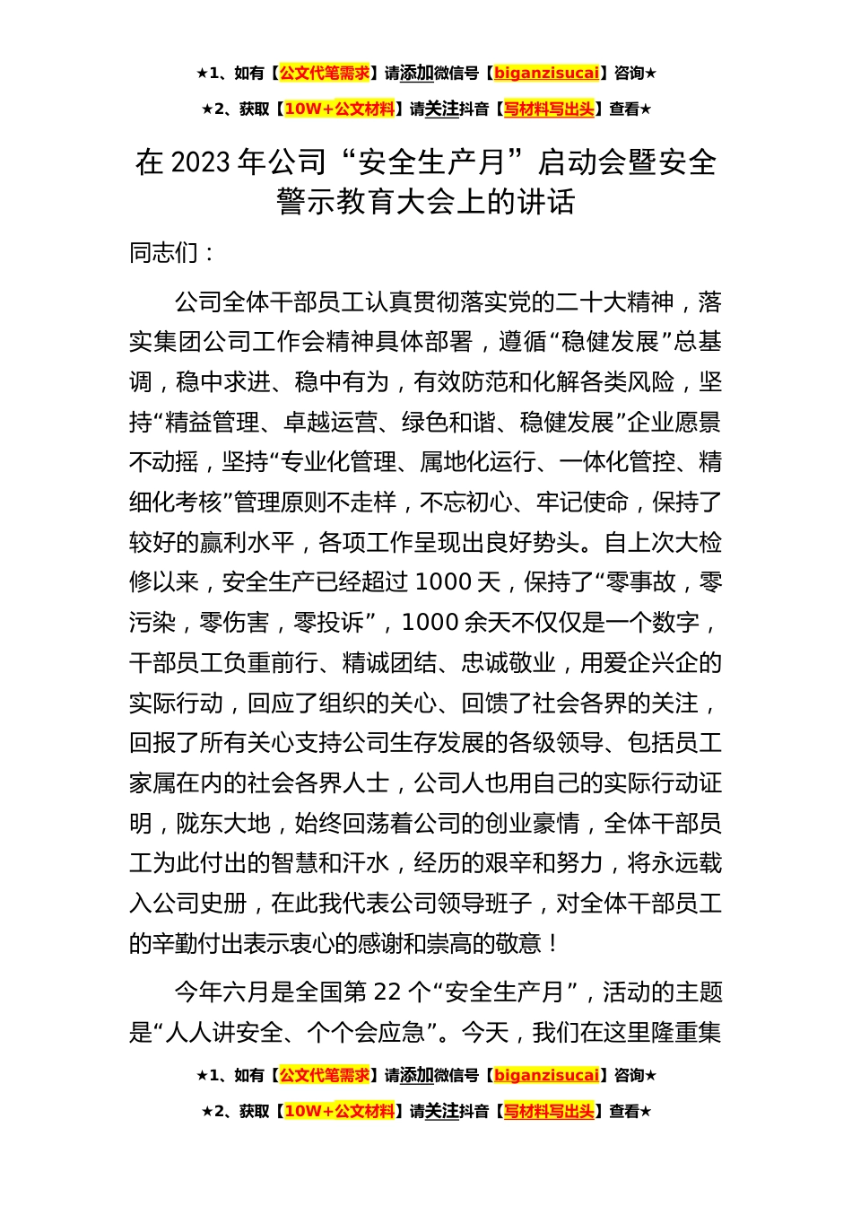 ★1、如有【公文代笔需求】请添加微信号【biganzisucai】咨询★★2、获取【10W+公文材料】请关注抖音【写材料写出头】查看★在2023年公司“安全生产月”启动会暨安全警示教育大会上的讲话同志们:公司全体干部员工认真贯彻落实党的二十大精神,落“”实集团公司工作会精神具体部署,遵循稳健发展总基调,稳中求进、稳中有为,有效防范和化解各类风险,坚“”持精益管理、卓越运营、绿色和谐、稳健发展企业愿景“不动摇,坚持专业化管理、属地化运行、一体化管控、精”细化考核管理原则不走样,不忘初心、牢记使命,保持了较好的赢利水平,各项工作呈现出良好势头。自上次大检修以来,安全生产已经超过1000“天,保持了零事故,零”污染,零伤害,零投诉,1000余天不仅仅是一个数字,干部员工负重前行、精诚团结、...