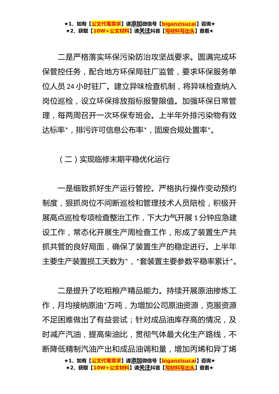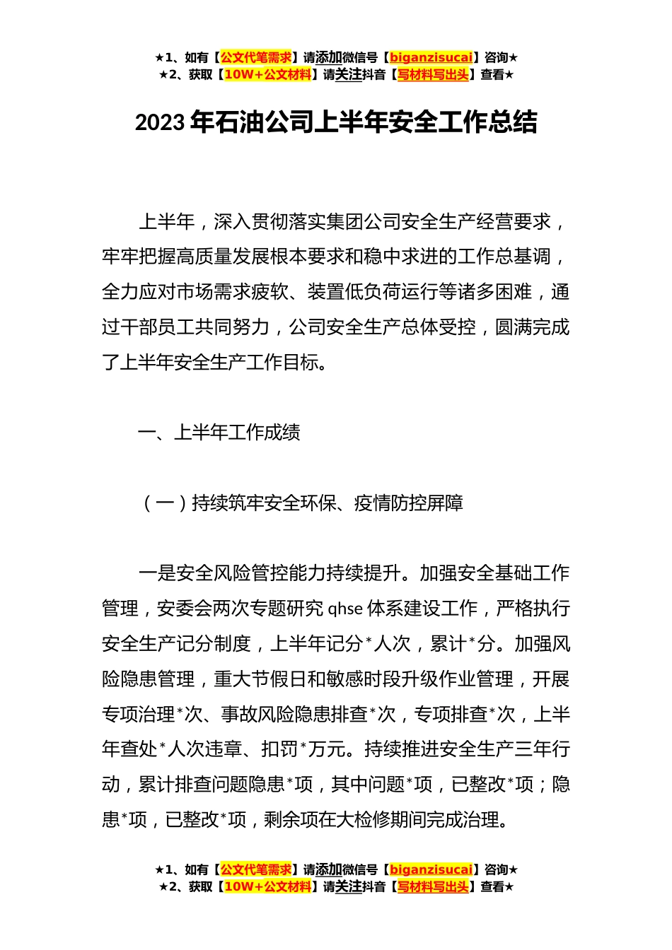 ★1、如有【公文代笔需求】请添加微信号【biganzisucai】咨询★★2、获取【10W+公文材料】请关注抖音【写材料写出头】查看★2023年石油公司上半年安全工作总结上半年,深入贯彻落实集团公司安全生产经营要求,牢牢把握高质量发展根本要求和稳中求进的工作总基调,全力应对市场需求疲软、装置低负荷运行等诸多困难,通过干部员工共同努力,公司安全生产总体受控,圆满完成了上半年安全生产工作目标。一、上半年工作成绩(一)持续筑牢安全环保、疫情防控屏障一是安全风险管控能力持续提升。加强安全基础工作管理,安委会两次专题研究qhse体系建设工作,严格执行安全生产记分制度,上半年记分*人次,累计*分。加强风险隐患管理,重大节假日和敏感时段升级作业管理,开展专项治理*次、事故风险隐患排查*次,专项排查*...