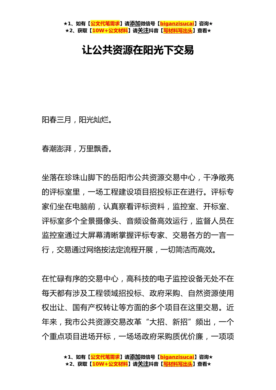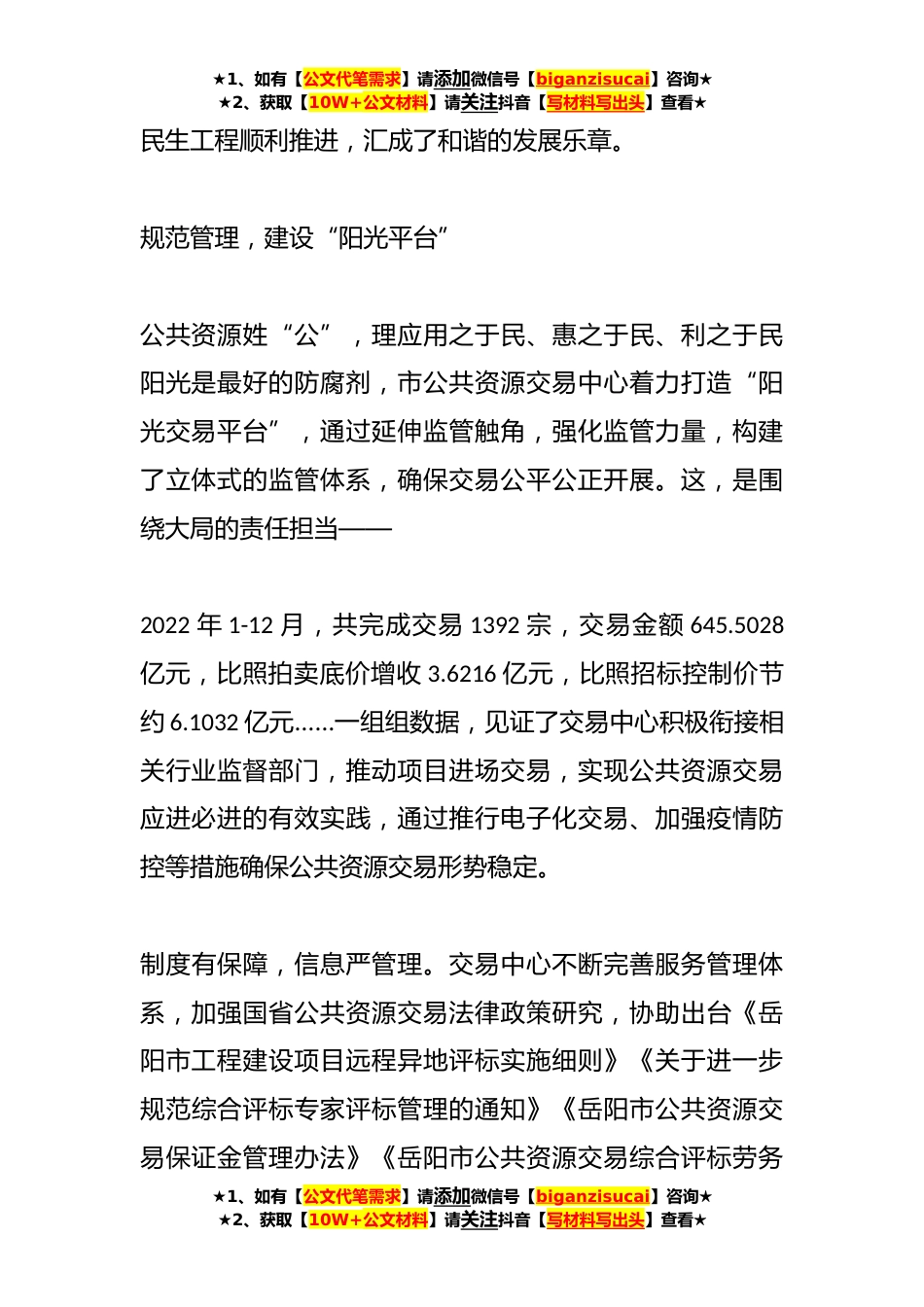 ★1、如有【公文代笔需求】请添加微信号【biganzisucai】咨询★★2、获取【10W+公文材料】请关注抖音【写材料写出头】查看★让公共资源在阳光下交易阳春三月,阳光灿烂。春潮澎湃,万里飘香。坐落在珍珠山脚下的岳阳市公共资源交易中心,干净敞亮的评标室里,一场工程建设项目招投标正在进行。评标专家们坐在电脑前,认真察看评标资料,监控室、开标室、评标室多个全景摄像头、音频设备高效运行,监督人员在监控室通过大屏幕清晰掌握评标专家、交易各方的一言一行,交易通过网络按法定流程开展,一切简洁而高效。在忙碌有序的交易中心,高科技的电子监控设备无处不在每天都有涉及工程领域招投标、政府采购、自然资源使用权出让、国有产权转让等方面的多个项目在这里交易。近年来,我市公共资源交易改革“大招、新...