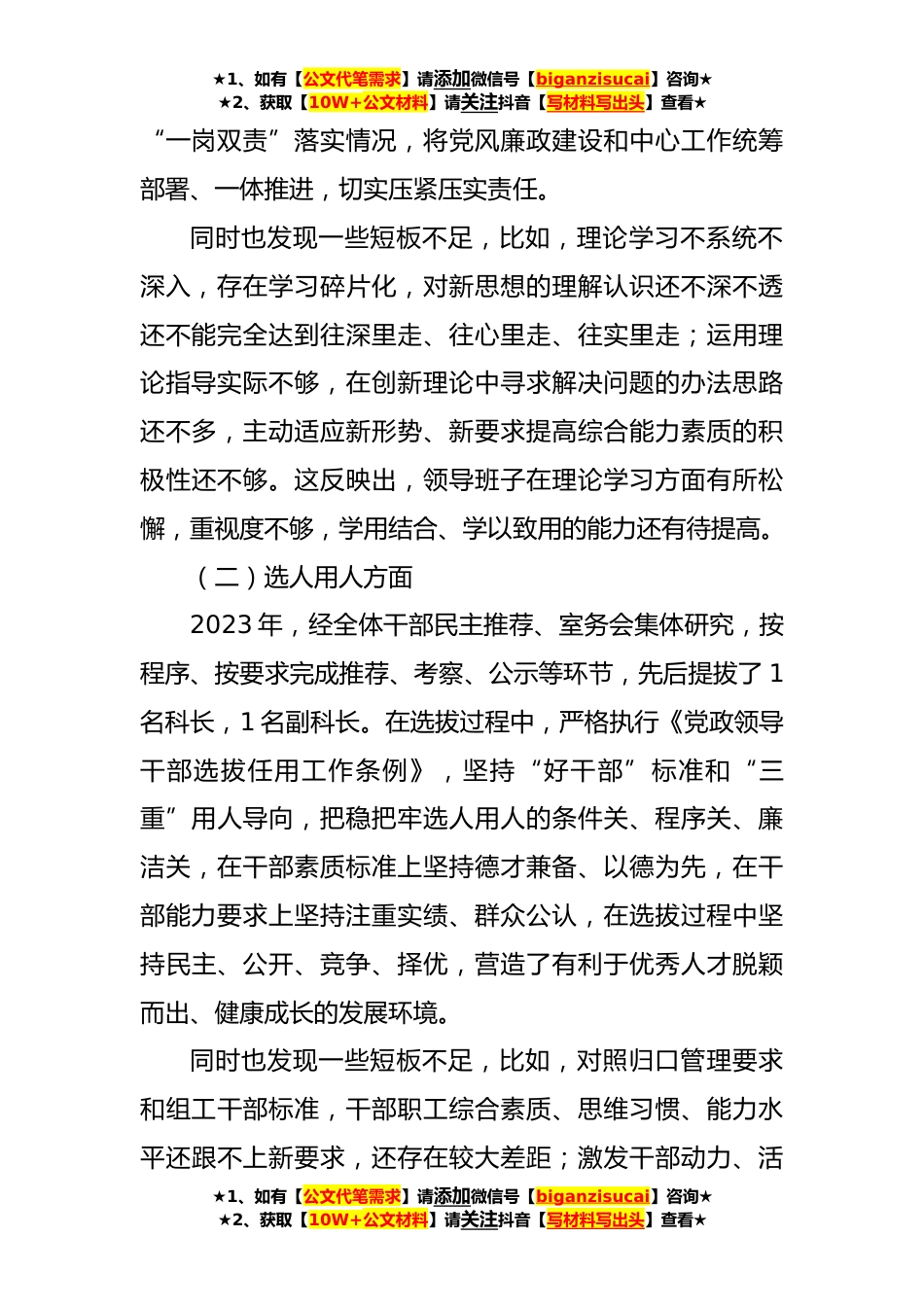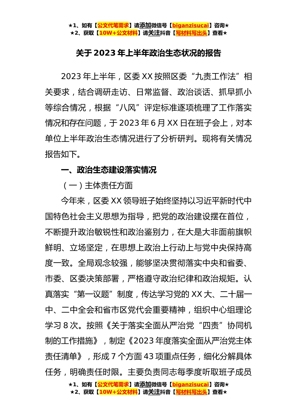 ★1、如有【公文代笔需求】请添加微信号【biganzisucai】咨询★★2、获取【10W+公文材料】请关注抖音【写材料写出头】查看★关于2023年上半年政治生态状况的报告2023年上半年,区委XX按照区委“九责工作法”相关要求,结合调研走访、日常监督、政治谈话、抓早抓小等综合情况,根据“八风”评定标准逐项梳理了工作落实情况和存在问题,于2023年6月XX日在班子会上,对本单位上半年政治生态情况进行了分析研判。现将有关情况报告如下。一、政治生态建设落实情况(一)主体责任方面今年来,区委XX领导班子始终坚持以习近平新时代中国特色社会主义思想为指导,把党的政治建设摆在首位,不断提升政治敏锐性和政治鉴别力,在大是大非面前旗帜鲜明、立场坚定,在思想上政治上行动上与党中央保持高度一致。全局观念较强,能...