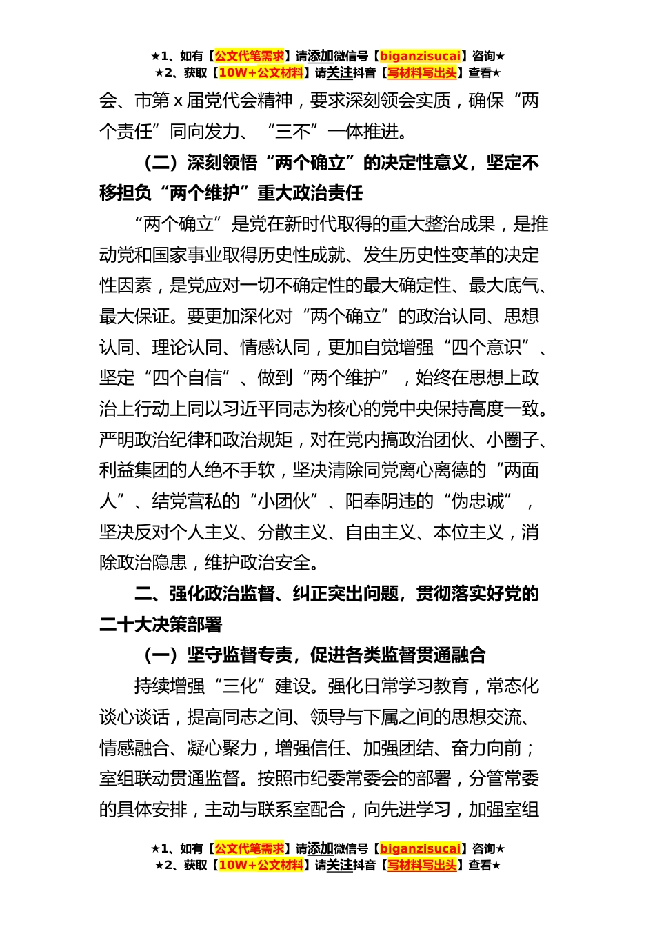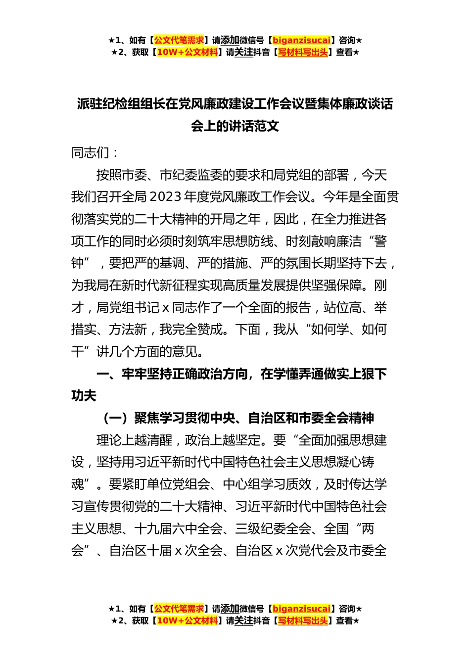 ★1、如有【公文代笔需求】请添加微信号【biganzisucai】咨询★★2、获取【10W+公文材料】请关注抖音【写材料写出头】查看★派驻纪检组组长在党风廉政建设工作会议暨集体廉政谈话会上的讲话范文同志们:按照市委、市纪委监委的要求和局党组的部署,今天我们召开全局2023年度党风廉政工作会议。今年是全面贯彻落实党的二十大精神的开局之年,因此,在全力推进各项工作的同时必须时刻筑牢思想防线、时刻敲响廉洁“警钟”,要把严的基调、严的措施、严的氛围长期坚持下去,为我局在新时代新征程实现高质量发展提供坚强保障。刚才,局党组书记x同志作了一个全面的报告,站位高、举措实、方法新,我完全赞成。下面,我从“如何学、如何干”讲几个方面的意见。一、牢牢坚持正确政治方向,在学懂弄通做实上狠下功夫(一)...