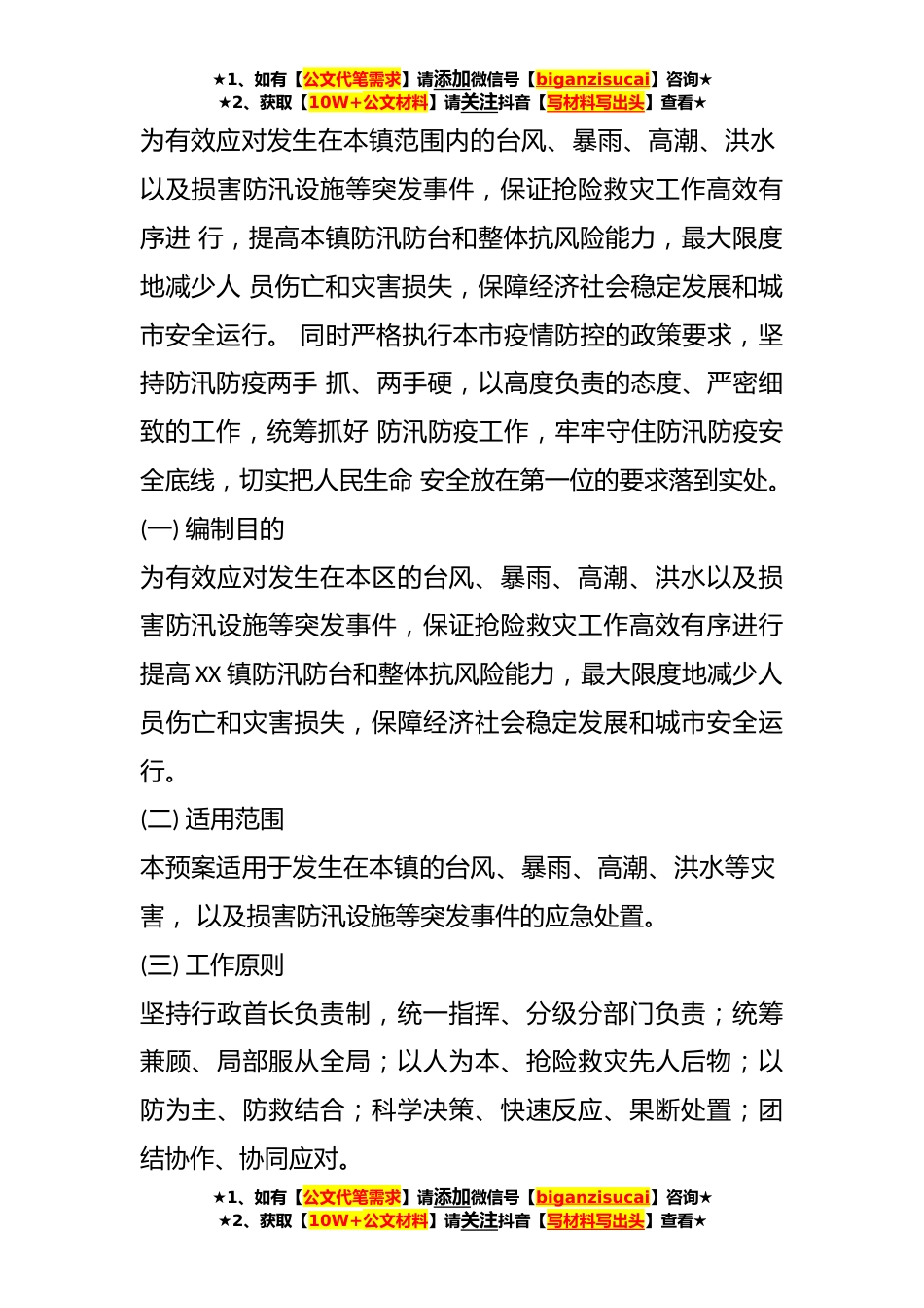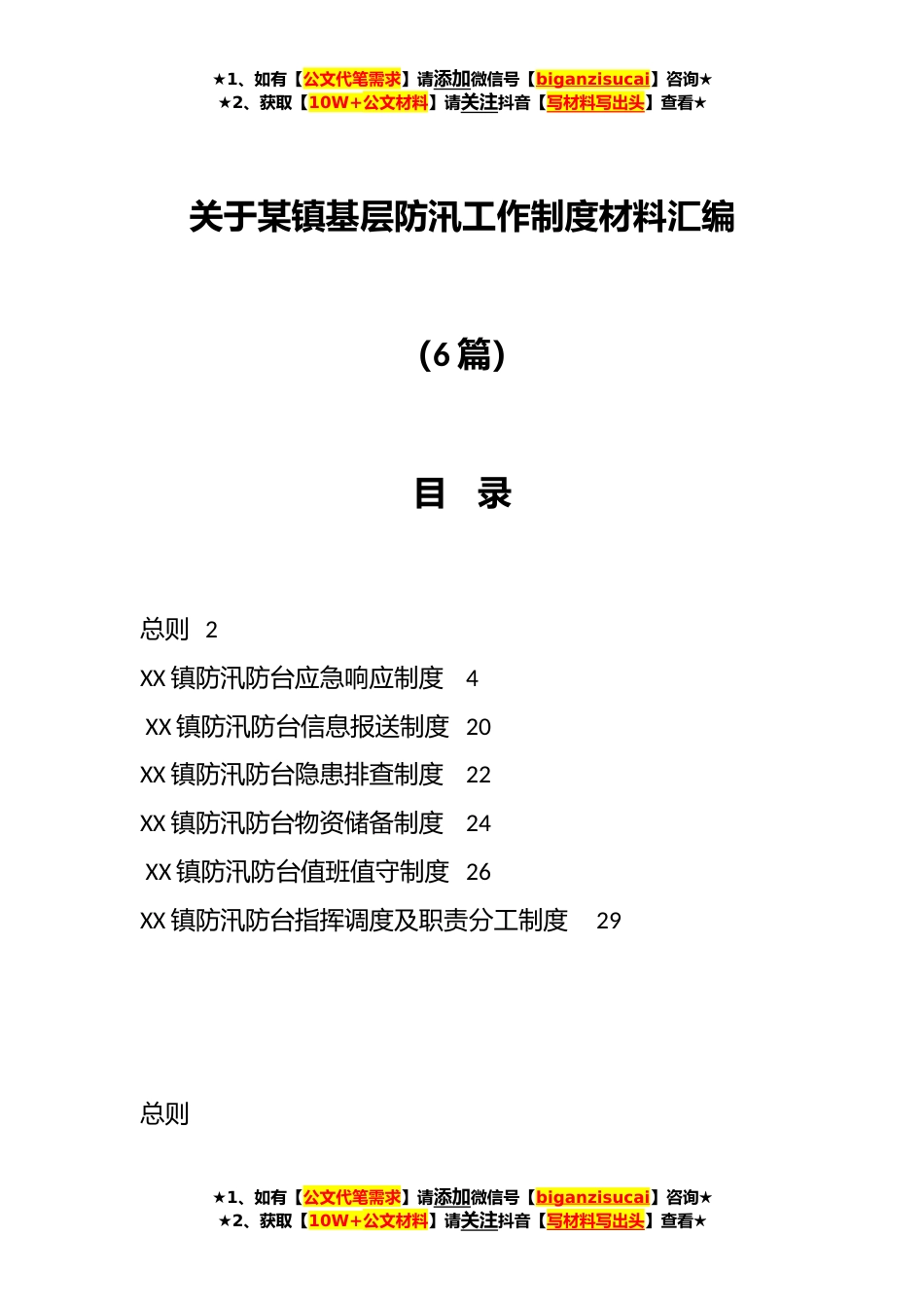 ★1、如有【公文代笔需求】请添加微信号【biganzisucai】咨询★★2、获取【10W+公文材料】请关注抖音【写材料写出头】查看★关于某镇基层防汛工作制度材料汇编(6篇)目录总则2XX镇防汛防台应急响应制度4XX镇防汛防台信息报送制度20XX镇防汛防台隐患排查制度22XX镇防汛防台物资储备制度24XX镇防汛防台值班值守制度26XX镇防汛防台指挥调度及职责分工制度29总则★1、如有【公文代笔需求】请添加微信号【biganzisucai】咨询★★2、获取【10W+公文材料】请关注抖音【写材料写出头】查看★★1、如有【公文代笔需求】请添加微信号【biganzisucai】咨询★★2、获取【10W+公文材料】请关注抖音【写材料写出头】查看★为有效应对发生在本镇范围内的台风、暴雨、高潮、洪水以及损害防汛设施等突发事件,保证抢险救灾工作高效...