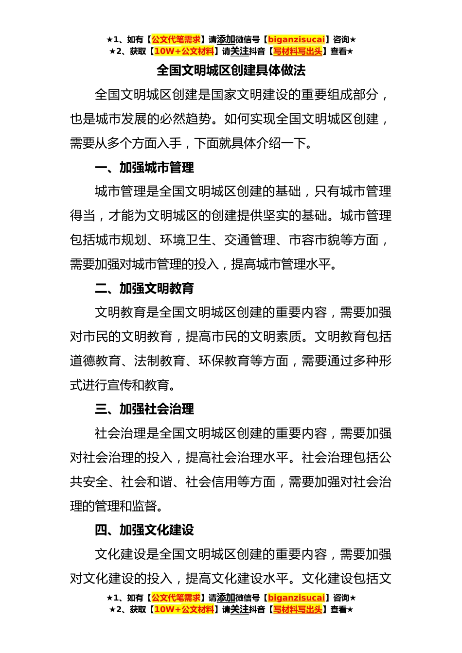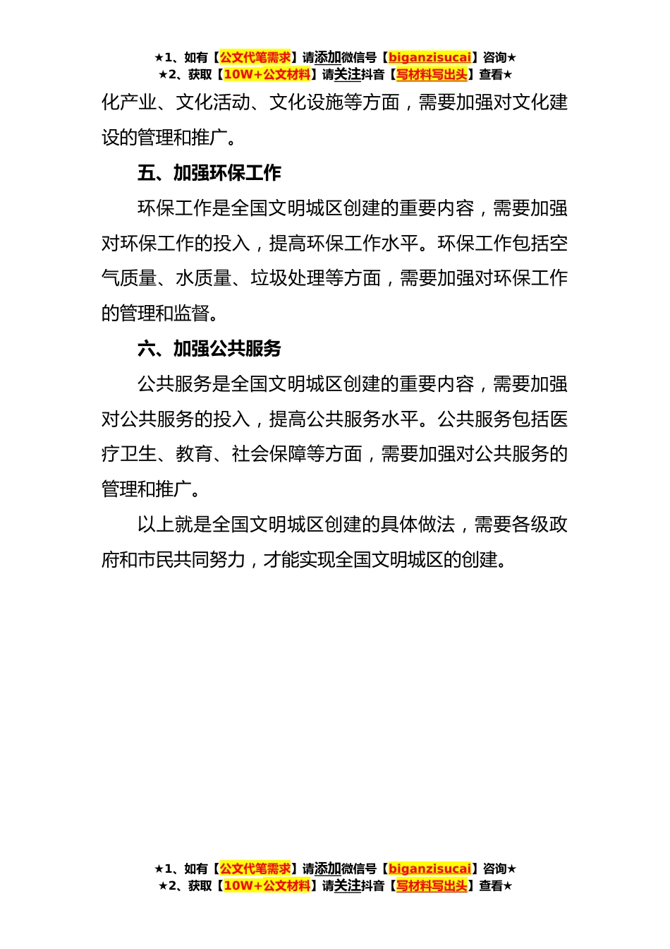 ★1、如有【公文代笔需求】请添加微信号【biganzisucai】咨询★★2、获取【10W+公文材料】请关注抖音【写材料写出头】查看★全国文明城区创建具体做法全国文明城区创建是国家文明建设的重要组成部分,也是城市发展的必然趋势。如何实现全国文明城区创建,需要从多个方面入手,下面就具体介绍一下。一、加强城市管理城市管理是全国文明城区创建的基础,只有城市管理得当,才能为文明城区的创建提供坚实的基础。城市管理包括城市规划、环境卫生、交通管理、市容市貌等方面,需要加强对城市管理的投入,提高城市管理水平。二、加强文明教育文明教育是全国文明城区创建的重要内容,需要加强对市民的文明教育,提高市民的文明素质。文明教育包括道德教育、法制教育、环保教育等方面,需要通过多种形式进行宣传和教育。...