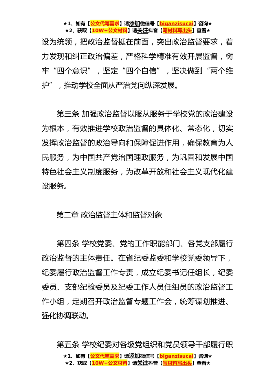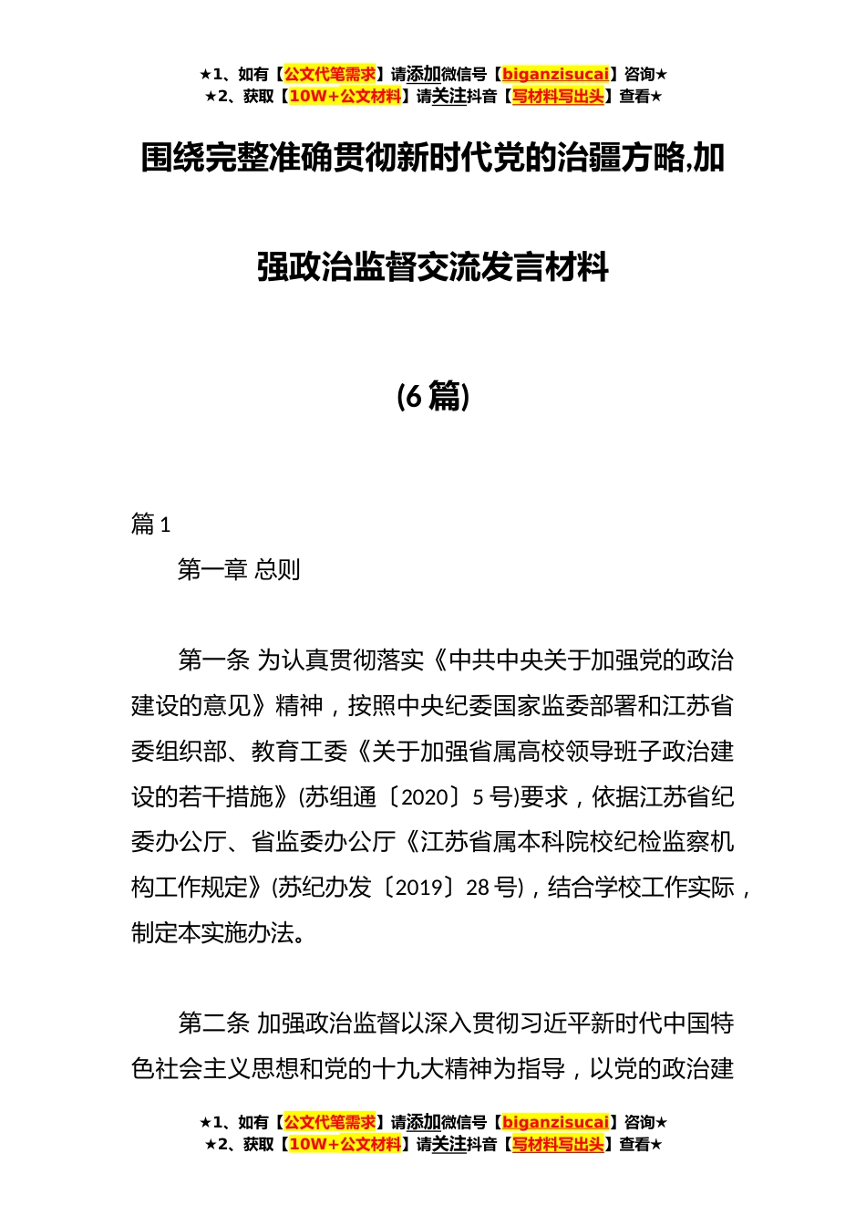 ★1、如有【公文代笔需求】请添加微信号【biganzisucai】咨询★★2、获取【10W+公文材料】请关注抖音【写材料写出头】查看★围绕完整准确贯彻新时代党的治疆方略,加强政治监督交流发言材料(6篇)篇1第一章总则第一条为认真贯彻落实《中共中央关于加强党的政治建设的意见》精神,按照中央纪委国家监委部署和江苏省委组织部、教育工委《关于加强省属高校领导班子政治建设的若干措施》(苏组通〔2020〕5号)要求,依据江苏省纪委办公厅、省监委办公厅《江苏省属本科院校纪检监察机构工作规定》(苏纪办发〔2019〕28号),结合学校工作实际,制定本实施办法。第二条加强政治监督以深入贯彻习近平新时代中国特色社会主义思想和党的十九大精神为指导,以党的政治建★1、如有【公文代笔需求】请添加微信号【biganzisucai】咨询...