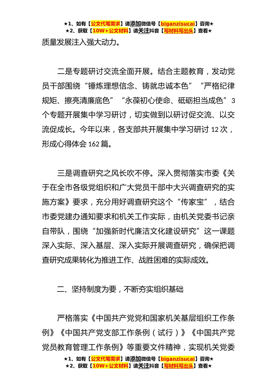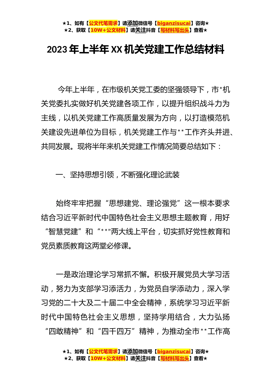 ★1、如有【公文代笔需求】请添加微信号【biganzisucai】咨询★★2、获取【10W+公文材料】请关注抖音【写材料写出头】查看★2023年上半年XX机关党建工作总结材料今年上半年,在市级机关党工委的坚强领导下,市*机关党委扎实做好机关党建各项工作,以提升组织战斗力为主线,以机关党建工作高质量发展为方向,以打造模范机关建设先进单位为目标,机关党建工作与**工作齐头并进、共同发展。现将半年来机关党建工作情况简要总结如下:一、坚持思想引领,不断强化理论武装始终牢牢把握“思想建党、理论强党”这一根本要求结合习近平新时代中国特色社会主义思想主题教育,用好“智慧党建”和“**”两大线上平台,切实抓好党性教育和党员素质教育这两堂必修课。一是政治理论学习常抓不懈。积极开展党员大学习活动,努力为...