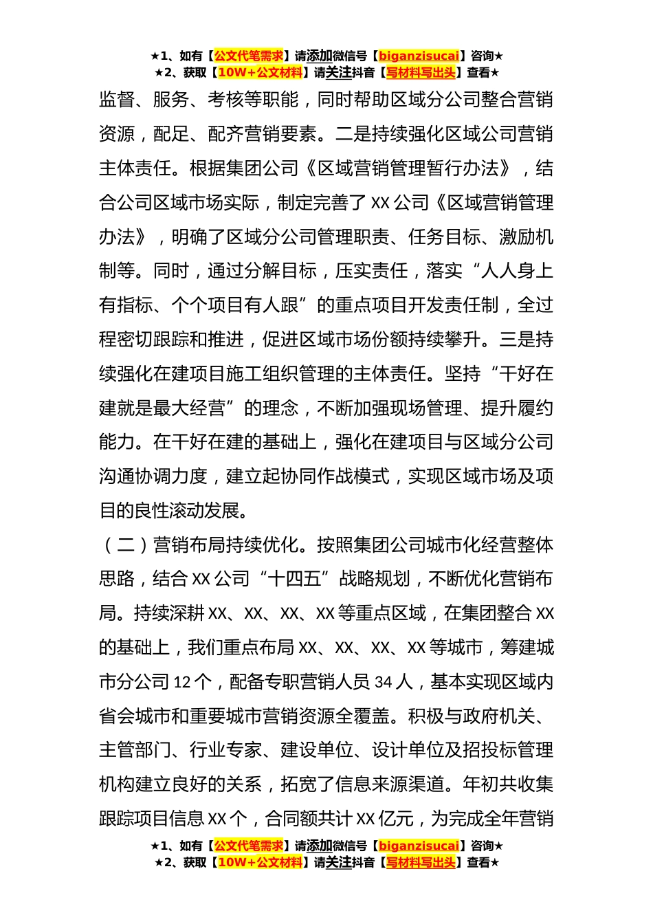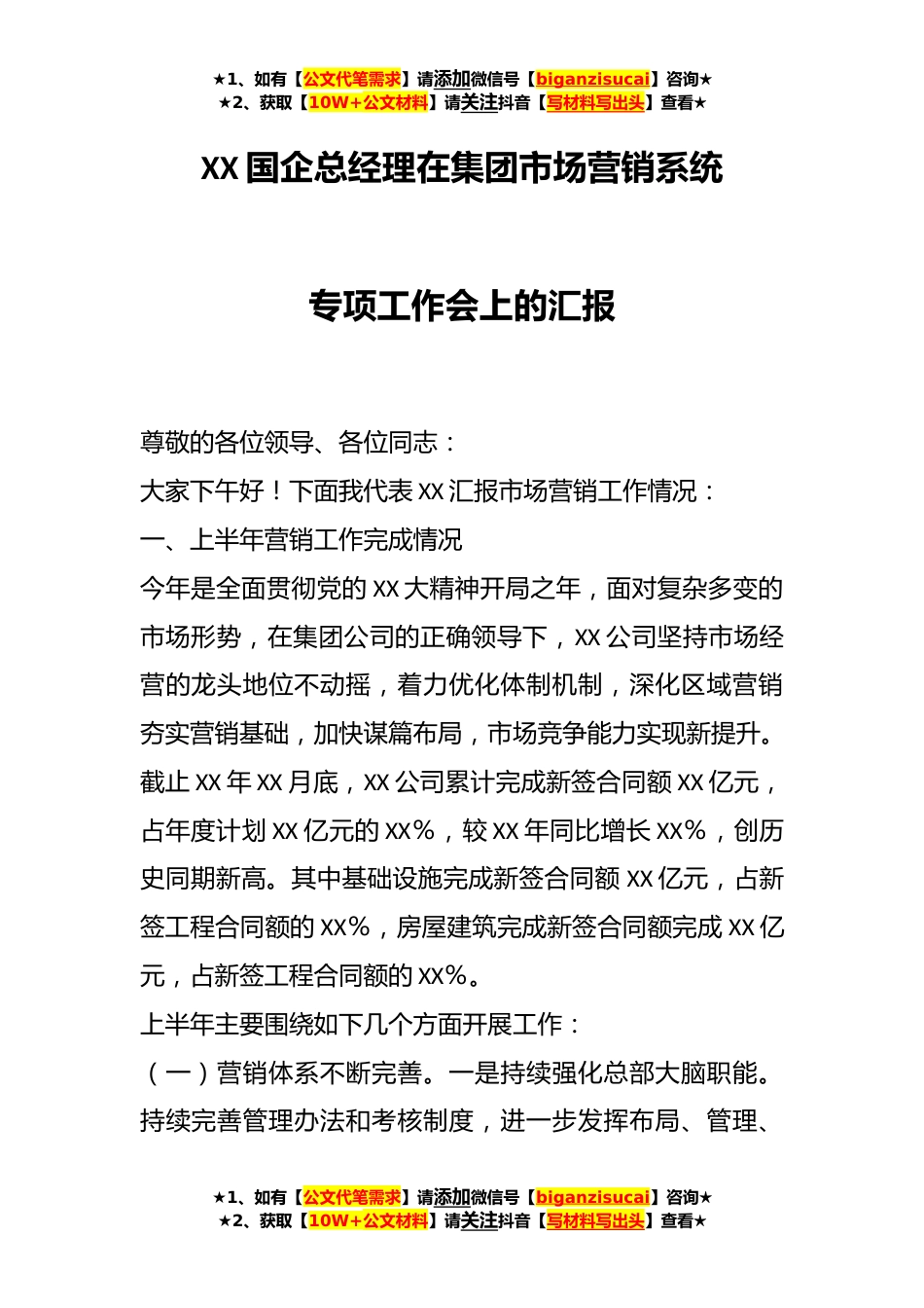 ★1、如有【公文代笔需求】请添加微信号【biganzisucai】咨询★★2、获取【10W+公文材料】请关注抖音【写材料写出头】查看★XX国企总经理在集团市场营销系统专项工作会上的汇报尊敬的各位领导、各位同志:大家下午好!下面我代表XX汇报市场营销工作情况:一、上半年营销工作完成情况今年是全面贯彻党的XX大精神开局之年,面对复杂多变的市场形势,在集团公司的正确领导下,XX公司坚持市场经营的龙头地位不动摇,着力优化体制机制,深化区域营销夯实营销基础,加快谋篇布局,市场竞争能力实现新提升。截止XX年XX月底,XX公司累计完成新签合同额XX亿元,占年度计划XX亿元的XX%,较XX年同比增长XX%,创历史同期新高。其中基础设施完成新签合同额XX亿元,占新签工程合同额的XX%,房屋建筑完成新签合同额完成XX亿元...