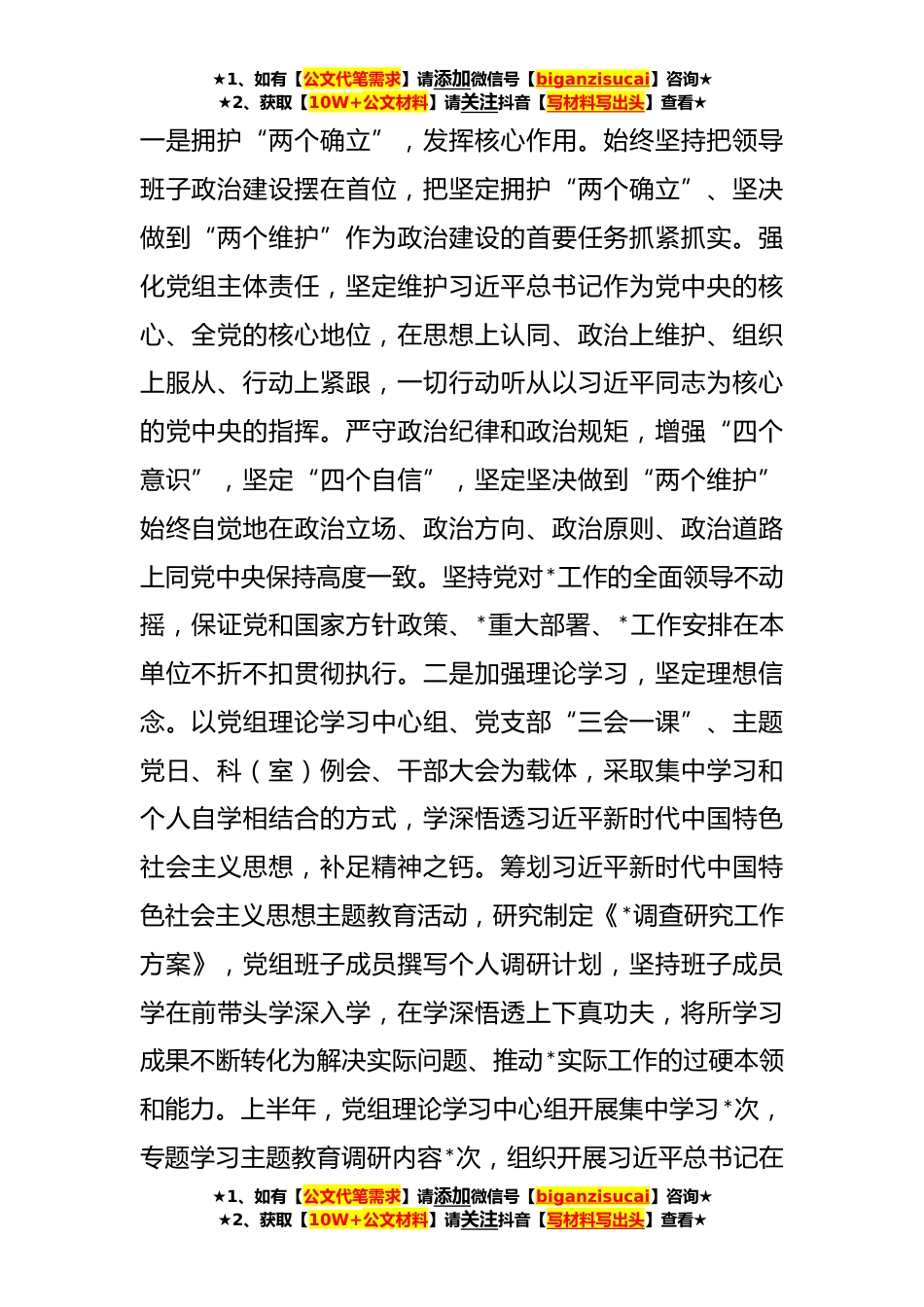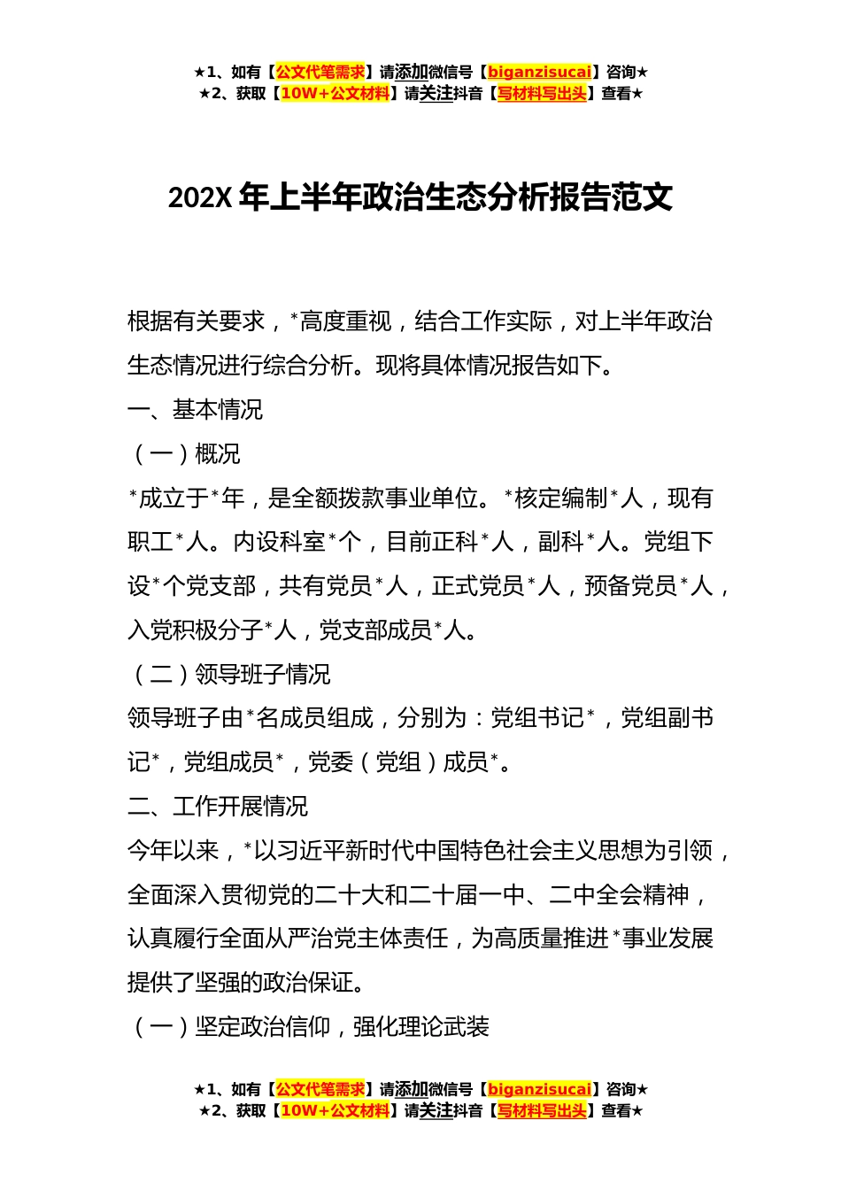★1、如有【公文代笔需求】请添加微信号【biganzisucai】咨询★★2、获取【10W+公文材料】请关注抖音【写材料写出头】查看★202X年上半年政治生态分析报告范文根据有关要求,*高度重视,结合工作实际,对上半年政治生态情况进行综合分析。现将具体情况报告如下。一、基本情况(一)概况*成立于*年,是全额拨款事业单位。*核定编制*人,现有职工*人。内设科室*个,目前正科*人,副科*人。党组下设*个党支部,共有党员*人,正式党员*人,预备党员*人,入党积极分子*人,党支部成员*人。(二)领导班子情况领导班子由*名成员组成,分别为:党组书记*,党组副书记*,党组成员*,党委(党组)成员*。二、工作开展情况今年以来,*以习近平新时代中国特色社会主义思想为引领,全面深入贯彻党的二十大和二十届一中、二中全...