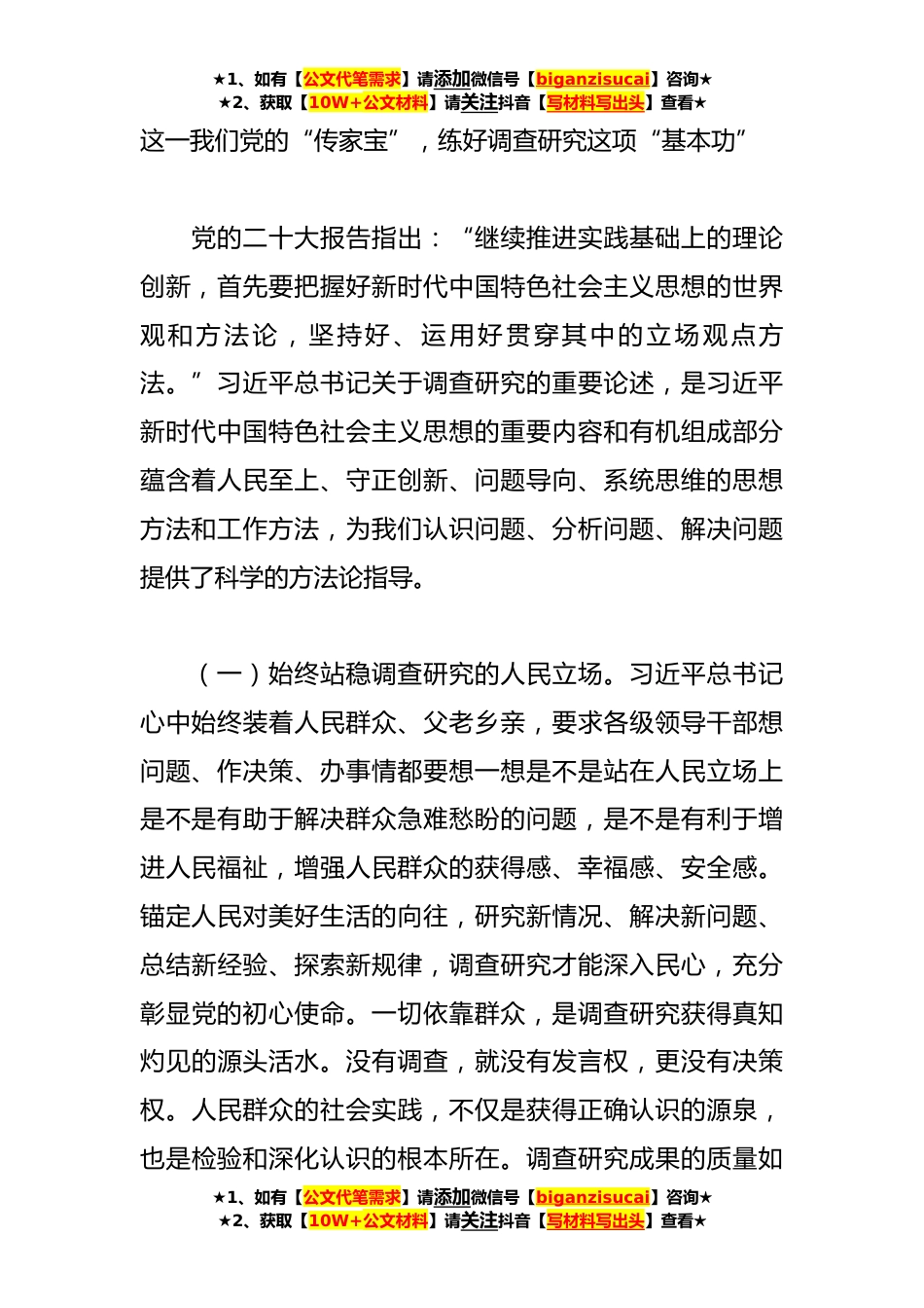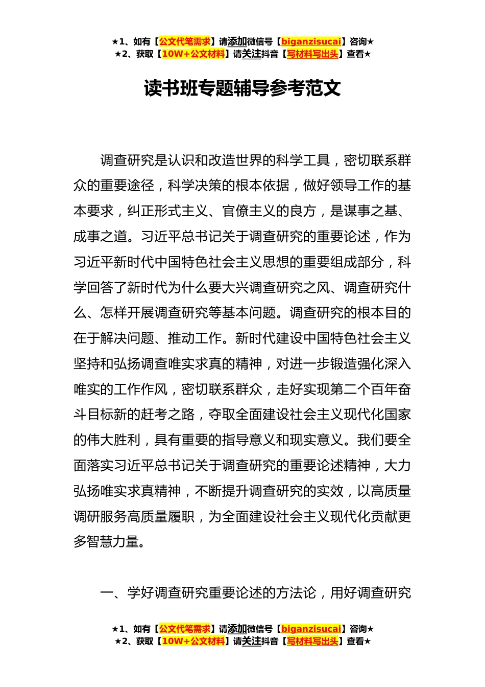 ★1、如有【公文代笔需求】请添加微信号【biganzisucai】咨询★★2、获取【10W+公文材料】请关注抖音【写材料写出头】查看★读书班专题辅导参考范文调查研究是认识和改造世界的科学工具,密切联系群众的重要途径,科学决策的根本依据,做好领导工作的基本要求,纠正形式主义、官僚主义的良方,是谋事之基、成事之道。习近平总书记关于调查研究的重要论述,作为习近平新时代中国特色社会主义思想的重要组成部分,科学回答了新时代为什么要大兴调查研究之风、调查研究什么、怎样开展调查研究等基本问题。调查研究的根本目的在于解决问题、推动工作。新时代建设中国特色社会主义坚持和弘扬调查唯实求真的精神,对进一步锻造强化深入唯实的工作作风,密切联系群众,走好实现第二个百年奋斗目标新的赶考之路,夺取全面...