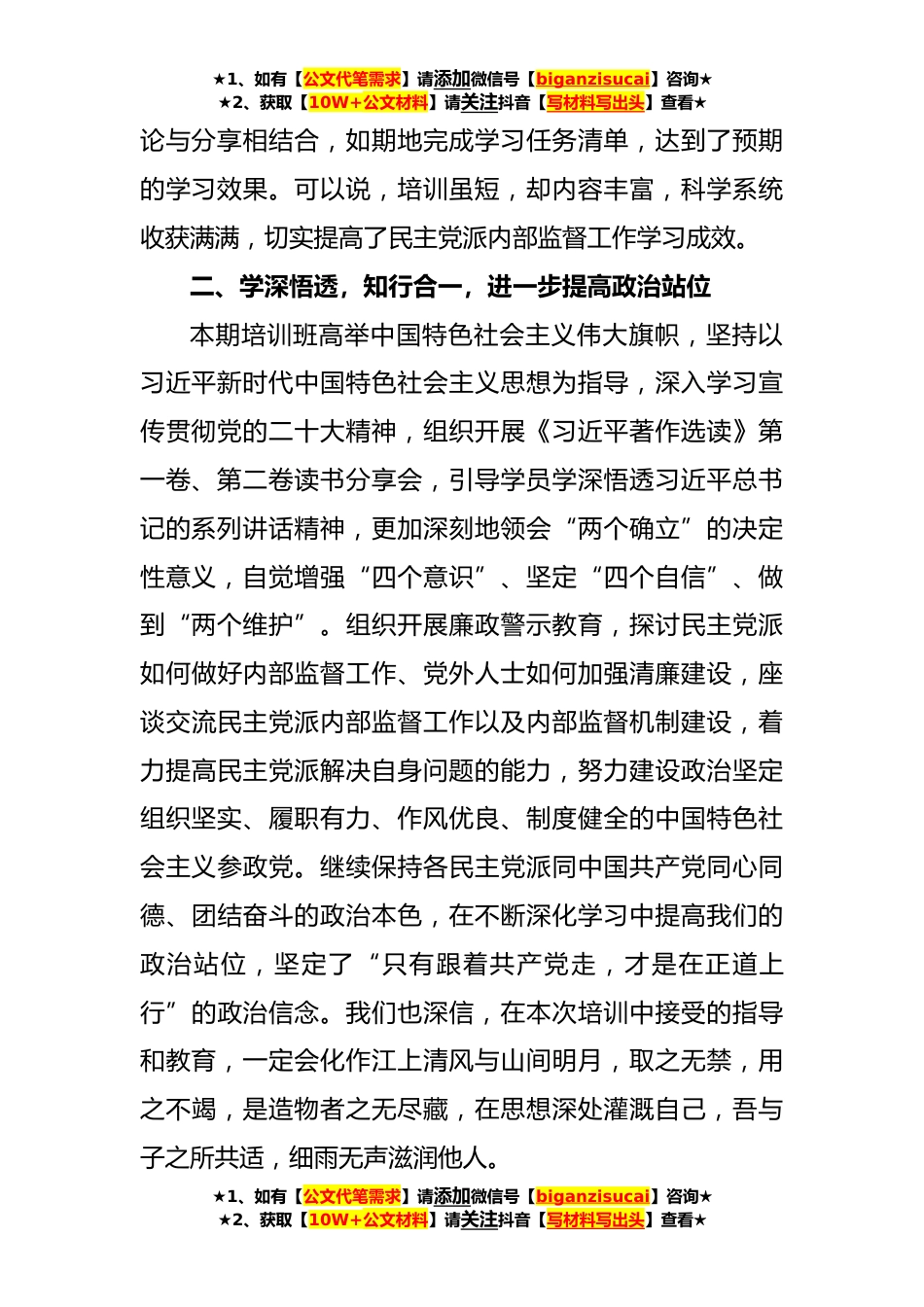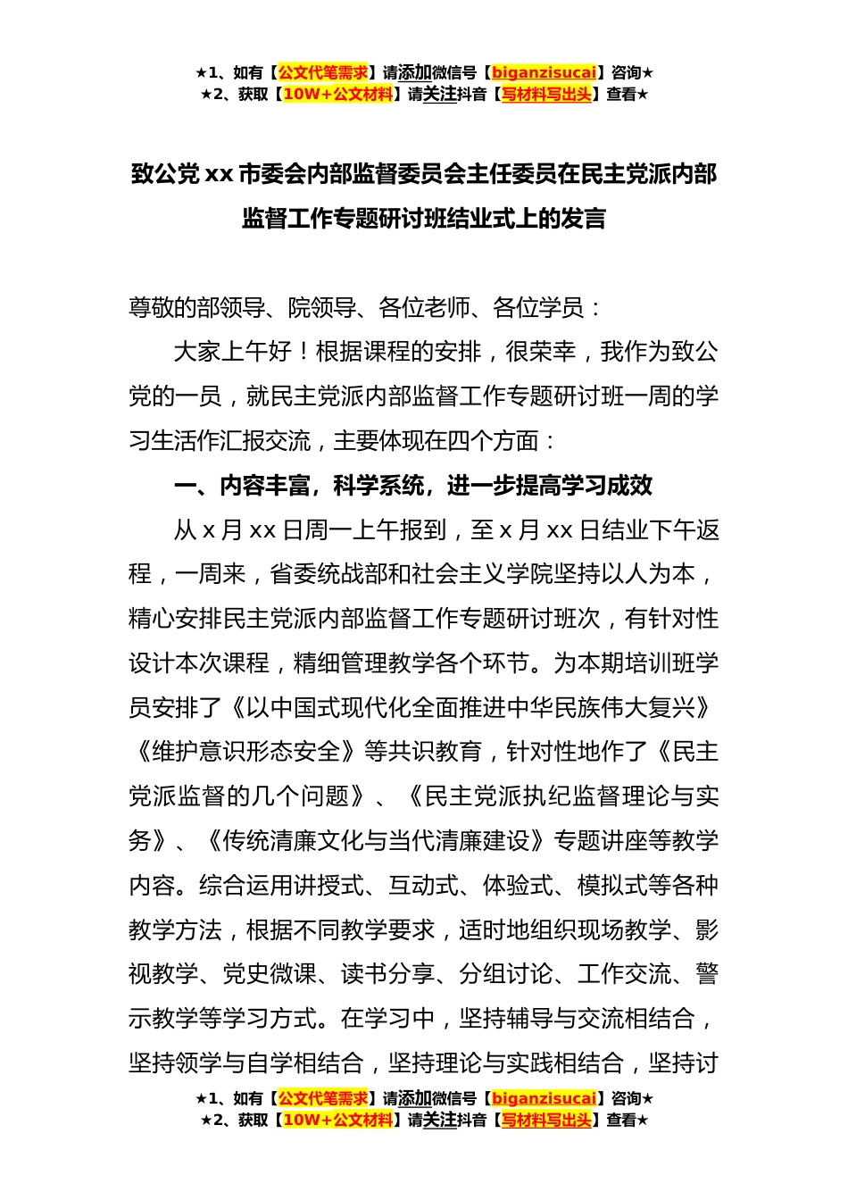 ★1、如有【公文代笔需求】请添加微信号【biganzisucai】咨询★★2、获取【10W+公文材料】请关注抖音【写材料写出头】查看★致公党xx市委会内部监督委员会主任委员在民主党派内部监督工作专题研讨班结业式上的发言尊敬的部领导、院领导、各位老师、各位学员:大家上午好!根据课程的安排,很荣幸,我作为致公党的一员,就民主党派内部监督工作专题研讨班一周的学习生活作汇报交流,主要体现在四个方面:一、内容丰富,科学系统,进一步提高学习成效从x月xx日周一上午报到,至x月xx日结业下午返程,一周来,省委统战部和社会主义学院坚持以人为本,精心安排民主党派内部监督工作专题研讨班次,有针对性设计本次课程,精细管理教学各个环节。为本期培训班学员安排了《以中国式现代化全面推进中华民族伟大复兴》《维...