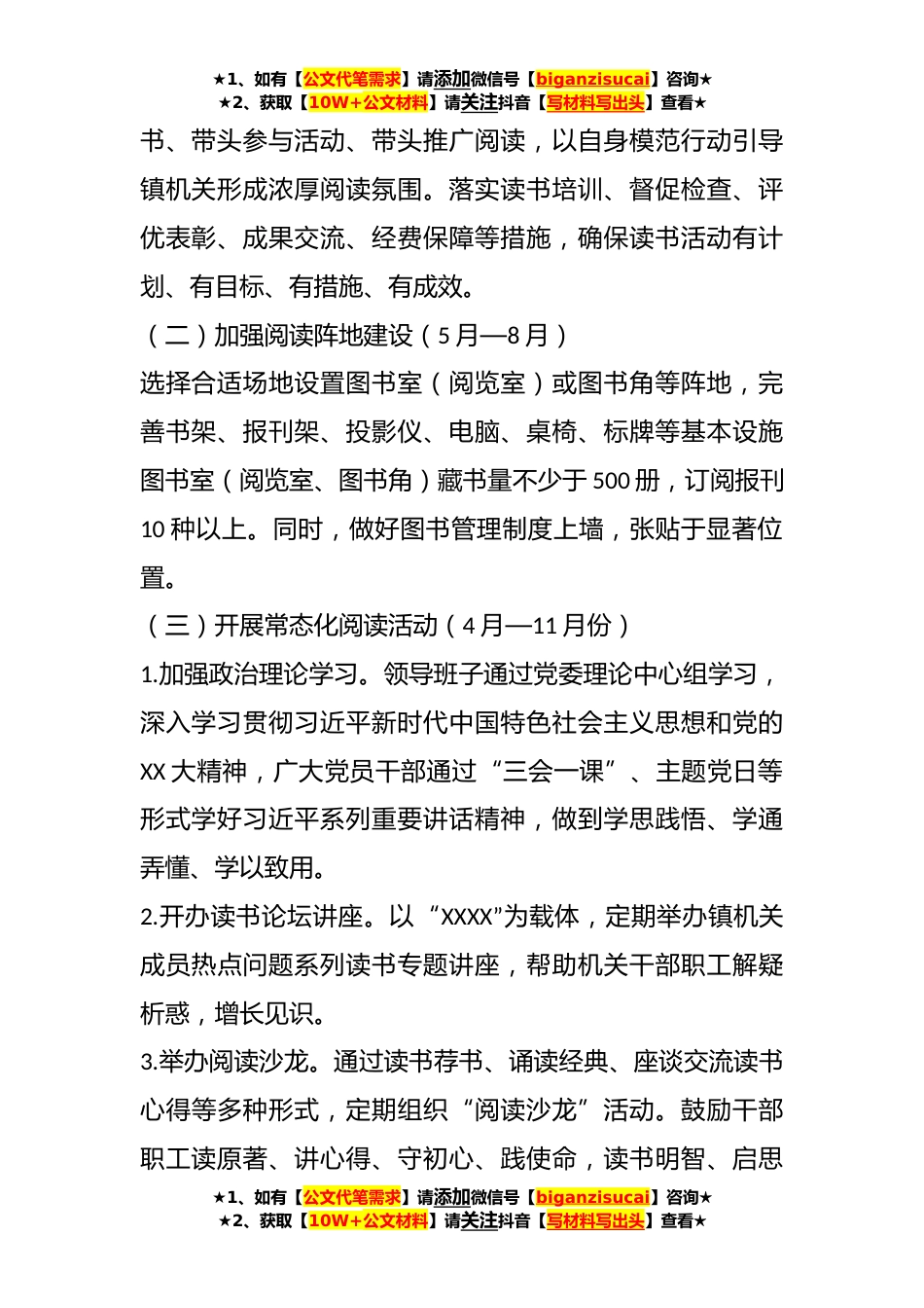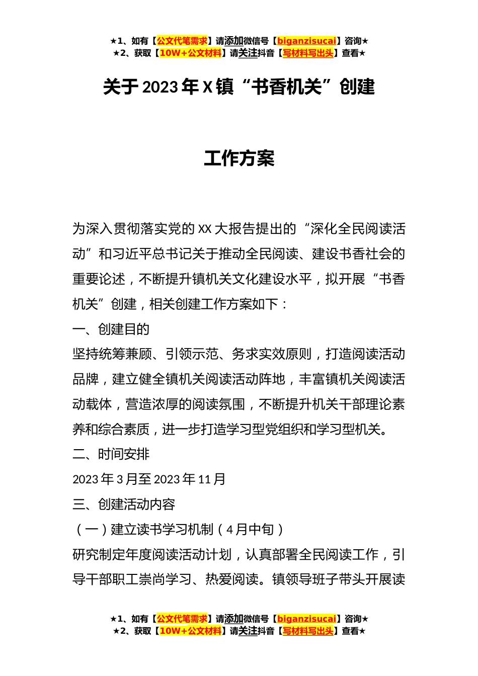 ★1、如有【公文代笔需求】请添加微信号【biganzisucai】咨询★★2、获取【10W+公文材料】请关注抖音【写材料写出头】查看★关于2023年X镇“书香机关”创建工作方案为深入贯彻落实党的XX大报告提出的“深化全民阅读活动”和习近平总书记关于推动全民阅读、建设书香社会的重要论述,不断提升镇机关文化建设水平,拟开展“书香机关”创建,相关创建工作方案如下:一、创建目的坚持统筹兼顾、引领示范、务求实效原则,打造阅读活动品牌,建立健全镇机关阅读活动阵地,丰富镇机关阅读活动载体,营造浓厚的阅读氛围,不断提升机关干部理论素养和综合素质,进一步打造学习型党组织和学习型机关。二、时间安排2023年3月至2023年11月三、创建活动内容(一)建立读书学习机制(4月中旬)研究制定年度阅读活动计划,认真部署...