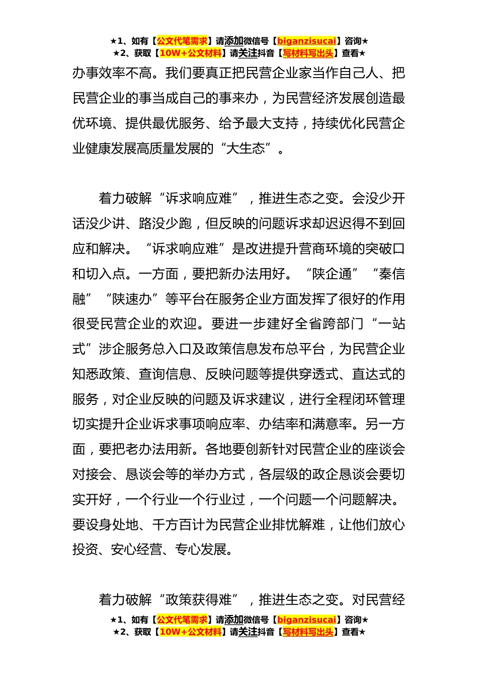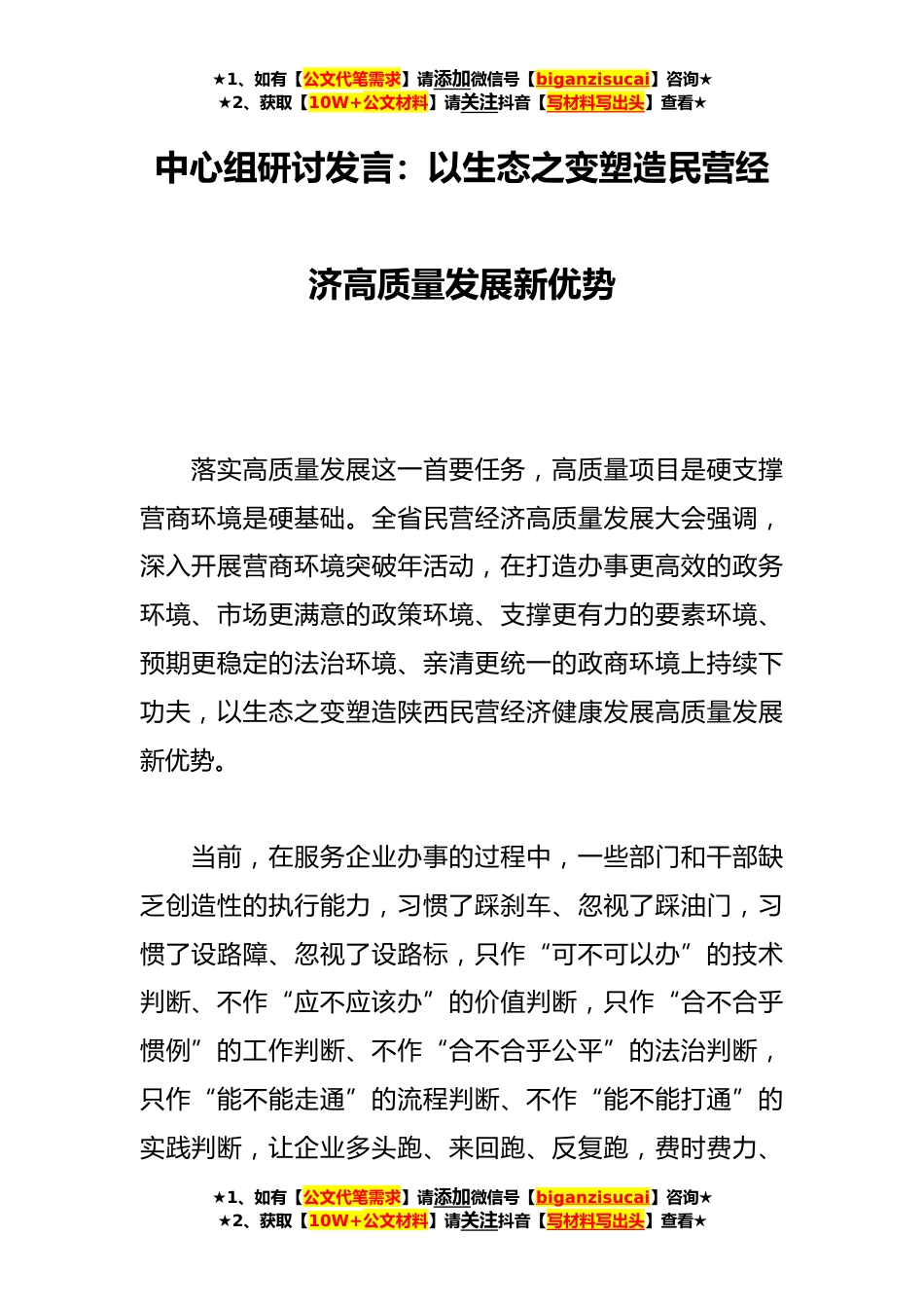 ★1、如有【公文代笔需求】请添加微信号【biganzisucai】咨询★★2、获取【10W+公文材料】请关注抖音【写材料写出头】查看★中心组研讨发言:以生态之变塑造民营经济高质量发展新优势落实高质量发展这一首要任务,高质量项目是硬支撑营商环境是硬基础。全省民营经济高质量发展大会强调,深入开展营商环境突破年活动,在打造办事更高效的政务环境、市场更满意的政策环境、支撑更有力的要素环境、预期更稳定的法治环境、亲清更统一的政商环境上持续下功夫,以生态之变塑造陕西民营经济健康发展高质量发展新优势。当前,在服务企业办事的过程中,一些部门和干部缺乏创造性的执行能力,习惯了踩刹车、忽视了踩油门,习惯了设路障、忽视了设路标,只作“可不可以办”的技术判断、不作“应不应该办”的价值判断,只作“...