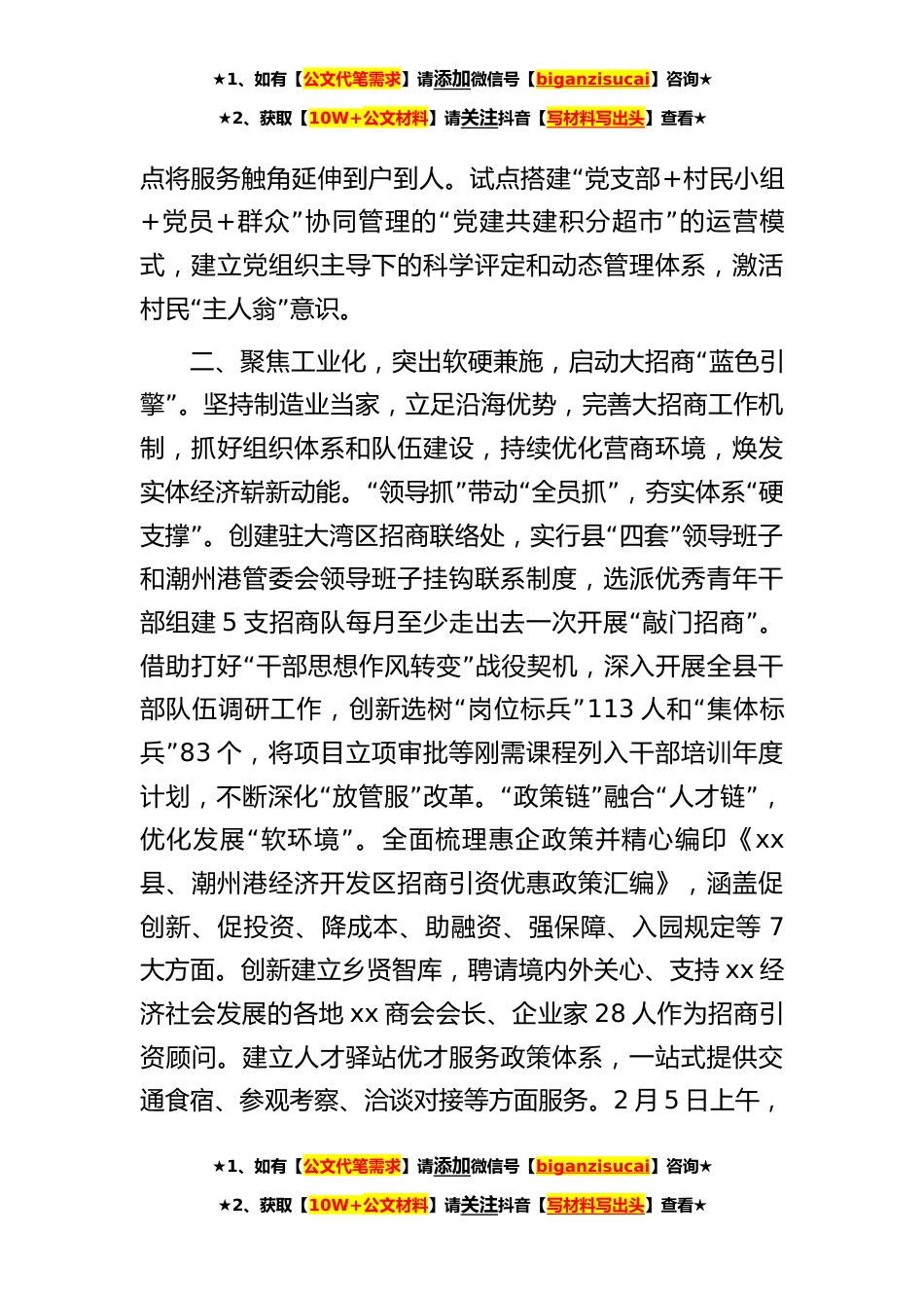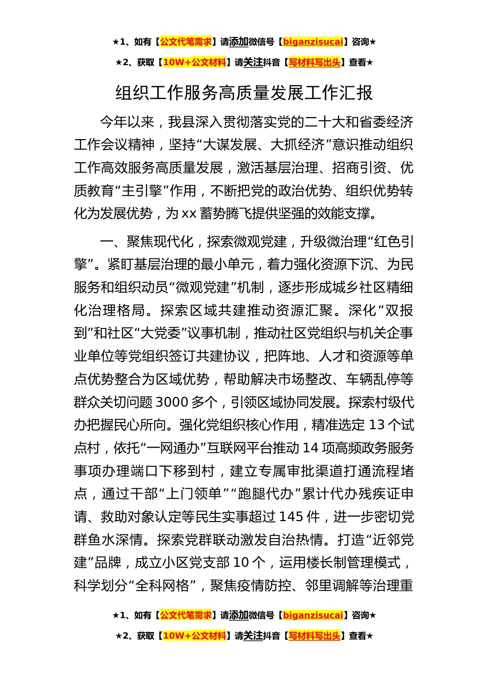 ★1、如有【公文代笔需求】请添加微信号【biganzisucai】咨询★★2、获取【10W+公文材料】请关注抖音【写材料写出头】查看★组织工作服务高质量发展工作汇报今年以来,我县深入贯彻落实党的二十大和省委经济“”工作会议精神,坚持大谋发展、大抓经济意识推动组织工作高效服务高质量发展,激活基层治理、招商引资、优“”质教育主引擎作用,不断把党的政治优势、组织优势转化为发展优势,为xx蓄势腾飞提供坚强的效能支撑。“一、聚焦现代化,探索微观党建,升级微治理红色引”擎。紧盯基层治理的最小单元,着力强化资源下沉、为民“”服务和组织动员微观党建机制,逐步形成城乡社区精细“化治理格局。探索区域共建推动资源汇聚。深化双报”“”到和社区大党委议事机制,推动社区党组织与机关企事业单位等党组织签...