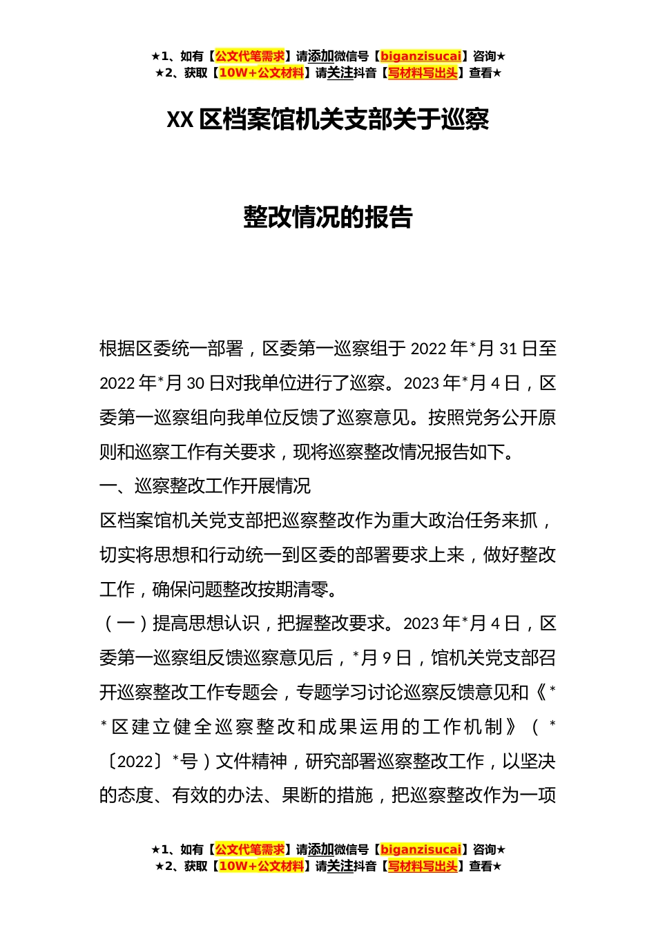★1、如有【公文代笔需求】请添加微信号【biganzisucai】咨询★★2、获取【10W+公文材料】请关注抖音【写材料写出头】查看★XX区档案馆机关支部关于巡察整改情况的报告根据区委统一部署,区委第一巡察组于2022年*月31日至2022年*月30日对我单位进行了巡察。2023年*月4日,区委第一巡察组向我单位反馈了巡察意见。按照党务公开原则和巡察工作有关要求,现将巡察整改情况报告如下。一、巡察整改工作开展情况区档案馆机关党支部把巡察整改作为重大政治任务来抓,切实将思想和行动统一到区委的部署要求上来,做好整改工作,确保问题整改按期清零。(一)提高思想认识,把握整改要求。2023年*月4日,区委第一巡察组反馈巡察意见后,*月9日,馆机关党支部召开巡察整改工作专题会,专题学习讨论巡察反馈意见和《**区建立...