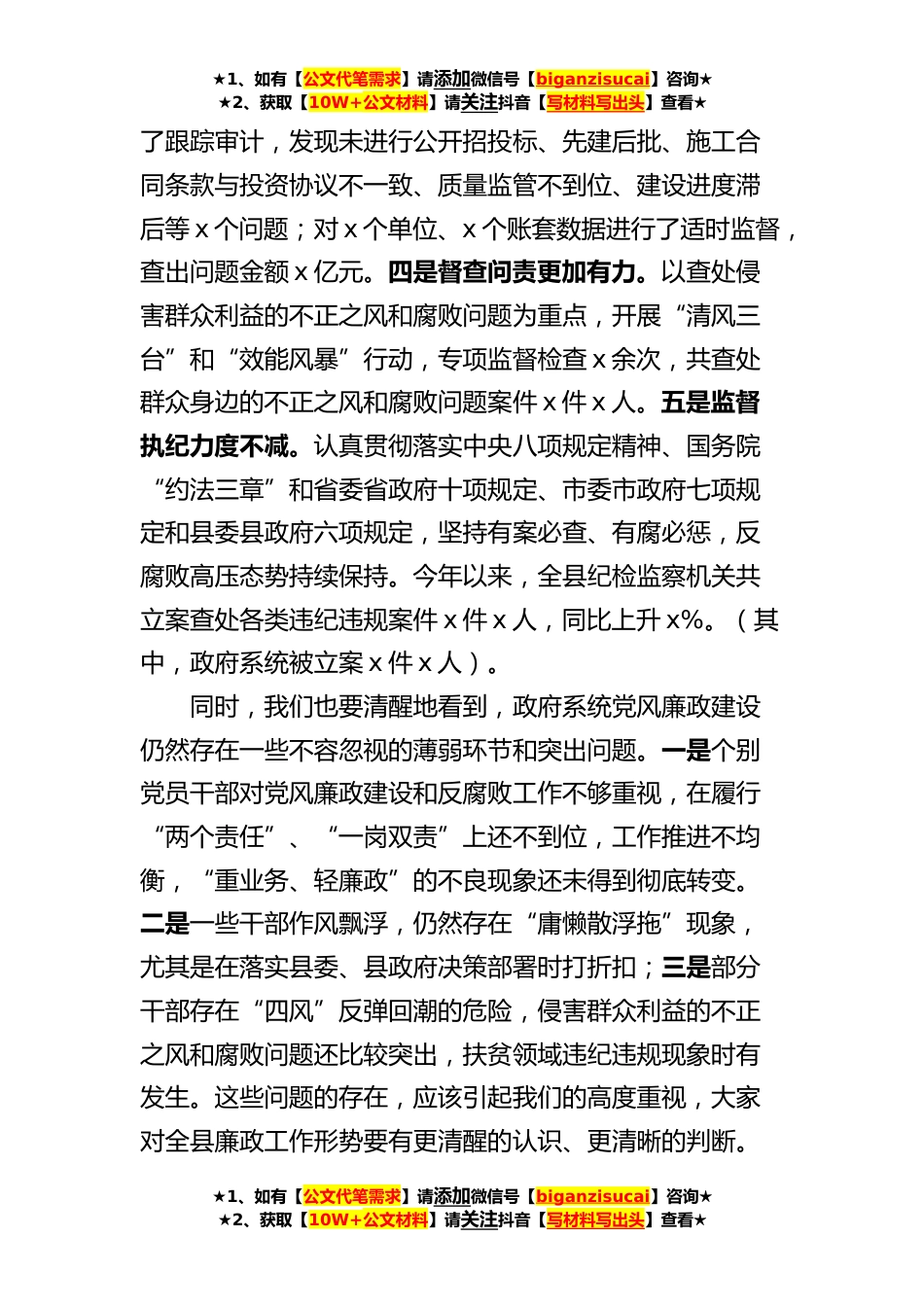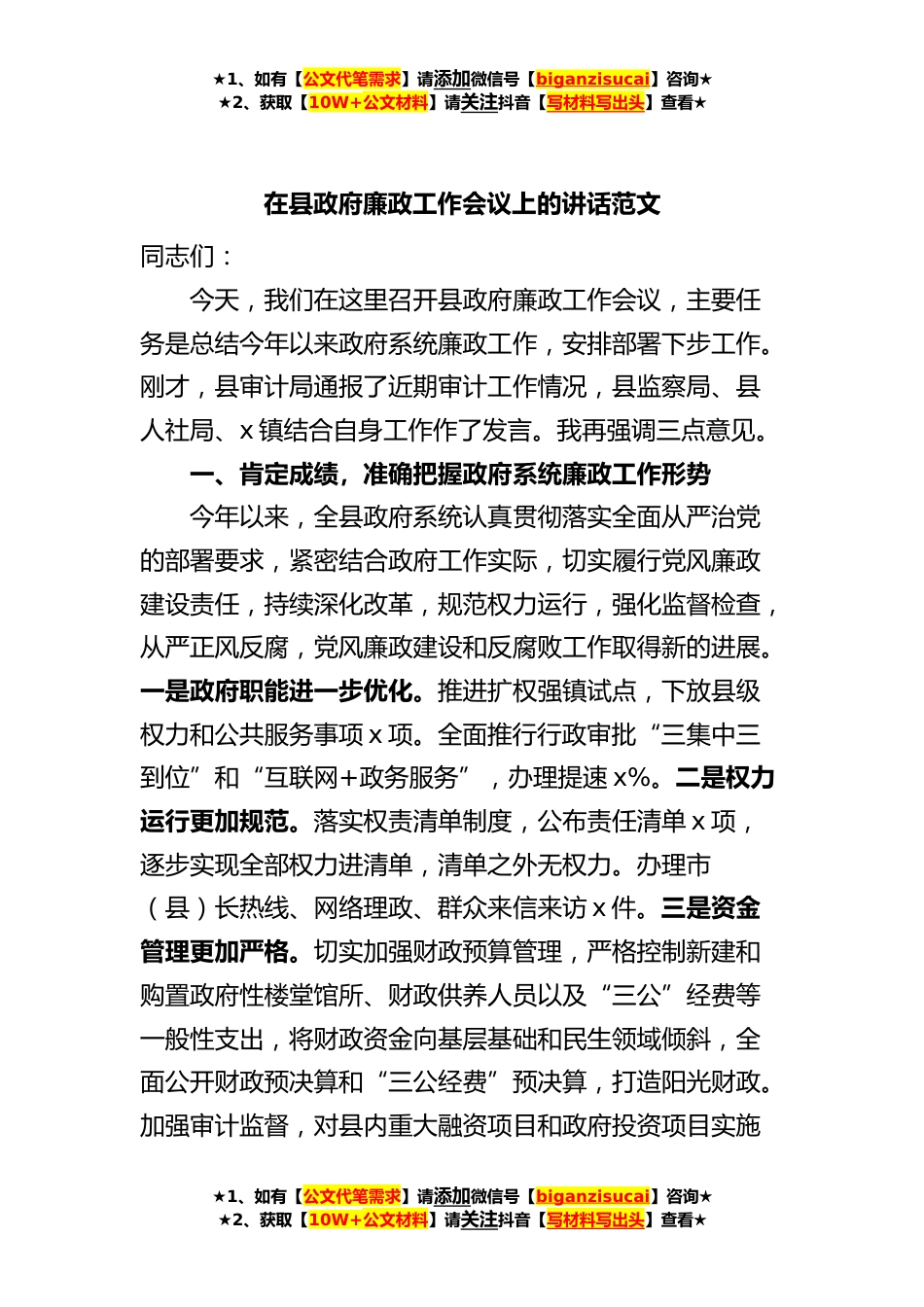 ★1、如有【公文代笔需求】请添加微信号【biganzisucai】咨询★★2、获取【10W+公文材料】请关注抖音【写材料写出头】查看★在县政府廉政工作会议上的讲话范文同志们:今天,我们在这里召开县政府廉政工作会议,主要任务是总结今年以来政府系统廉政工作,安排部署下步工作。刚才,县审计局通报了近期审计工作情况,县监察局、县人社局、x镇结合自身工作作了发言。我再强调三点意见。一、肯定成绩,准确把握政府系统廉政工作形势今年以来,全县政府系统认真贯彻落实全面从严治党的部署要求,紧密结合政府工作实际,切实履行党风廉政建设责任,持续深化改革,规范权力运行,强化监督检查,从严正风反腐,党风廉政建设和反腐败工作取得新的进展。一是政府职能进一步优化。推进扩权强镇试点,下放县级权力和公共服务事...