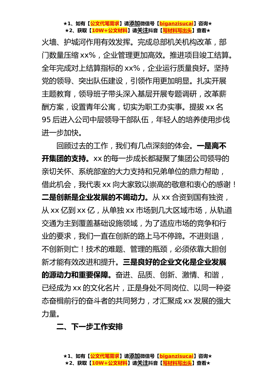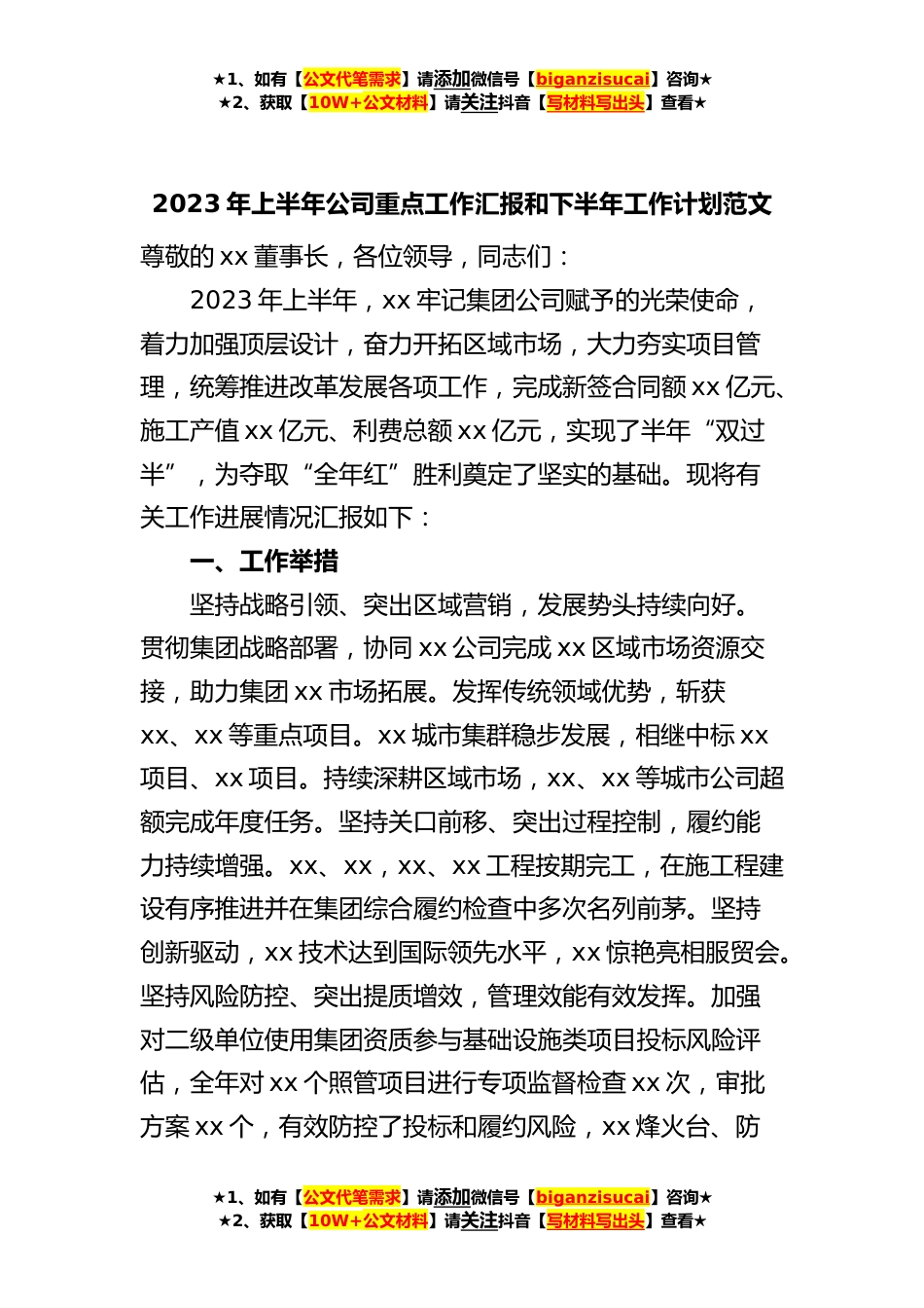 ★1、如有【公文代笔需求】请添加微信号【biganzisucai】咨询★★2、获取【10W+公文材料】请关注抖音【写材料写出头】查看★2023年上半年公司重点工作汇报和下半年工作计划范文尊敬的xx董事长,各位领导,同志们:2023年上半年,xx牢记集团公司赋予的光荣使命,着力加强顶层设计,奋力开拓区域市场,大力夯实项目管理,统筹推进改革发展各项工作,完成新签合同额xx亿元、施工产值xx亿元、利费总额xx亿元,实现了半年“双过半”,为夺取“全年红”胜利奠定了坚实的基础。现将有关工作进展情况汇报如下:一、工作举措坚持战略引领、突出区域营销,发展势头持续向好。贯彻集团战略部署,协同xx公司完成xx区域市场资源交接,助力集团xx市场拓展。发挥传统领域优势,斩获xx、xx等重点项目。xx城市集群稳步发展,相继中...