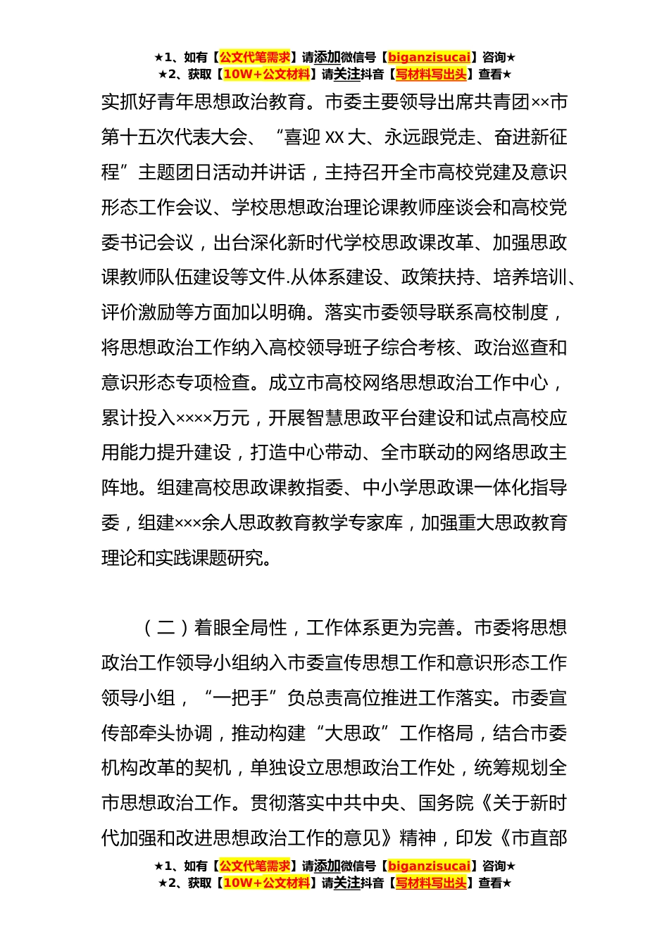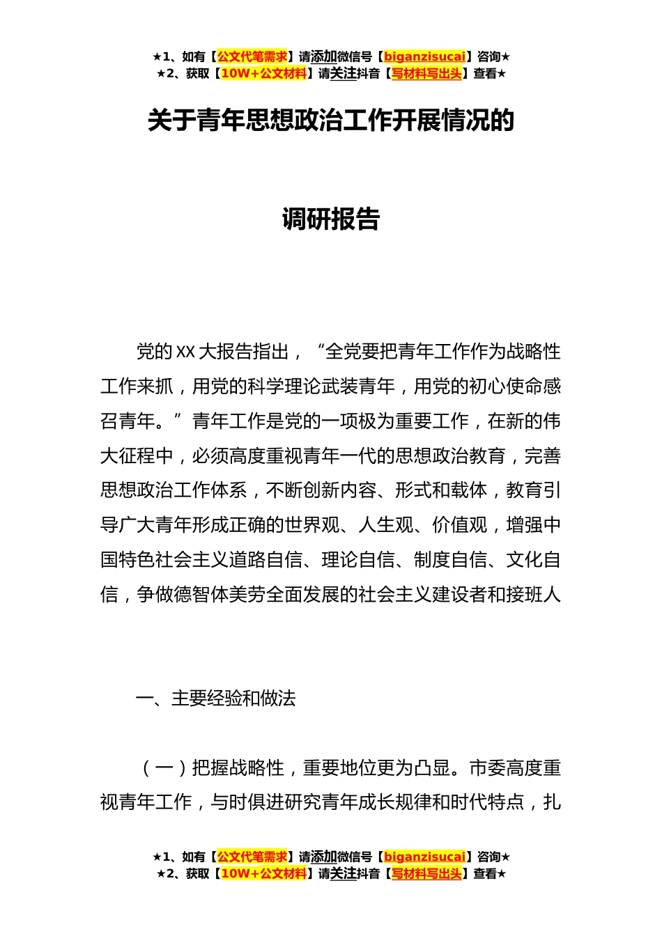 ★1、如有【公文代笔需求】请添加微信号【biganzisucai】咨询★★2、获取【10W+公文材料】请关注抖音【写材料写出头】查看★关于青年思想政治工作开展情况的调研报告党的XX大报告指出,“全党要把青年工作作为战略性工作来抓,用党的科学理论武装青年,用党的初心使命感召青年。”青年工作是党的一项极为重要工作,在新的伟大征程中,必须高度重视青年一代的思想政治教育,完善思想政治工作体系,不断创新内容、形式和载体,教育引导广大青年形成正确的世界观、人生观、价值观,增强中国特色社会主义道路自信、理论自信、制度自信、文化自信,争做德智体美劳全面发展的社会主义建设者和接班人一、主要经验和做法(一)把握战略性,重要地位更为凸显。市委高度重视青年工作,与时俱进研究青年成长规律和时代特点,...