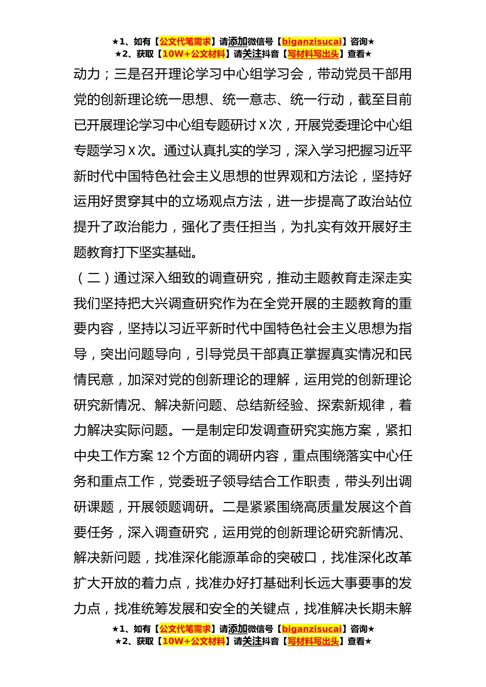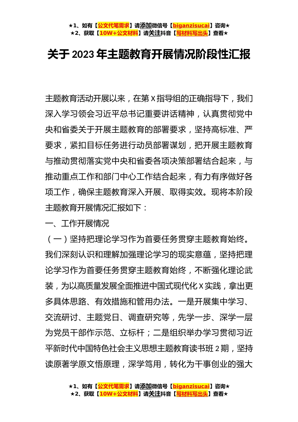★1、如有【公文代笔需求】请添加微信号【biganzisucai】咨询★★2、获取【10W+公文材料】请关注抖音【写材料写出头】查看★关于2023年主题教育开展情况阶段性汇报主题教育活动开展以来,在第X指导组的正确指导下,我们深入学习领会习近平总书记重要讲话精神,认真贯彻党中央和省委关于开展主题教育的部署要求,坚持高标准、严要求,紧扣目标任务进行动员部署谋划,把开展主题教育与推动贯彻落实党中央和省委各项决策部署结合起来,与推动重点工作和部门中心工作结合起来,有力有序做好各项工作,确保主题教育深入开展、取得实效。现将本阶段主题教育开展情况汇报如下:一、工作开展情况(一)坚持把理论学习作为首要任务贯穿主题教育始终。我们深刻认识和理解加强理论学习的现实意蕴,坚持把理论学习作为首要任务...
