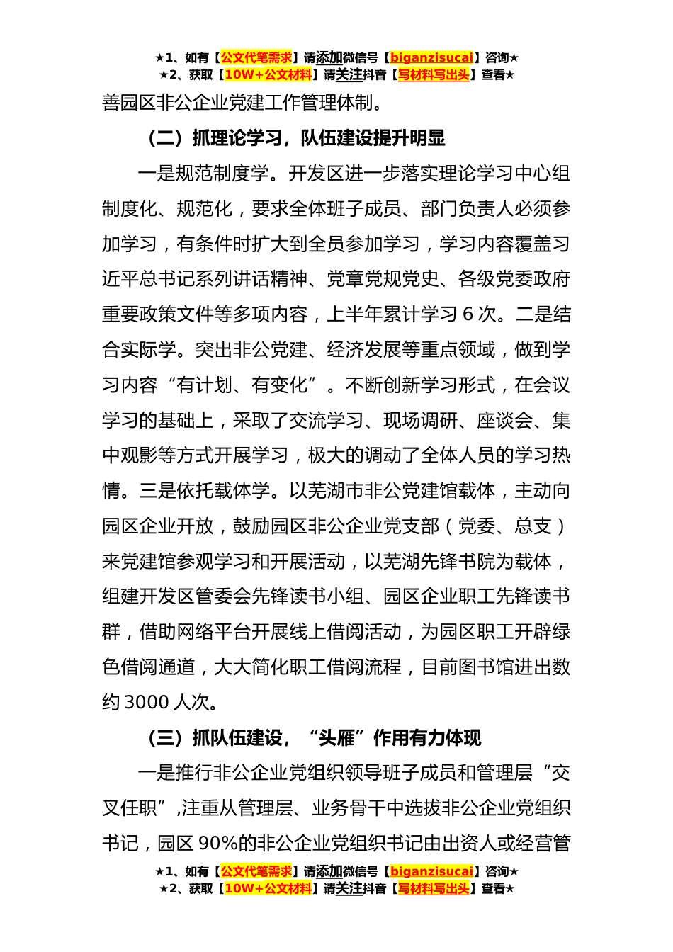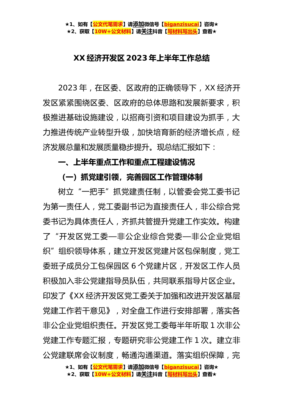 ★1、如有【公文代笔需求】请添加微信号【biganzisucai】咨询★★2、获取【10W+公文材料】请关注抖音【写材料写出头】查看★XX经济开发区2023年上半年工作总结2023年,在区委、区政府的正确领导下,XX经济开发区紧紧围绕区委、区政府的总体思路和发展新要求,积极推进基础设施建设,以招商引资和项目建设为抓手,大力推进传统产业转型升级,加快培育新的经济增长点,经济发展总量和发展质量稳步提升。现总结汇报如下:一、上半年重点工作和重点工程建设情况(一)抓党建引领,完善园区工作管理体制树立“一把手”抓党建责任制,以管委会党工委书记为第一责任人,党工委副书记为直接责任人,非公综合党委书记为具体责任人,齐抓共管提升党建工作实效。构建了“开发区党工委—非公企业综合党委—非公企业党组织”组...