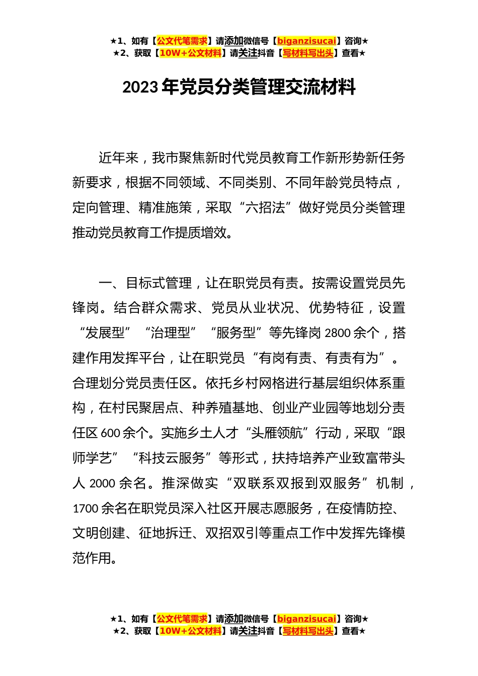 ★1、如有【公文代笔需求】请添加微信号【biganzisucai】咨询★★2、获取【10W+公文材料】请关注抖音【写材料写出头】查看★2023年党员分类管理交流材料近年来,我市聚焦新时代党员教育工作新形势新任务新要求,根据不同领域、不同类别、不同年龄党员特点,定向管理、精准施策,采取“六招法”做好党员分类管理推动党员教育工作提质增效。一、目标式管理,让在职党员有责。按需设置党员先锋岗。结合群众需求、党员从业状况、优势特征,设置“发展型”“治理型”“服务型”等先锋岗2800余个,搭建作用发挥平台,让在职党员“有岗有责、有责有为”。合理划分党员责任区。依托乡村网格进行基层组织体系重构,在村民聚居点、种养殖基地、创业产业园等地划分责任区600余个。实施乡土人才“头雁领航”行动,采取“跟师学...