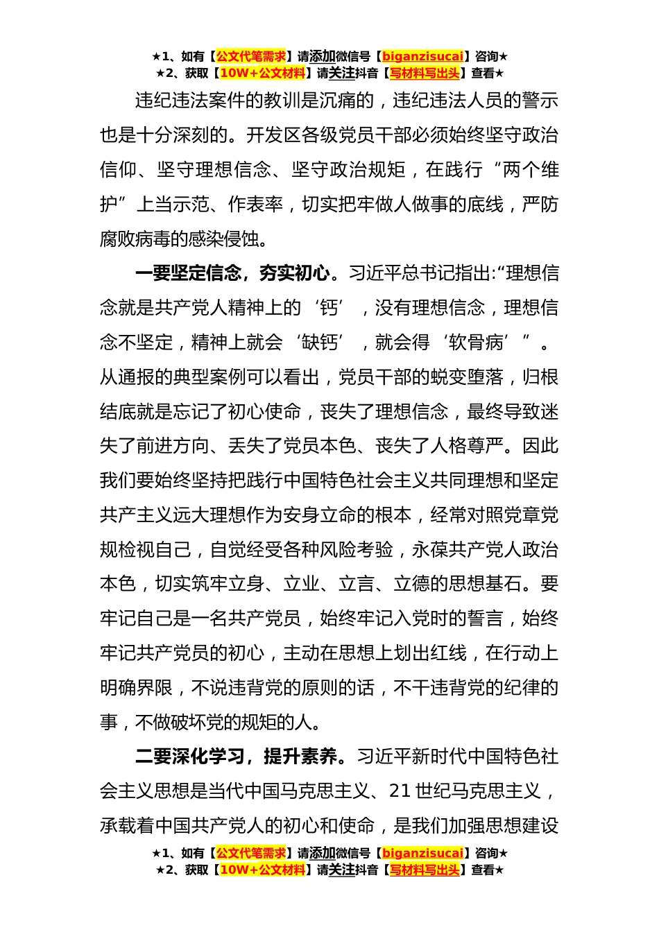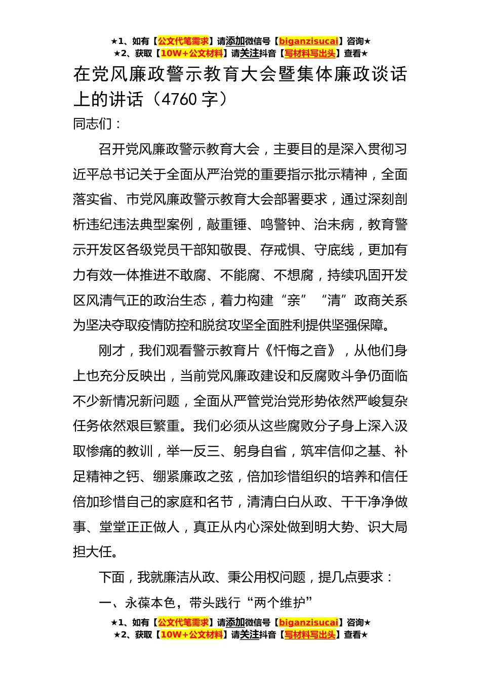 ★1、如有【公文代笔需求】请添加微信号【biganzisucai】咨询★★2、获取【10W+公文材料】请关注抖音【写材料写出头】查看★在党风廉政警示教育大会暨集体廉政谈话上的讲话(4760字)同志们:召开党风廉政警示教育大会,主要目的是深入贯彻习近平总书记关于全面从严治党的重要指示批示精神,全面落实省、市党风廉政警示教育大会部署要求,通过深刻剖析违纪违法典型案例,敲重锤、鸣警钟、治未病,教育警示开发区各级党员干部知敬畏、存戒惧、守底线,更加有力有效一体推进不敢腐、不能腐、不想腐,持续巩固开发区风清气正的政治生态,着力构建“亲”“清”政商关系为坚决夺取疫情防控和脱贫攻坚全面胜利提供坚强保障。刚才,我们观看警示教育片《忏悔之音》,从他们身上也充分反映出,当前党风廉政建设和反腐败斗...