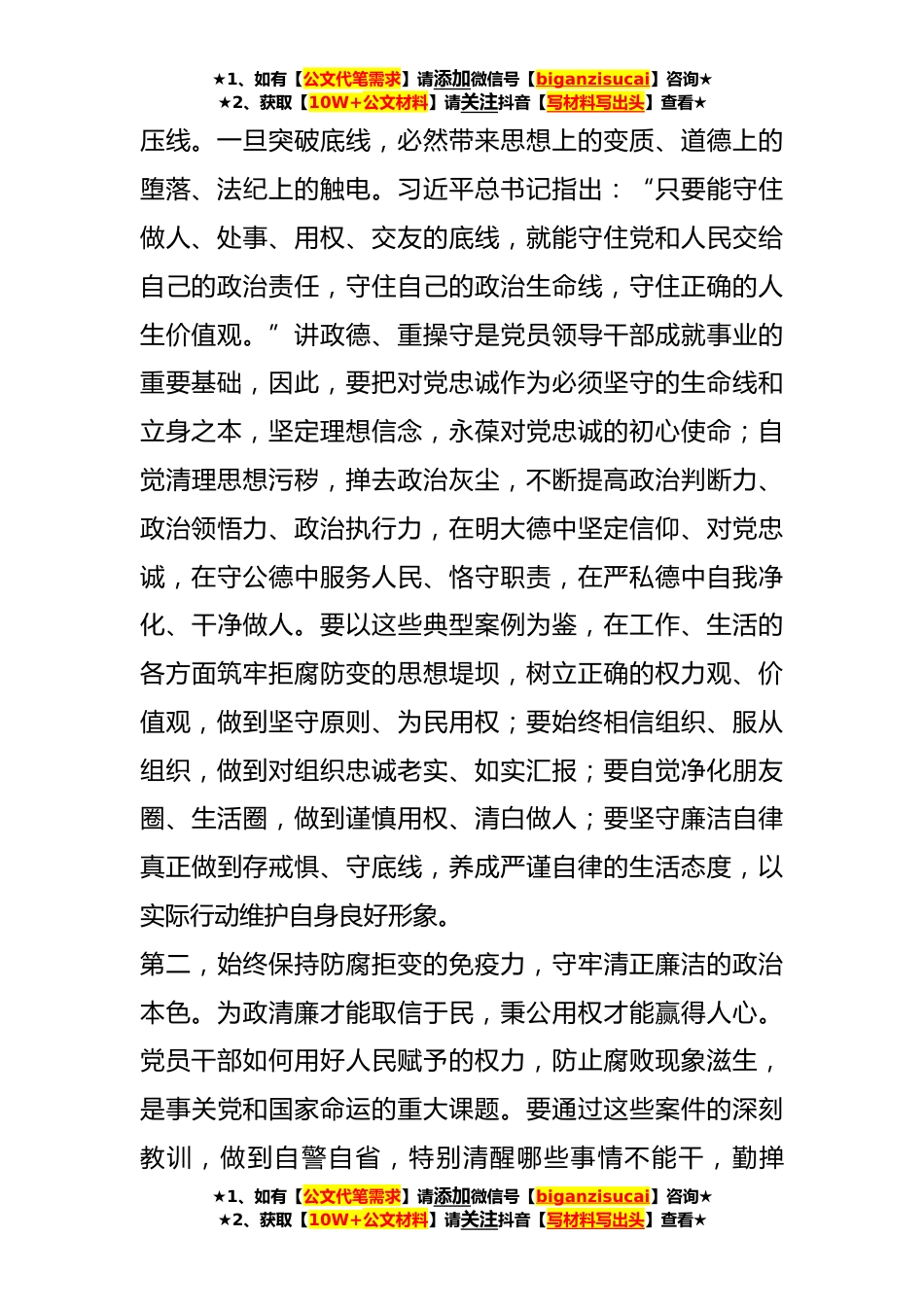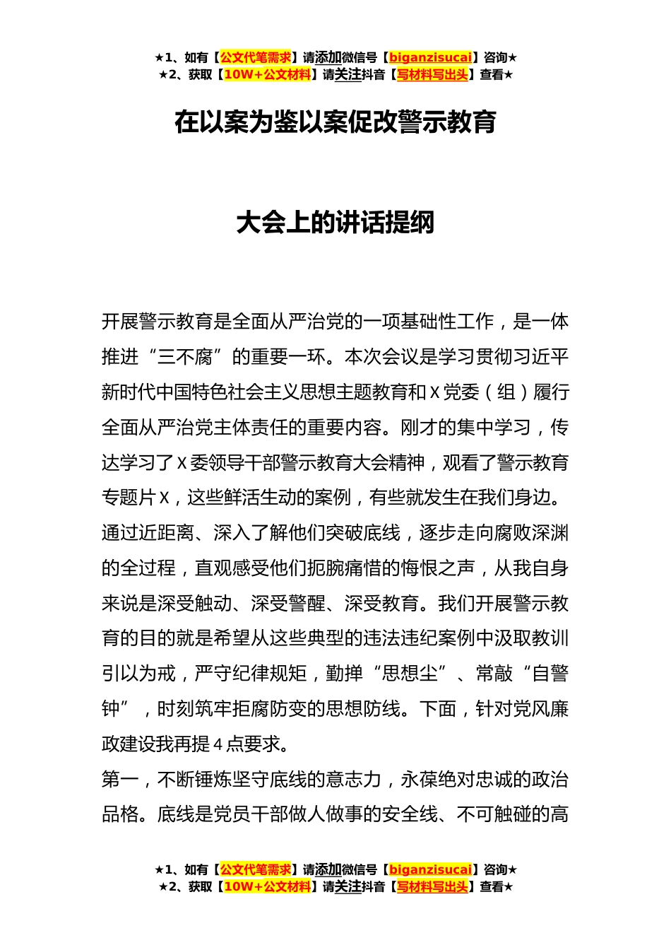 ★1、如有【公文代笔需求】请添加微信号【biganzisucai】咨询★★2、获取【10W+公文材料】请关注抖音【写材料写出头】查看★在以案为鉴以案促改警示教育大会上的讲话提纲开展警示教育是全面从严治党的一项基础性工作,是一体推进“三不腐”的重要一环。本次会议是学习贯彻习近平新时代中国特色社会主义思想主题教育和X党委(组)履行全面从严治党主体责任的重要内容。刚才的集中学习,传达学习了X委领导干部警示教育大会精神,观看了警示教育专题片X,这些鲜活生动的案例,有些就发生在我们身边。通过近距离、深入了解他们突破底线,逐步走向腐败深渊的全过程,直观感受他们扼腕痛惜的悔恨之声,从我自身来说是深受触动、深受警醒、深受教育。我们开展警示教育的目的就是希望从这些典型的违法违纪案例中汲取教训引...
