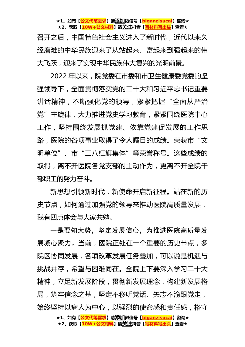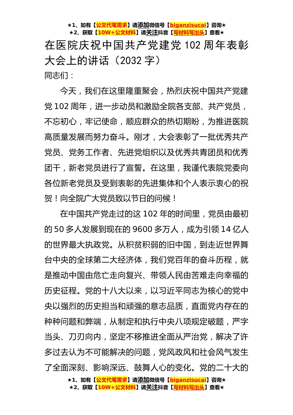 ★1、如有【公文代笔需求】请添加微信号【biganzisucai】咨询★★2、获取【10W+公文材料】请关注抖音【写材料写出头】查看★在医院庆祝中国共产党建党102周年表彰大会上的讲话(2032字)同志们:今天,我们在这里隆重聚会,热烈庆祝中国共产党建党102周年,进一步动员和激励全院各支部、共产党员,不忘初心,牢记使命,顺应群众的热切期盼,为推进医院高质量发展而努力奋斗。刚才,大会表彰了一批优秀共产党员、党务工作者、先进党组织以及优秀共青团员和优秀团干,新老党员进行了宣誓。在这里,我谨代表院党委向各位新老党员及受到表彰的先进集体和个人表示衷心的祝贺!向全院广大党员致以节日的问候!在中国共产党走过的这102年的时间里,党员由最初的50多人发展到现在的9600多万人,成为引领14亿人的世界最大执...