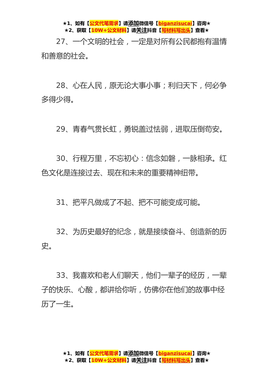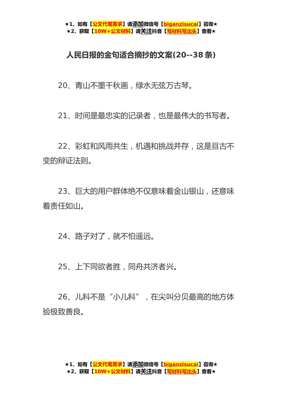 ★1、如有【公文代笔需求】请添加微信号【biganzisucai】咨询★★2、获取【10W+公文材料】请关注抖音【写材料写出头】查看★人民日报的金句适合摘抄的文案(20--38条)20、青山不墨千秋画,绿水无弦万古琴。21、时间是最忠实的记录者,也是最伟大的书写者。22、彩虹和风雨共生,机遇和挑战并存,这是亘古不变的辩证法则。23、巨大的用户群体绝不仅意味着金山银山,还意味着责任如山。24、路子对了,就不怕遥远。25、上下同欲者胜,同舟共济者兴。26、儿科不是“小儿科”,在尖叫分贝最高的地方体验极致善良。★1、如有【公文代笔需求】请添加微信号【biganzisucai】咨询★★2、获取【10W+公文材料】请关注抖音【写材料写出头】查看★★1、如有【公文代笔需求】请添加微信号【biganzisucai】咨询★★2、获取【10W+公...