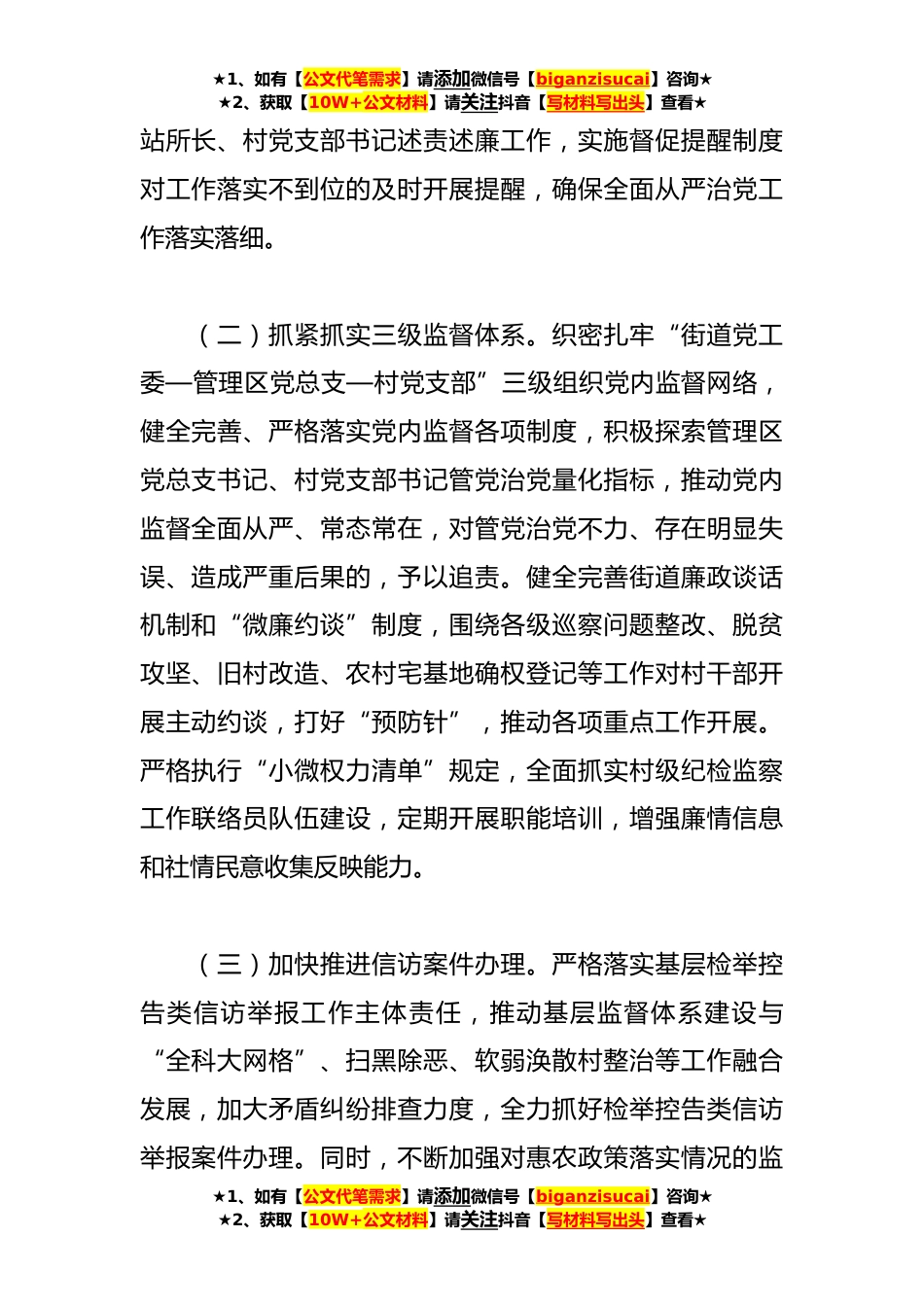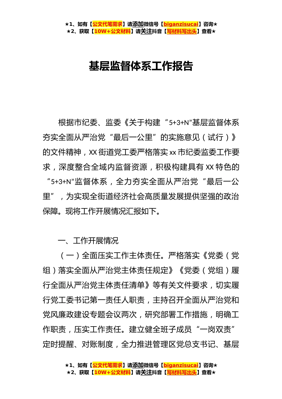 ★1、如有【公文代笔需求】请添加微信号【biganzisucai】咨询★★2、获取【10W+公文材料】请关注抖音【写材料写出头】查看★基层监督体系工作报告根据市纪委、监委《关于构建“5+3+N”基层监督体系夯实全面从严治党“最后一公里”的实施意见(试行)》的文件精神,XX街道党工委严格落实xx市纪委监委工作要求,深度整合全域内监督资源,积极构建具有XX特色的“5+3+N”监督体系,全力夯实全面从严治党“最后一公里”,为实现全街道经济社会高质量发展提供坚强的政治保障。现将工作开展情况汇报如下。一、工作开展情况(一)全面压实工作主体责任。严格落实《党委(党组)落实全面从严治党主体责任规定》《党委(党组)履行全面从严治党主体责任清单》等有关文件要求,切实履行党工委书记第一责任人职责,主持召开全...