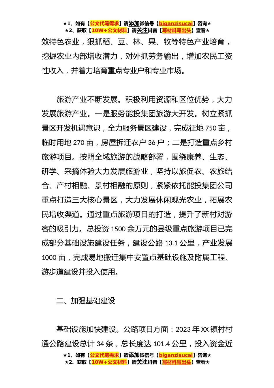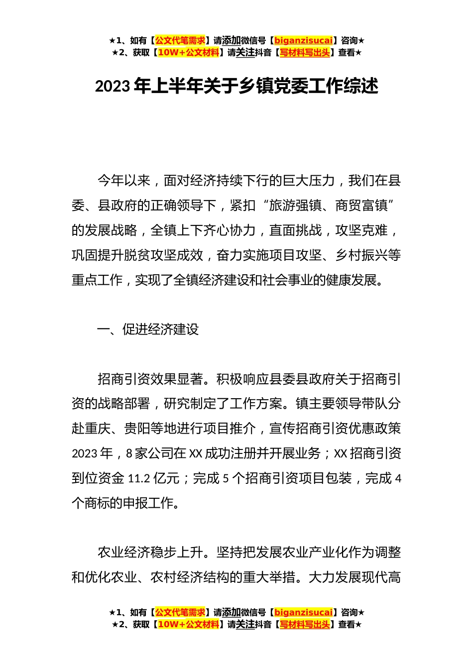 ★1、如有【公文代笔需求】请添加微信号【biganzisucai】咨询★★2、获取【10W+公文材料】请关注抖音【写材料写出头】查看★2023年上半年关于乡镇党委工作综述今年以来,面对经济持续下行的巨大压力,我们在县委、县政府的正确领导下,紧扣“旅游强镇、商贸富镇”的发展战略,全镇上下齐心协力,直面挑战,攻坚克难,巩固提升脱贫攻坚成效,奋力实施项目攻坚、乡村振兴等重点工作,实现了全镇经济建设和社会事业的健康发展。一、促进经济建设招商引资效果显著。积极响应县委县政府关于招商引资的战略部署,研究制定了工作方案。镇主要领导带队分赴重庆、贵阳等地进行项目推介,宣传招商引资优惠政策2023年,8家公司在XX成功注册并开展业务;XX招商引资到位资金11.2亿元;完成5个招商引资项目包装,完成4个商标的申...