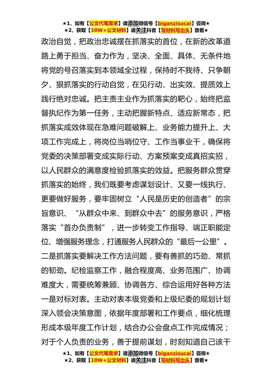 ★1、如有【公文代笔需求】请添加微信号【biganzisucai】咨询★★2、获取【10W+公文材料】请关注抖音【写材料写出头】查看★“抓落实促发展”研讨会发言:永葆真抓的实劲深抓的钻劲细抓的干劲xxx总书记多次强调,要崇尚实干、狠抓落实,如果不沉下心来抓落实,再好的蓝图,也只是镜中花、水中月。通过反复学习领悟,对照问题清单查摆差距不足,我感触很深受益匪浅。我将坚持在真抓实干中提升抓落实的能力,把好推动工作“第一关”,传好落实部署“第一棒”,跑好机关处室最先“一公里”。下面结合工作实际,汇报3点学习体会。一是抓落实要解决思想认识问题,要有真抓的实劲、敢抓的狠劲。一个“真”、一个“实”,体现的是务实态度,要求的是实在举措;一个“敢”、一个“狠”,体现的是勇气魄力,要求的是责任担...