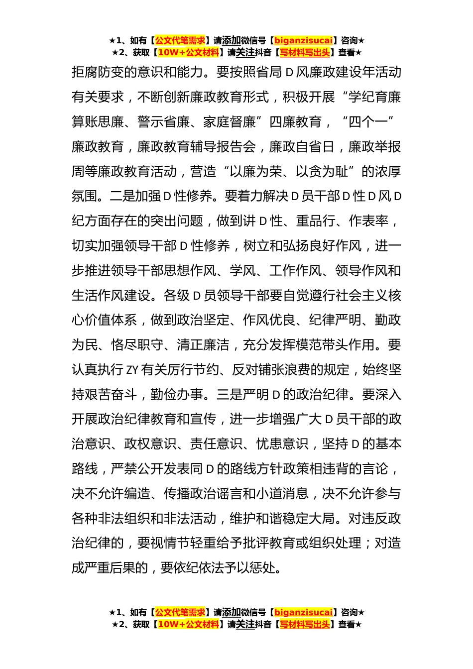 ★1、如有【公文代笔需求】请添加微信号【biganzisucai】咨询★★2、获取【10W+公文材料】请关注抖音【写材料写出头】查看★2023年X局长在加大力度深入推进全局D风廉政建设和反腐败工作会议上的讲话同志们:今年以来,我们在干好交通事业的同时,坚持标本兼治、综合治理、惩防并举、注重预防的方针,以完善惩治和预防腐败体系为重点加强反腐倡廉建设,以D风廉政建设和反腐败斗争的新成效为改革发展稳定提供坚强保证,做出了积极的贡献。现在,为了拒腐防变深化工作开展,我讲几点意见:一、牢牢把握“教育”这个惩治和预防腐败的基础环节,建立健全廉政预防机制。加强D风廉政教育,抓好廉洁自律工作,在反腐倡廉建设中居于十分重要的地位,是一项基础性工作。一是抓好廉政教育。要通过广泛开展示范教育、警示教育...