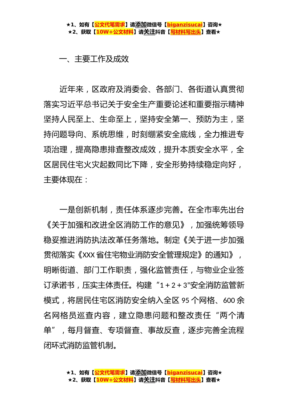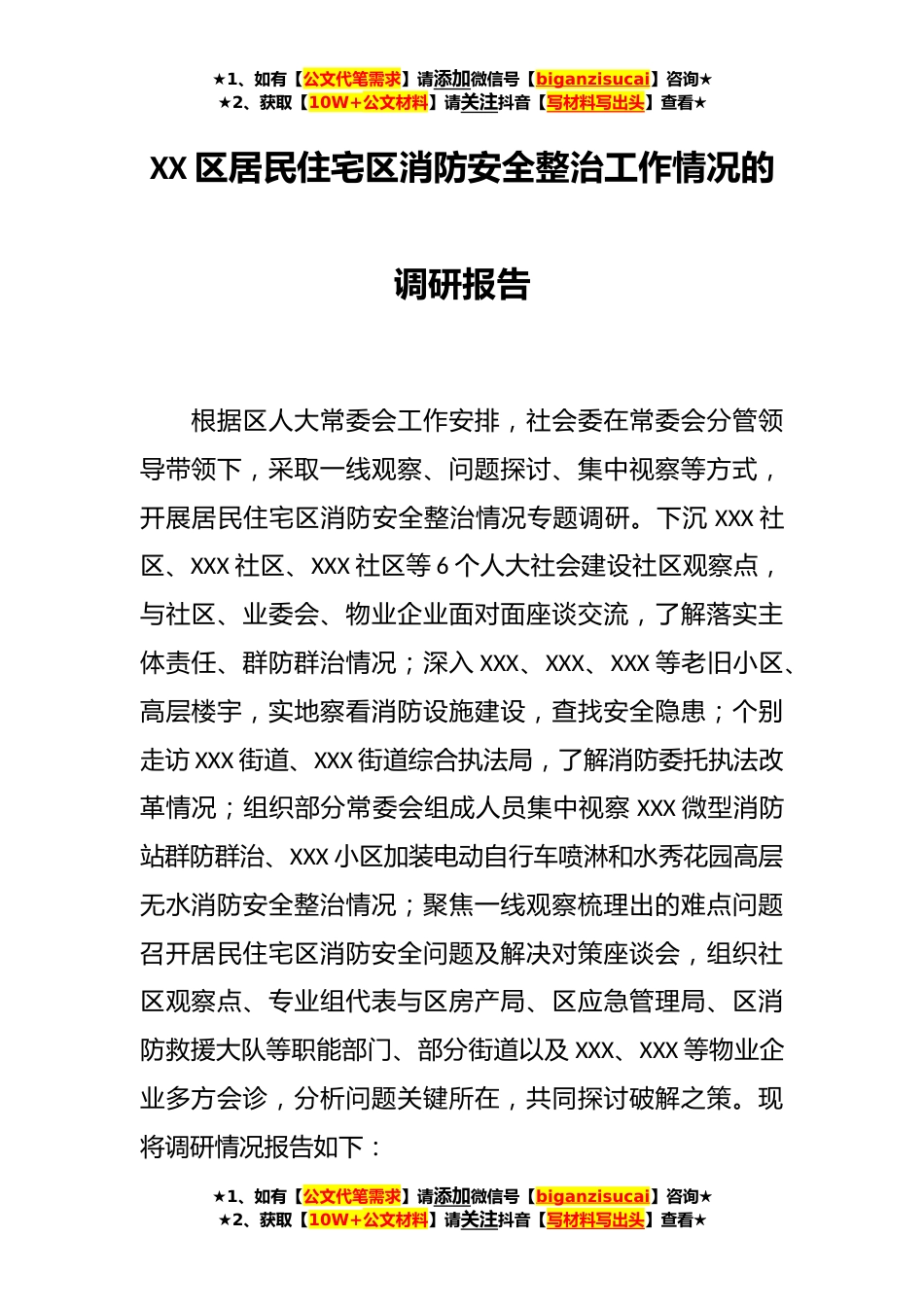 ★1、如有【公文代笔需求】请添加微信号【biganzisucai】咨询★★2、获取【10W+公文材料】请关注抖音【写材料写出头】查看★XX区居民住宅区消防安全整治工作情况的调研报告根据区人大常委会工作安排,社会委在常委会分管领导带领下,采取一线观察、问题探讨、集中视察等方式,开展居民住宅区消防安全整治情况专题调研。下沉XXX社区、XXX社区、XXX社区等6个人大社会建设社区观察点,与社区、业委会、物业企业面对面座谈交流,了解落实主体责任、群防群治情况;深入XXX、XXX、XXX等老旧小区、高层楼宇,实地察看消防设施建设,查找安全隐患;个别走访XXX街道、XXX街道综合执法局,了解消防委托执法改革情况;组织部分常委会组成人员集中视察XXX微型消防站群防群治、XXX小区加装电动自行车喷淋和水秀花园高层无水消防...