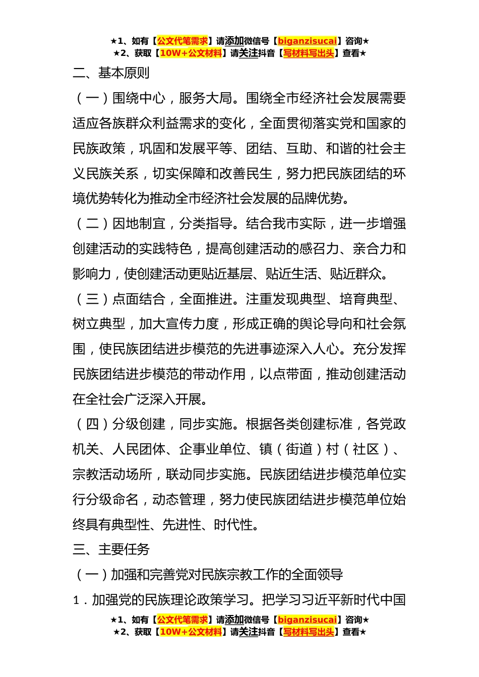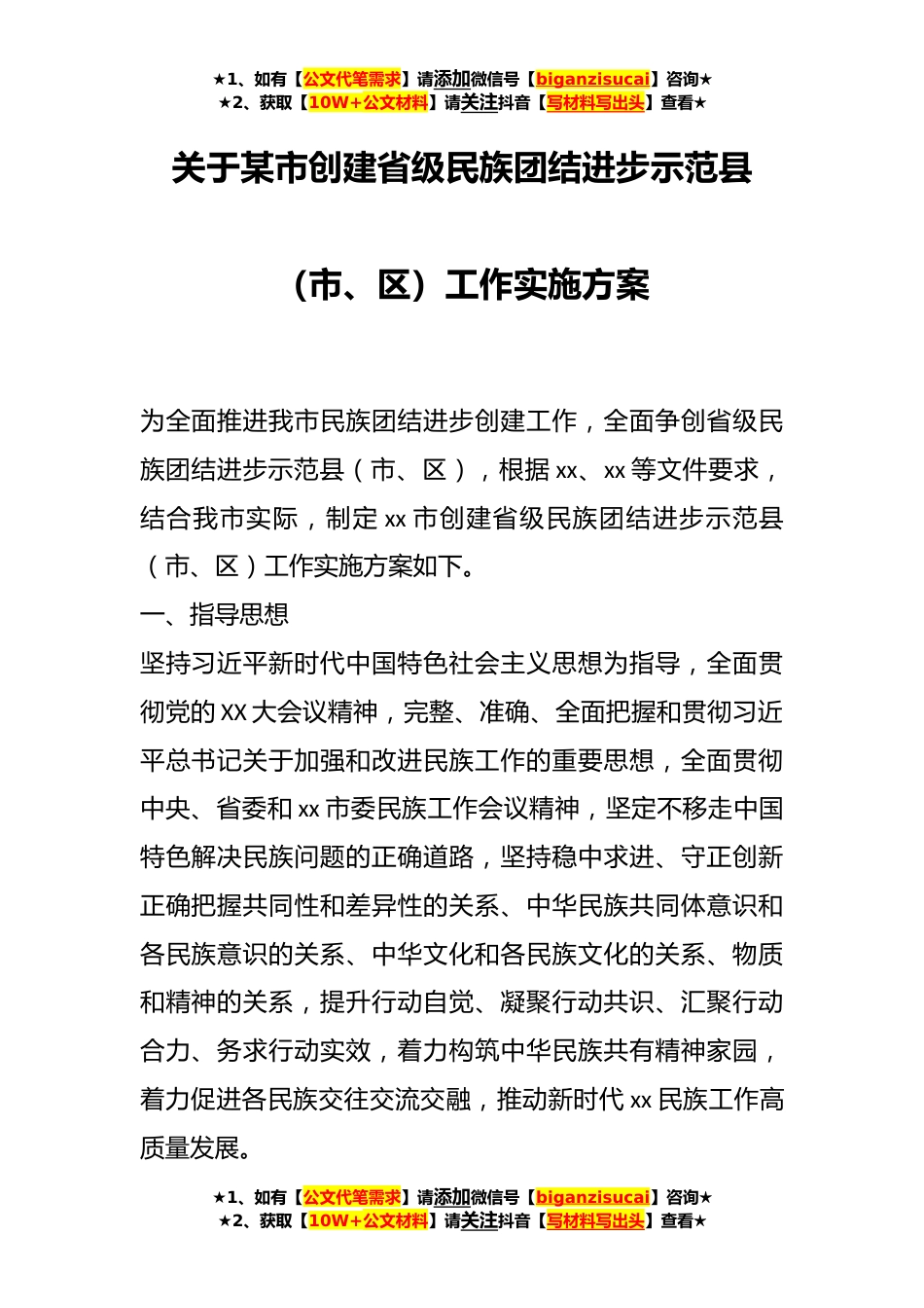 ★1、如有【公文代笔需求】请添加微信号【biganzisucai】咨询★★2、获取【10W+公文材料】请关注抖音【写材料写出头】查看★关于某市创建省级民族团结进步示范县(市、区)工作实施方案为全面推进我市民族团结进步创建工作,全面争创省级民族团结进步示范县(市、区),根据xx、xx等文件要求,结合我市实际,制定xx市创建省级民族团结进步示范县(市、区)工作实施方案如下。一、指导思想坚持习近平新时代中国特色社会主义思想为指导,全面贯彻党的XX大会议精神,完整、准确、全面把握和贯彻习近平总书记关于加强和改进民族工作的重要思想,全面贯彻中央、省委和xx市委民族工作会议精神,坚定不移走中国特色解决民族问题的正确道路,坚持稳中求进、守正创新正确把握共同性和差异性的关系、中华民族共同体意识和各...