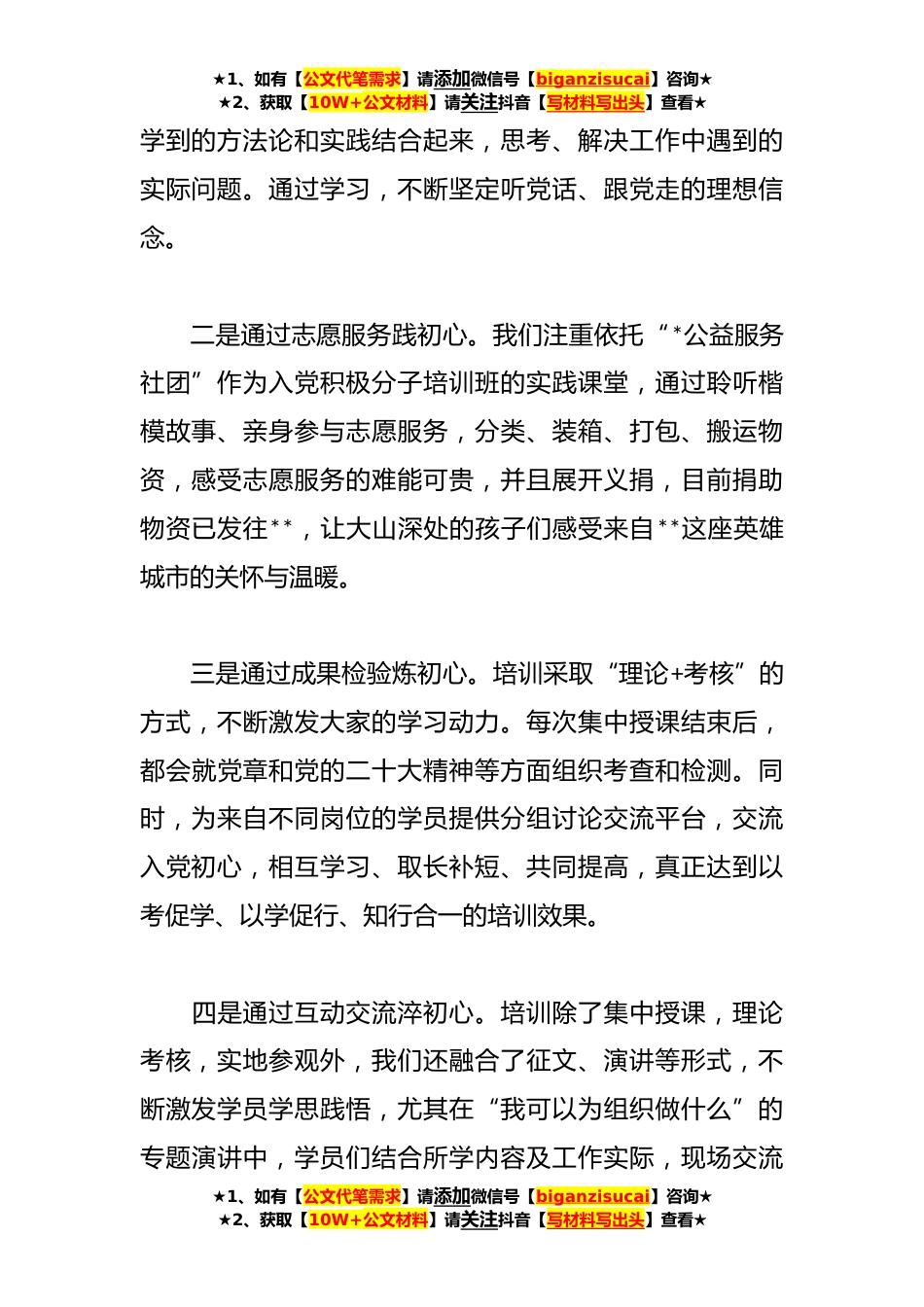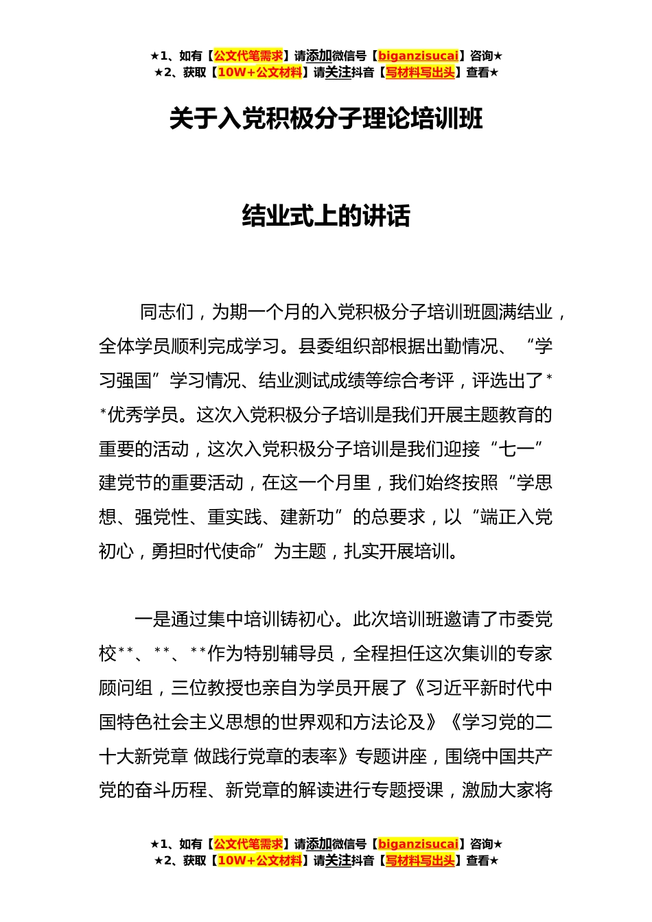 ★1、如有【公文代笔需求】请添加微信号【biganzisucai】咨询★★2、获取【10W+公文材料】请关注抖音【写材料写出头】查看★关于入党积极分子理论培训班结业式上的讲话同志们,为期一个月的入党积极分子培训班圆满结业,全体学员顺利完成学习。县委组织部根据出勤情况、“学习强国”学习情况、结业测试成绩等综合考评,评选出了**优秀学员。这次入党积极分子培训是我们开展主题教育的重要的活动,这次入党积极分子培训是我们迎接“七一”建党节的重要活动,在这一个月里,我们始终按照“学思想、强党性、重实践、建新功”的总要求,以“端正入党初心,勇担时代使命”为主题,扎实开展培训。一是通过集中培训铸初心。此次培训班邀请了市委党校**、**、**作为特别辅导员,全程担任这次集训的专家顾问组,三位教授也...