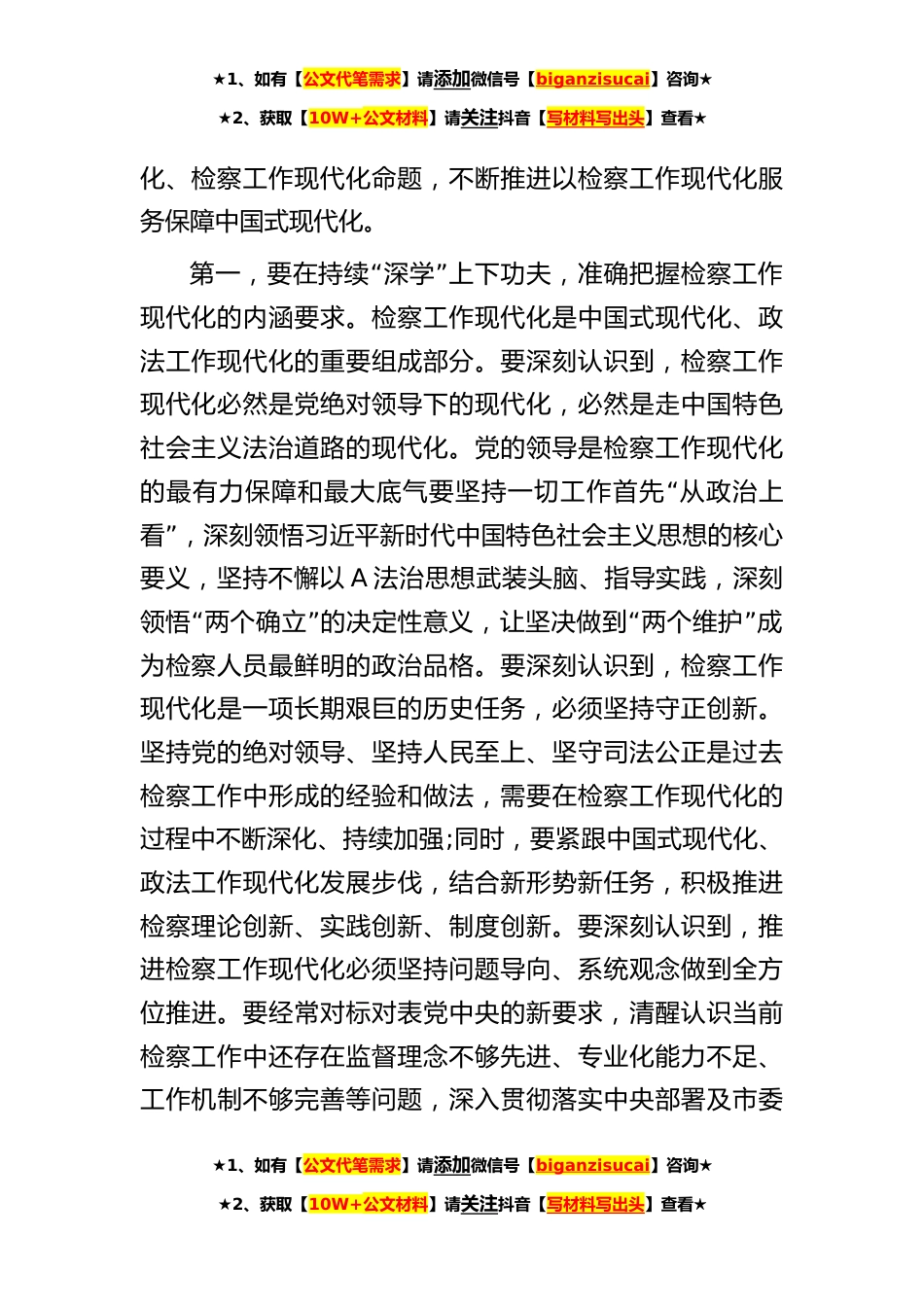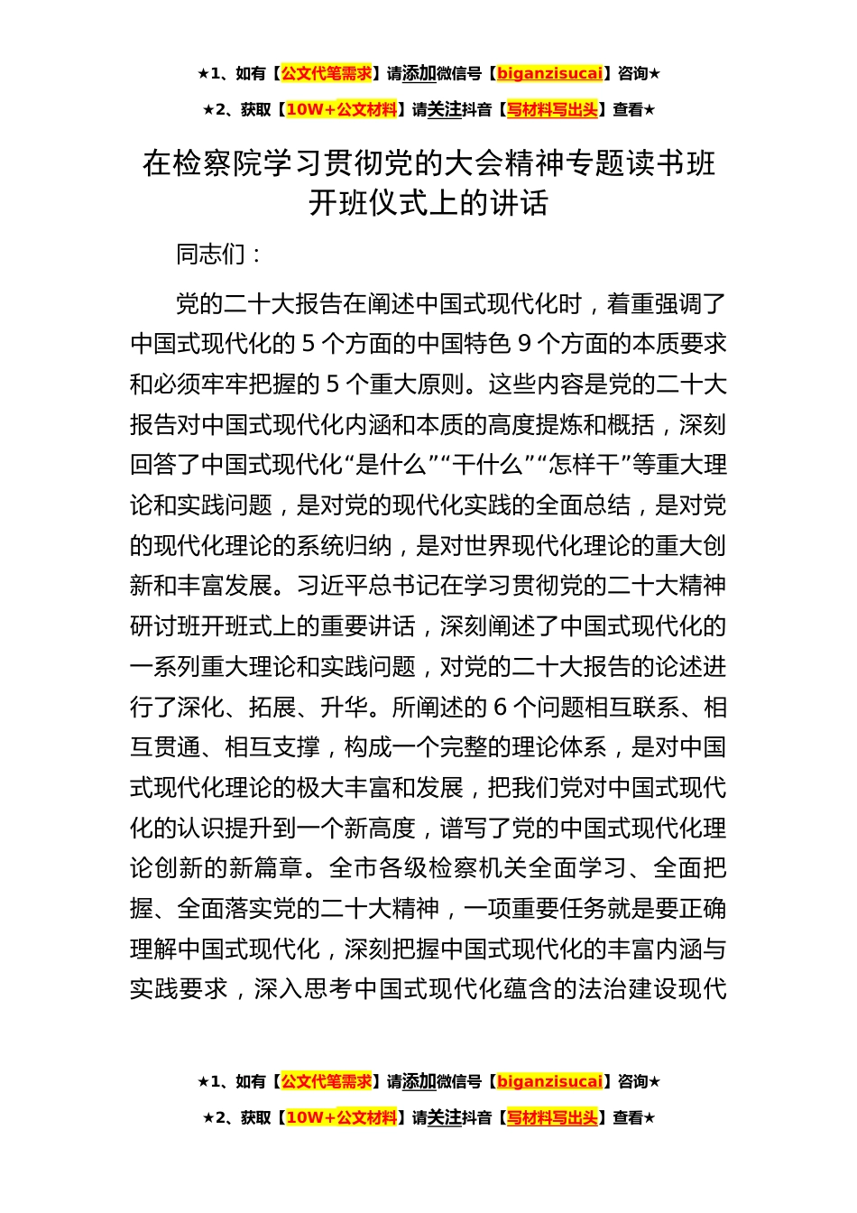 ★1、如有【公文代笔需求】请添加微信号【biganzisucai】咨询★★2、获取【10W+公文材料】请关注抖音【写材料写出头】查看★在检察院学习贯彻党的大会精神专题读书班开班仪式上的讲话同志们:党的二十大报告在阐述中国式现代化时,着重强调了中国式现代化的5个方面的中国特色9个方面的本质要求和必须牢牢把握的5个重大原则。这些内容是党的二十大报告对中国式现代化内涵和本质的高度提炼和概括,深刻“”“”“”回答了中国式现代化是什么干什么怎样干等重大理论和实践问题,是对党的现代化实践的全面总结,是对党的现代化理论的系统归纳,是对世界现代化理论的重大创新和丰富发展。习近平总书记在学习贯彻党的二十大精神研讨班开班式上的重要讲话,深刻阐述了中国式现代化的一系列重大理论和实践问题,对党的二十...