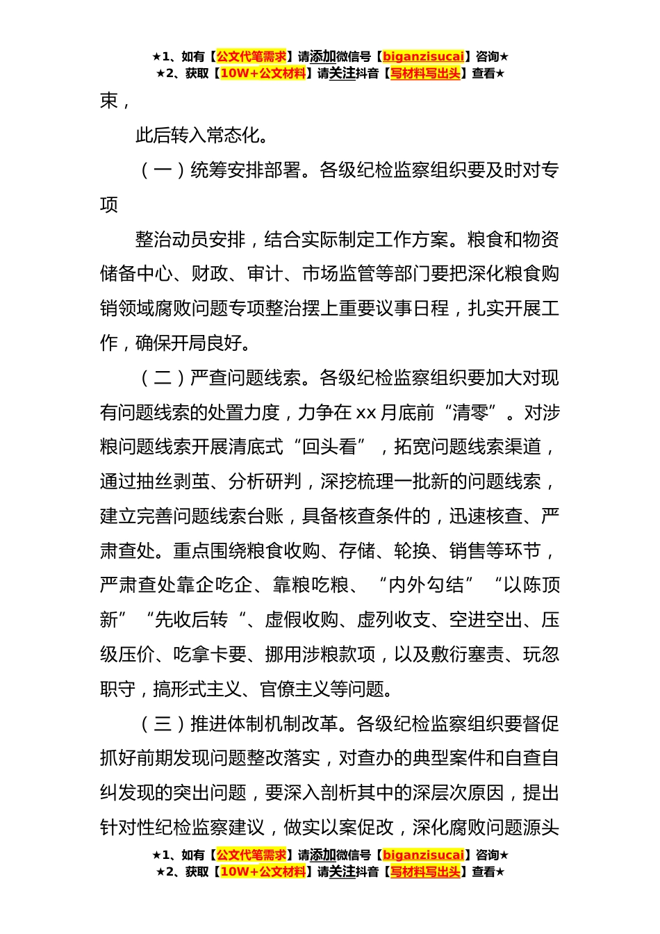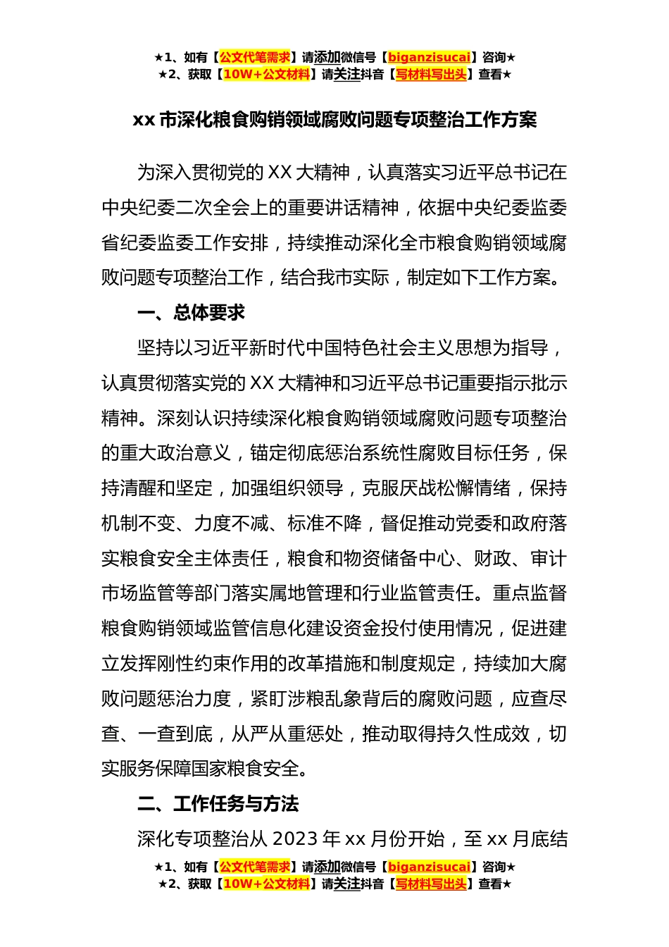 ★1、如有【公文代笔需求】请添加微信号【biganzisucai】咨询★★2、获取【10W+公文材料】请关注抖音【写材料写出头】查看★xx市深化粮食购销领域腐败问题专项整治工作方案为深入贯彻党的XX大精神,认真落实习近平总书记在中央纪委二次全会上的重要讲话精神,依据中央纪委监委省纪委监委工作安排,持续推动深化全市粮食购销领域腐败问题专项整治工作,结合我市实际,制定如下工作方案。一、总体要求坚持以习近平新时代中国特色社会主义思想为指导,认真贯彻落实党的XX大精神和习近平总书记重要指示批示精神。深刻认识持续深化粮食购销领域腐败问题专项整治的重大政治意义,锚定彻底惩治系统性腐败目标任务,保持清醒和坚定,加强组织领导,克服厌战松懈情绪,保持机制不变、力度不减、标准不降,督促推动党委和政...