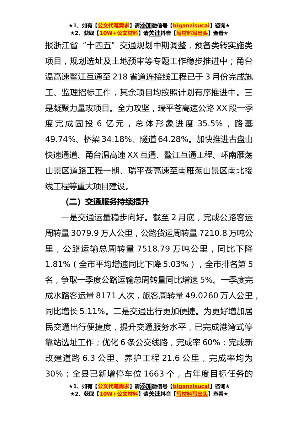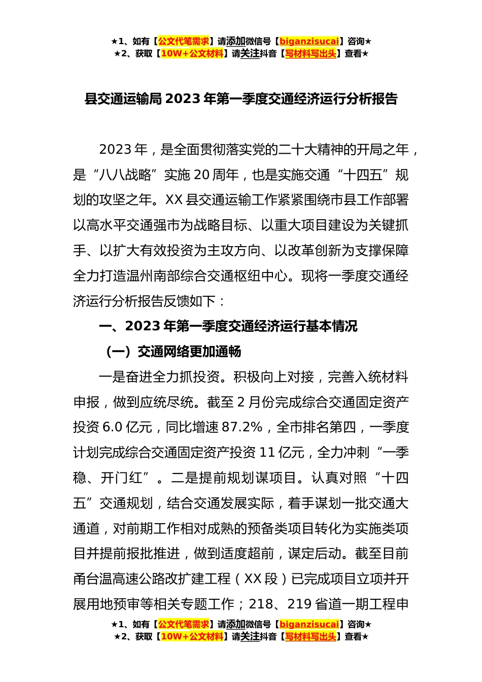 ★1、如有【公文代笔需求】请添加微信号【biganzisucai】咨询★★2、获取【10W+公文材料】请关注抖音【写材料写出头】查看★县交通运输局2023年第一季度交通经济运行分析报告2023年,是全面贯彻落实党的二十大精神的开局之年,是“八八战略”实施20周年,也是实施交通“十四五”规划的攻坚之年。XX县交通运输工作紧紧围绕市县工作部署以高水平交通强市为战略目标、以重大项目建设为关键抓手、以扩大有效投资为主攻方向、以改革创新为支撑保障全力打造温州南部综合交通枢纽中心。现将一季度交通经济运行分析报告反馈如下:一、2023年第一季度交通经济运行基本情况(一)交通网络更加通畅一是奋进全力抓投资。积极向上对接,完善入统材料申报,做到应统尽统。截至2月份完成综合交通固定资产投资6.0亿元,同比增速87....