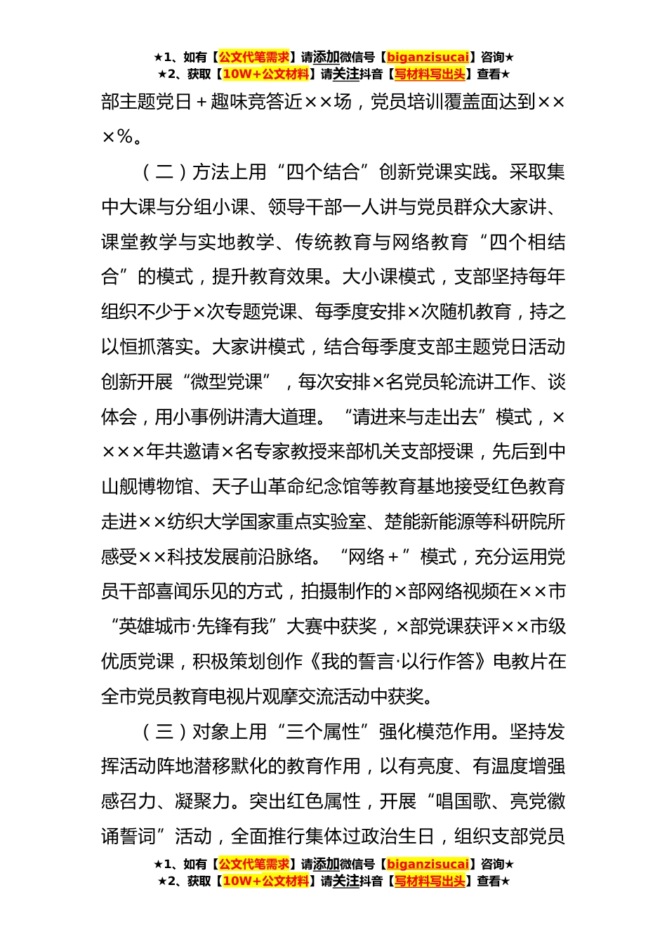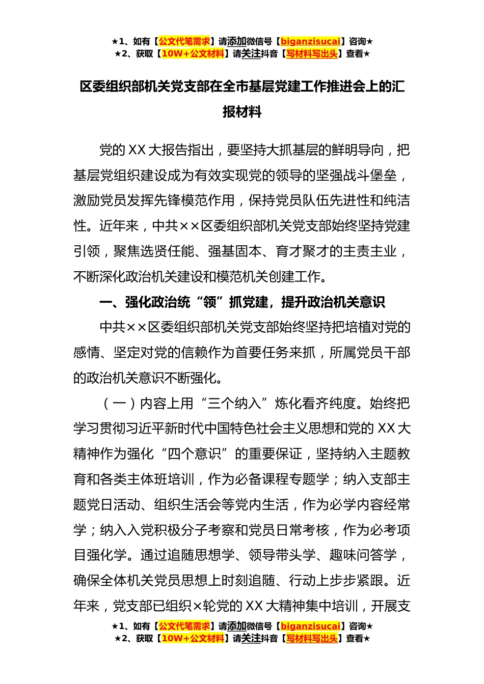 ★1、如有【公文代笔需求】请添加微信号【biganzisucai】咨询★★2、获取【10W+公文材料】请关注抖音【写材料写出头】查看★区委组织部机关党支部在全市基层党建工作推进会上的汇报材料党的XX大报告指出,要坚持大抓基层的鲜明导向,把基层党组织建设成为有效实现党的领导的坚强战斗堡垒,激励党员发挥先锋模范作用,保持党员队伍先进性和纯洁性。近年来,中共××区委组织部机关党支部始终坚持党建引领,聚焦选贤任能、强基固本、育才聚才的主责主业,不断深化政治机关建设和模范机关创建工作。一、强化政治统“领”抓党建,提升政治机关意识中共××区委组织部机关党支部始终坚持把培植对党的感情、坚定对党的信赖作为首要任务来抓,所属党员干部的政治机关意识不断强化。(一)内容上用“三个纳入”炼化看齐纯...